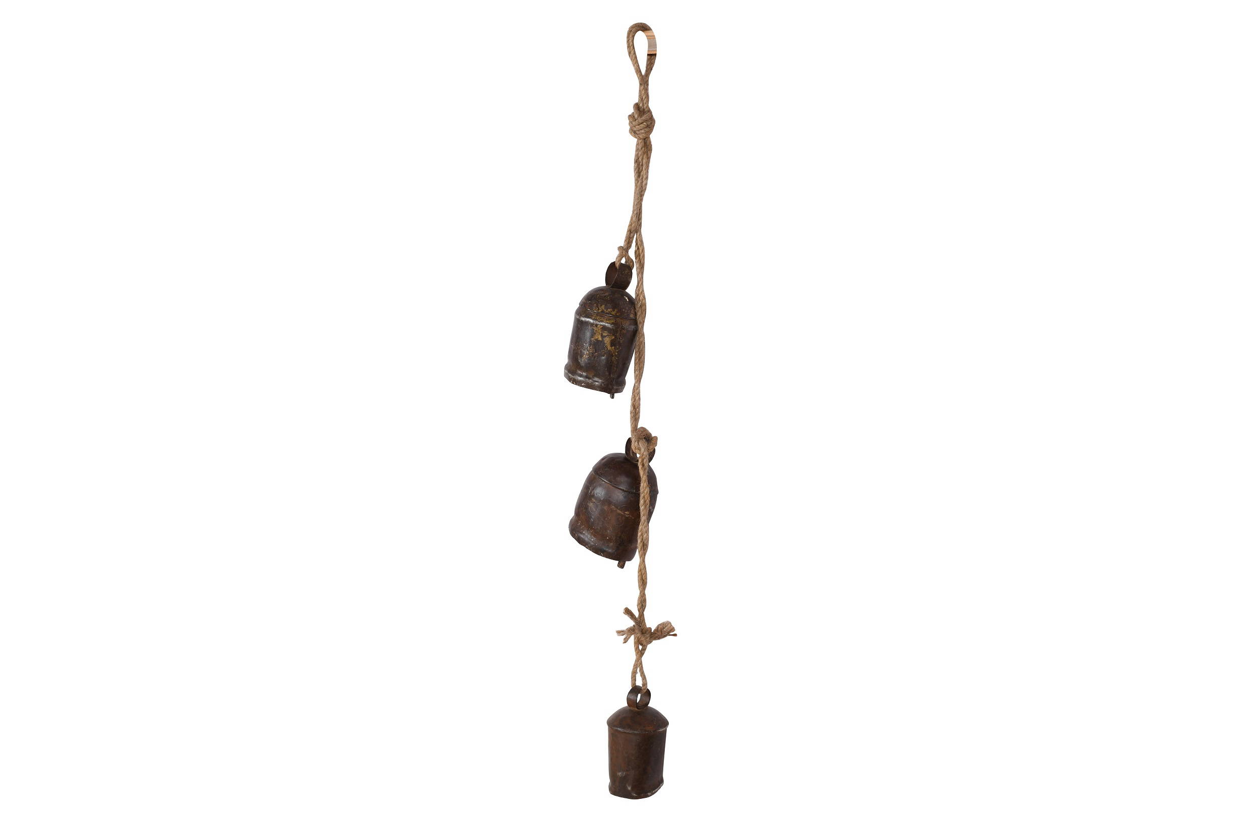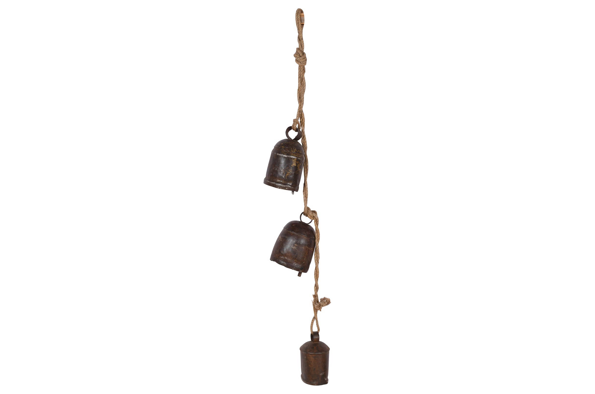 Set of antique Indian repurposed iron cow bells, strung on a strong jute rope to make a fantastic wind chime. Using three large cow bells, we have created the perfect environmental wind chime, by combining the properties and purpose of these old cow bells, many of which are nearly 100 years old, to grace any front door, garden, patio or terrace. These Bells were commonly made from various metals such as bronze, copper, iron, or brass due to their resonant properties. The metals produced clear and melodious tones when struck. In some cultures, bells were believed to have protective and spiritual properties. Wind chimes made of bells were hung near doorways or windows to ward off evil spirits or negative energies. Dimensions: Width 20cm x Depth 13cm x Height 95cm.