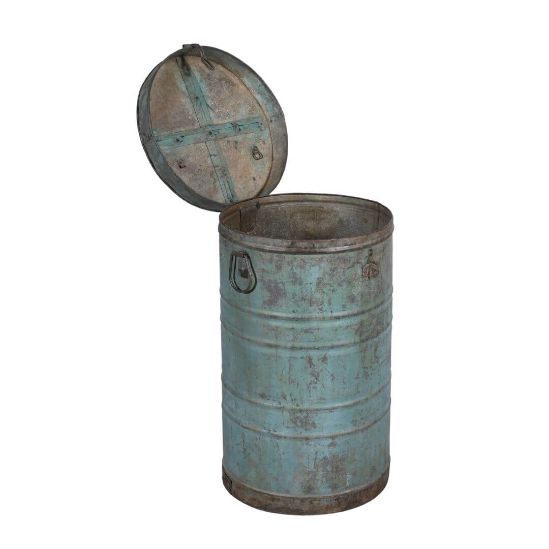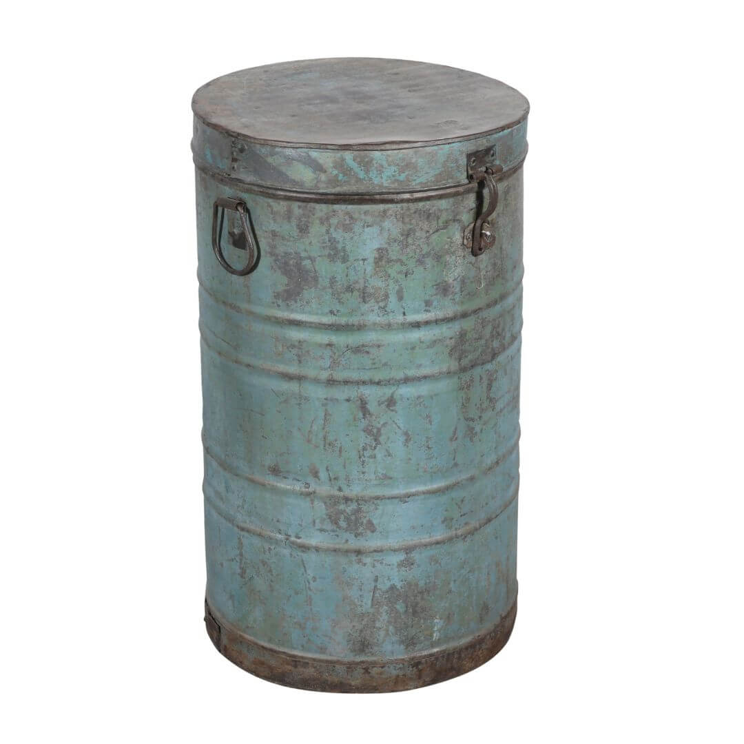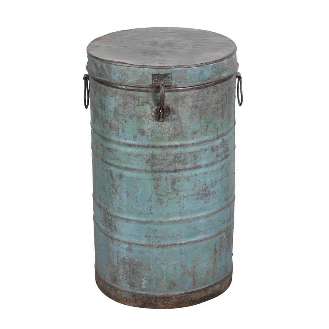 This lovely old original Indian iron metal storage canister has a fully working lid and clasp. Originally used to store rice or grain, it boasts a wonderful patina reflecting its age and character.