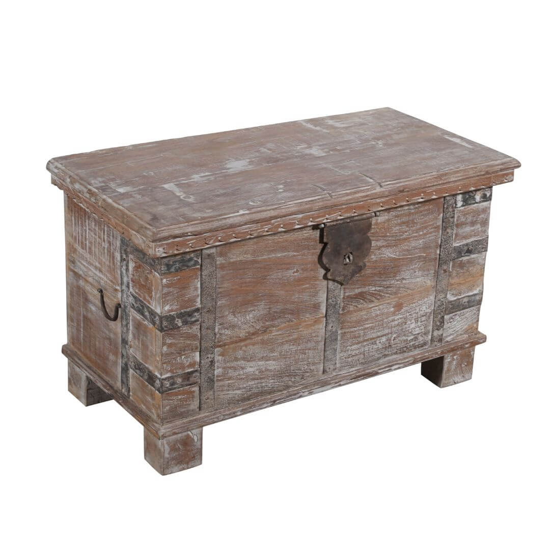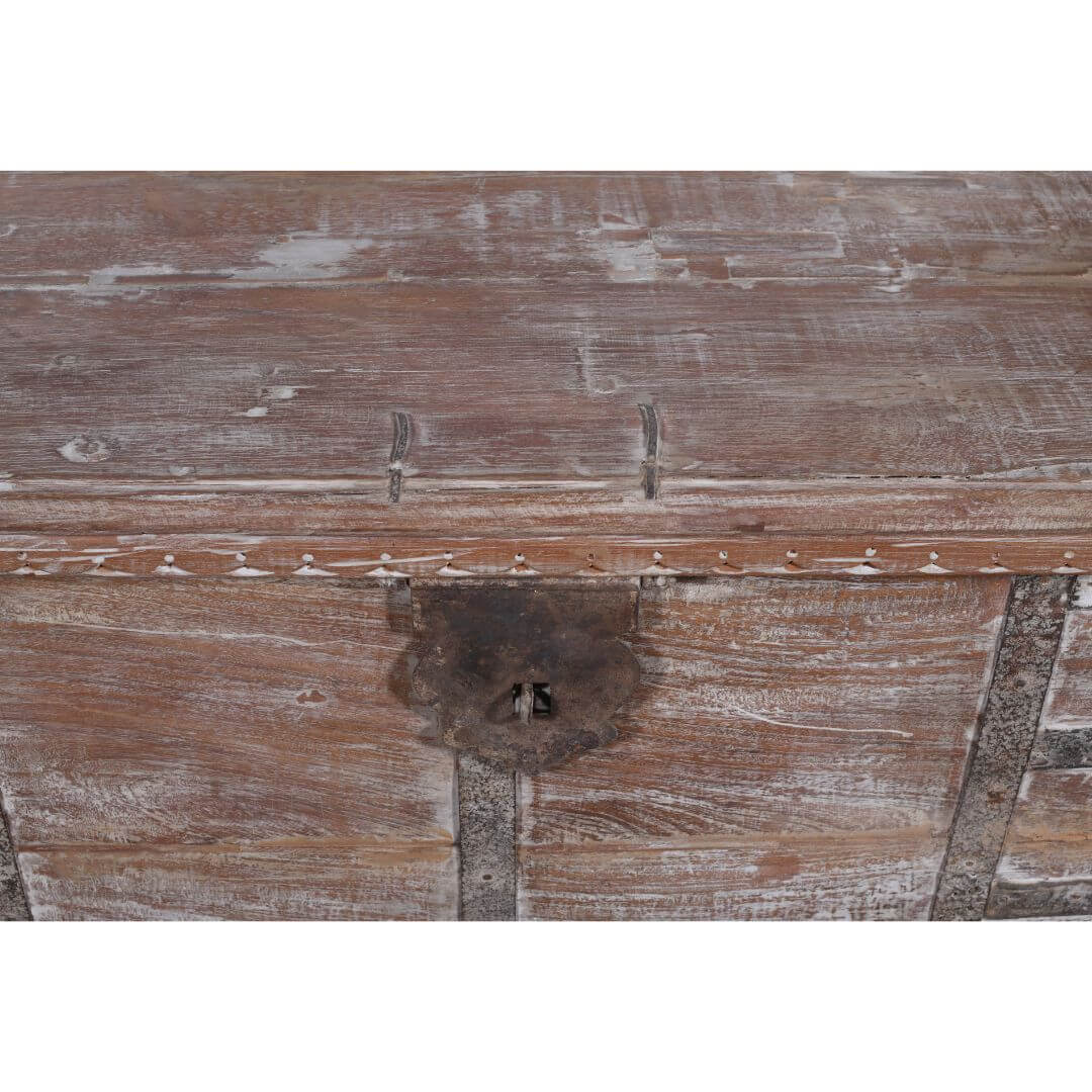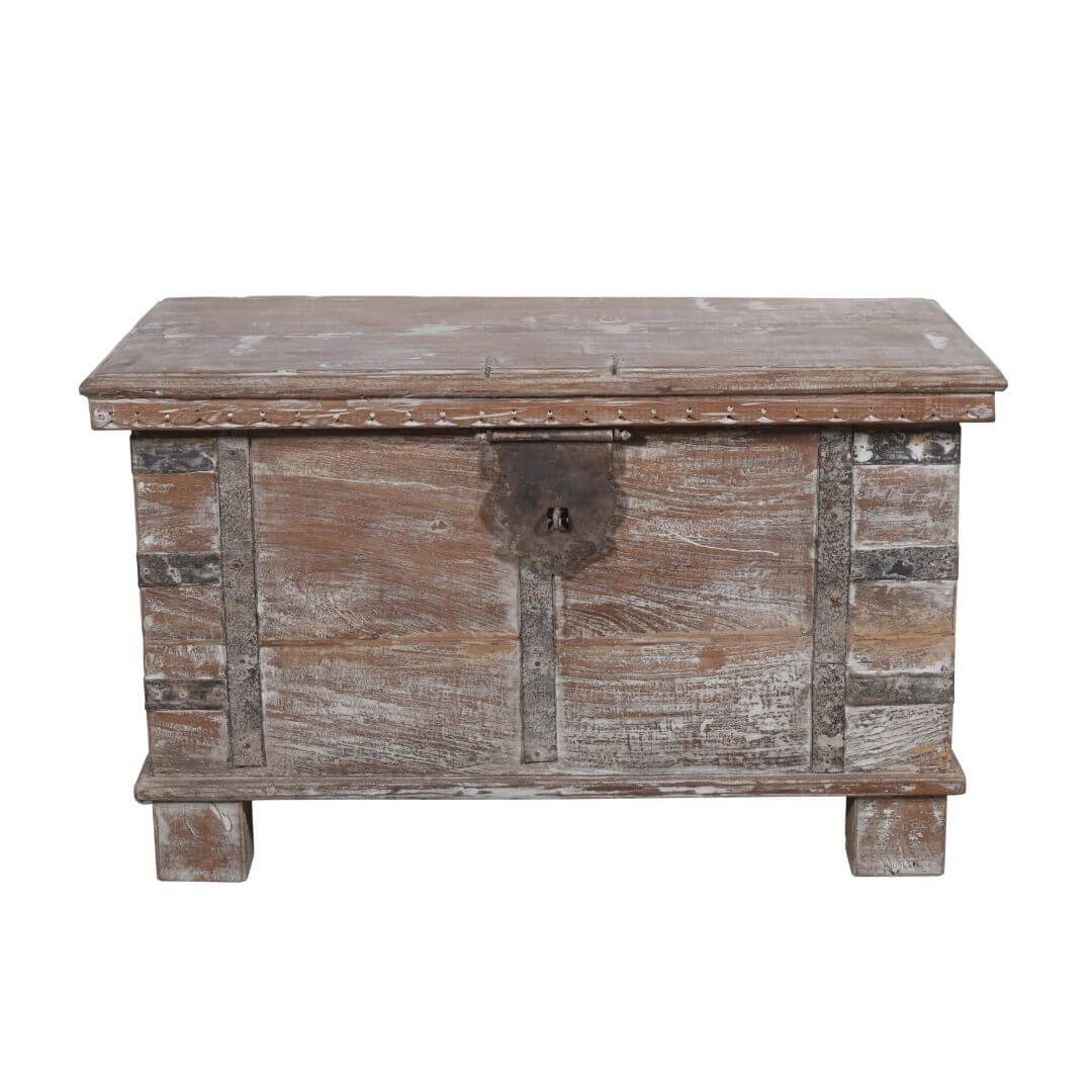 Custom-made by the head of a family in Gujarat State during the Victorian era, this chest was originally used to store valuables such as textiles, jewellery, dowry, and cash. Secured with strong padlocks for maximum security, it reflects the cultural diversity and craftsmanship of India. Today, it serves as a functional coffee table while doubling as a storage box for magazines, books, or other household items.