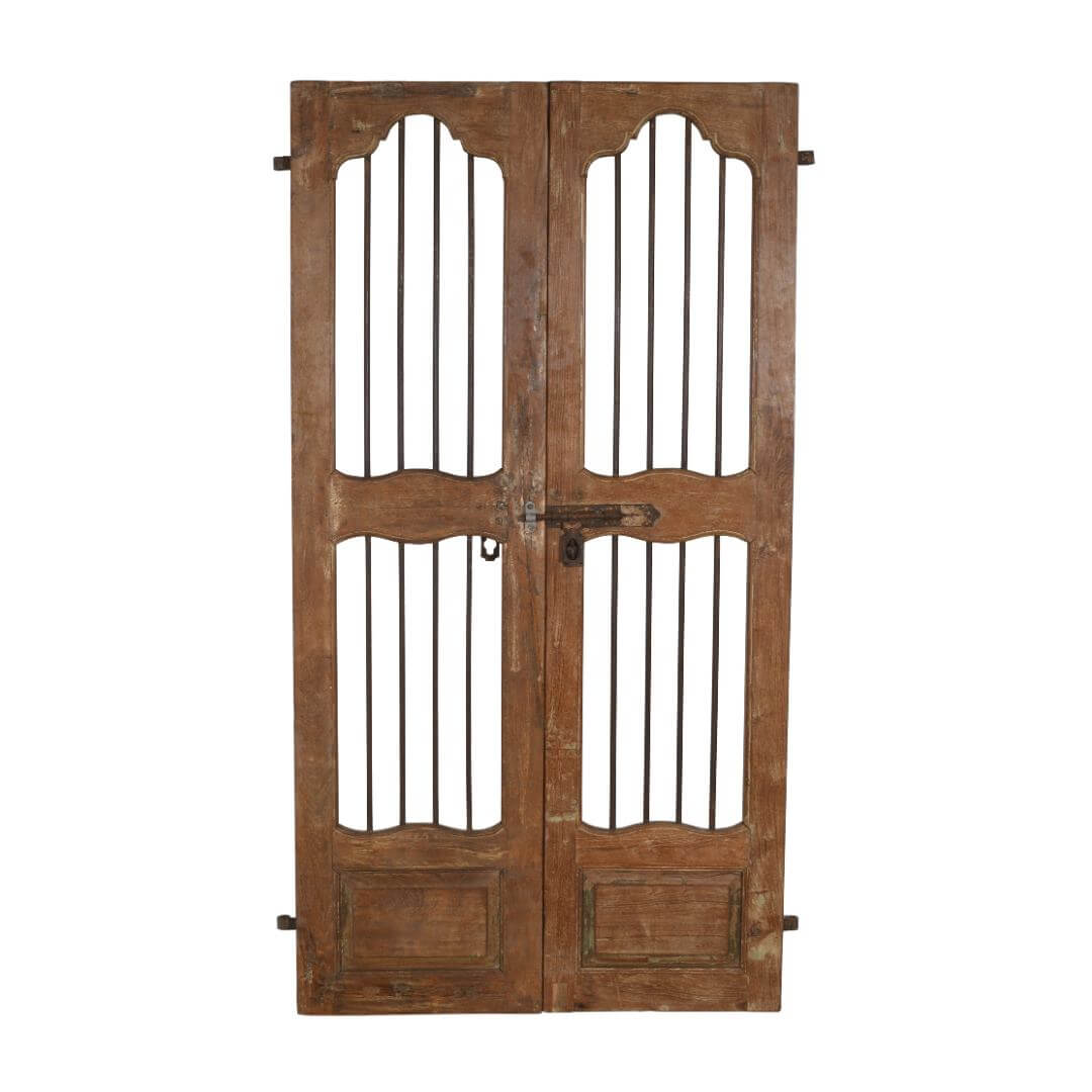 This exquisite pair of antique Indian teak wood and iron Jali doors dates back to the late 19th century (c.1880-1900). Salvaged from a historic building in Gujarat, India, these doors feature intricate iron latticework (Jali design) and original heavy-duty locks and bolts, showcasing their functional and aesthetic appeal. Traditionally used as a security measure while allowing air circulation, these doors are rich in history and patina built over centuries.
