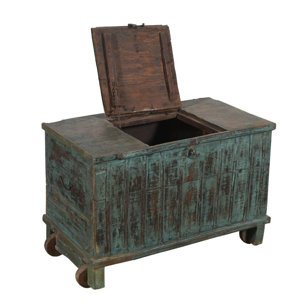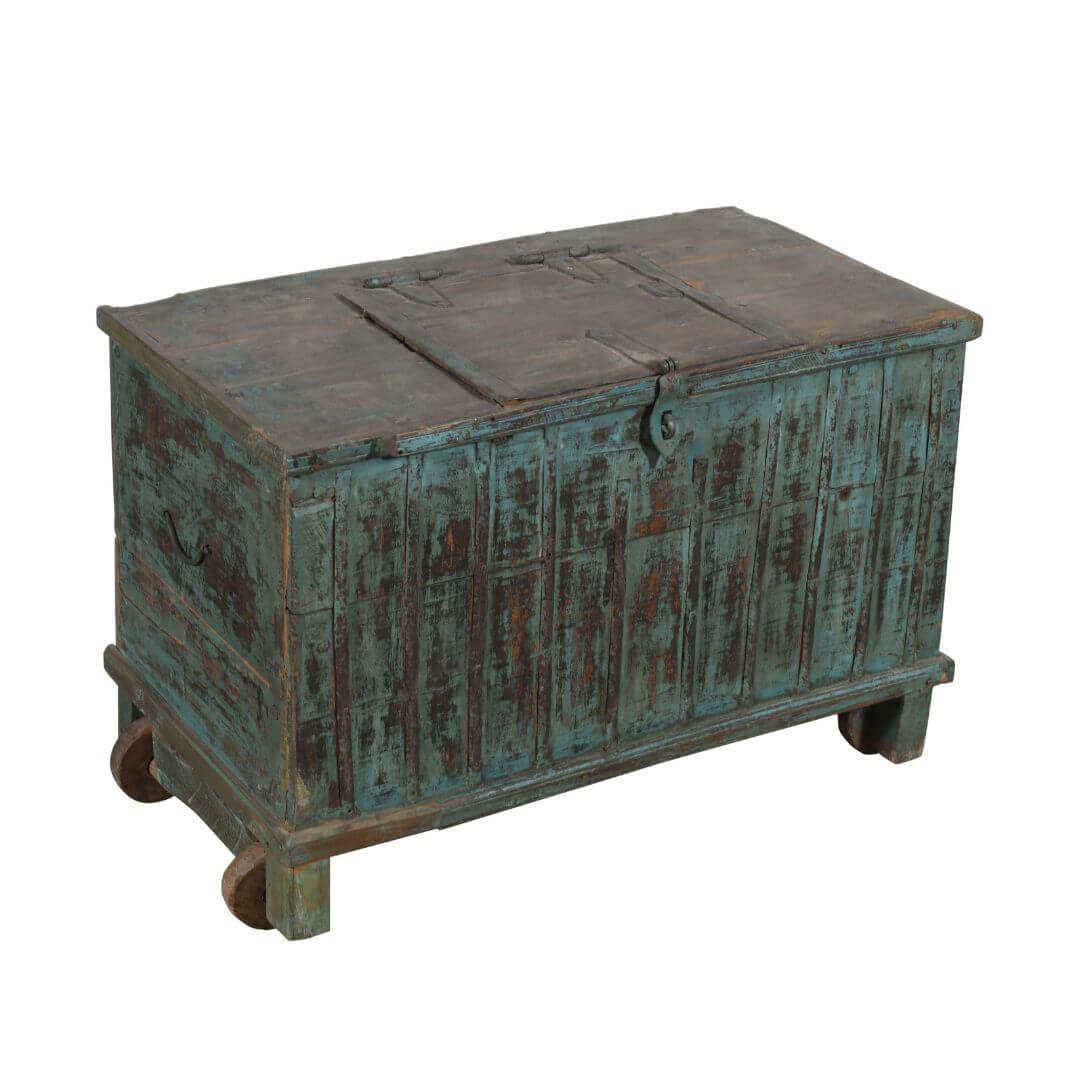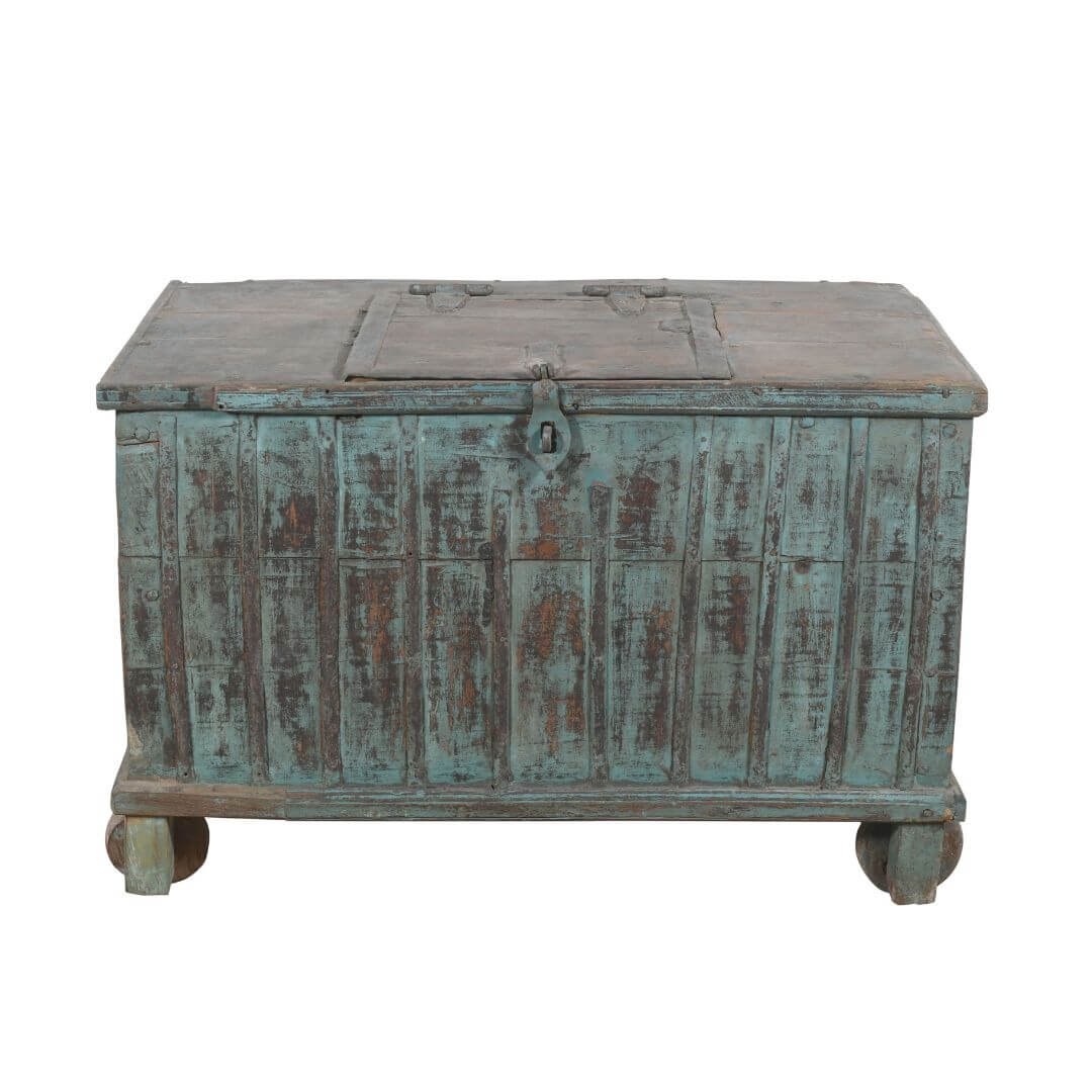 In Gujarat State during the Victorian era, chests like this were custom-made to store valuables such as textiles, jewellery, dowry, and cash, secured with strong padlocks. This chest is the perfect height and depth for a coffee table and doubles as a storage box for magazines, newspapers, and books. Makes for a great hall storage bench too.