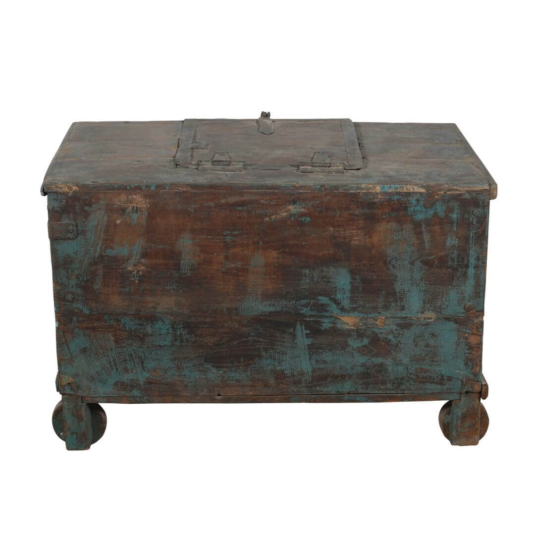 This rustic antique Indian teak wood Quarter Surti chest was crafted in the 19th century from thick teak wood and reinforced with iron and brass binding for extra strength. Retaining its original blue painted finish, this chest showcases its rich history and character.