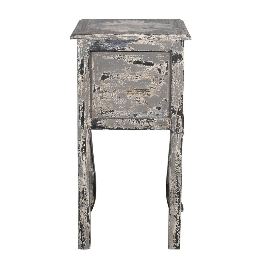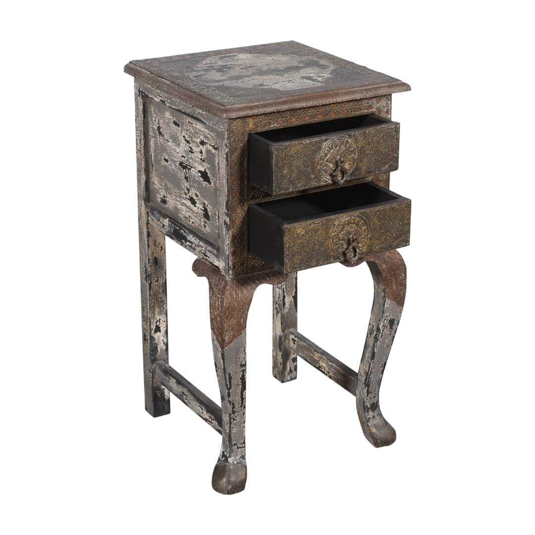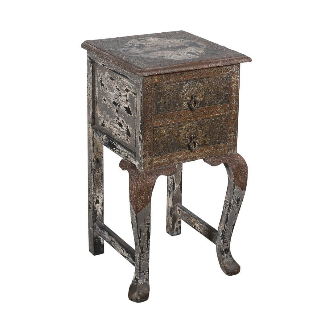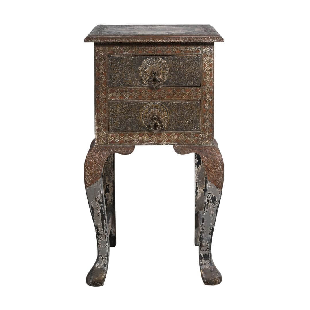 This exquisite antique Indian teak wood bedside cabinet, crafted in Rajasthan in the early 1920s, is a timeless piece of furniture. Featuring intricate brass inlay work, beautiful carvings, and a rich patina with remnants of original paint, this cabinet is both functional and decorative. It includes two spacious drawers, making it ideal as a bedside table, side table, or occasional table.