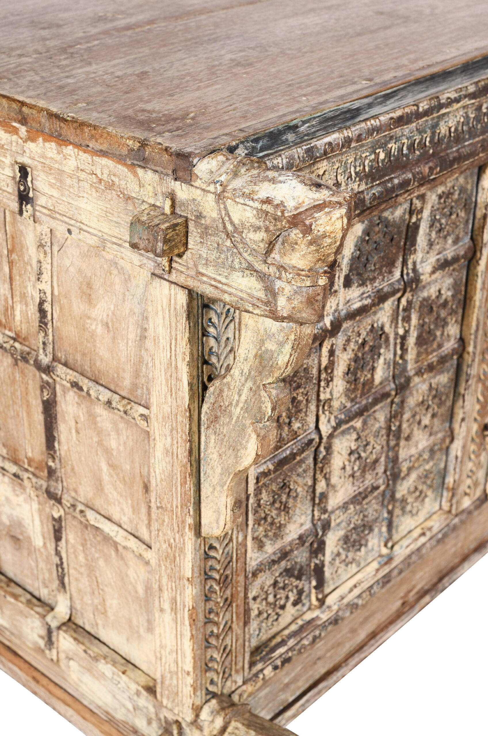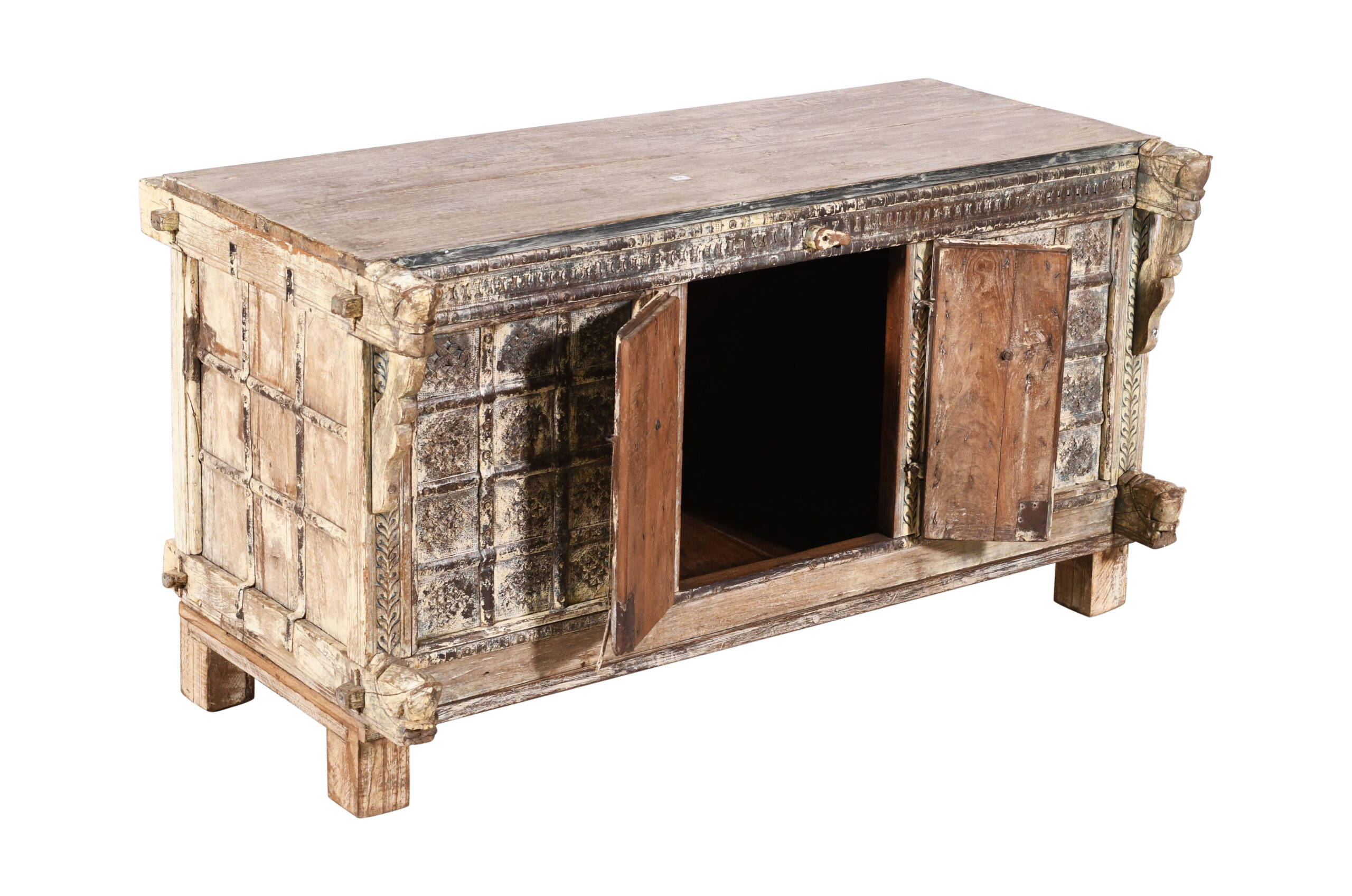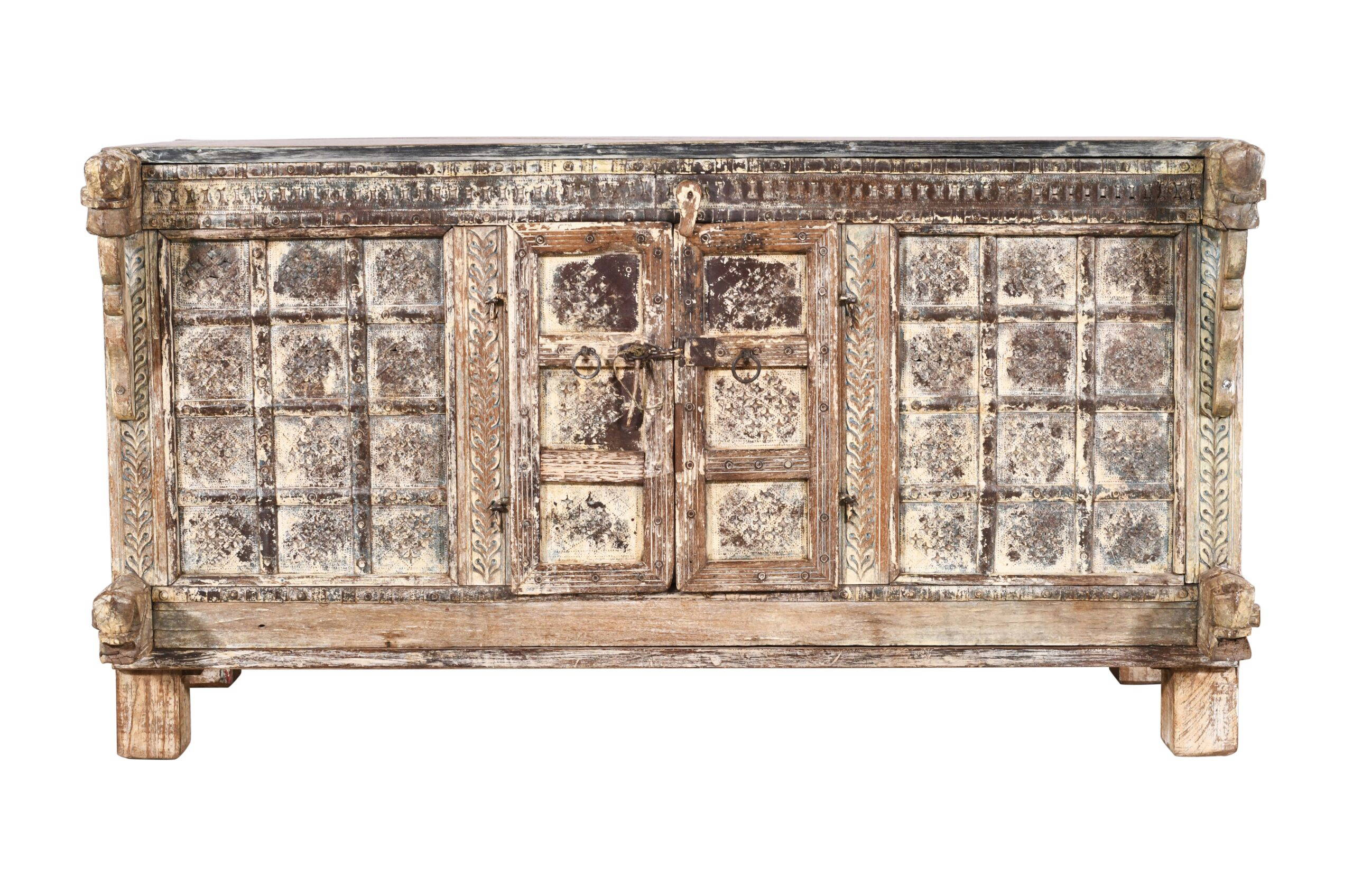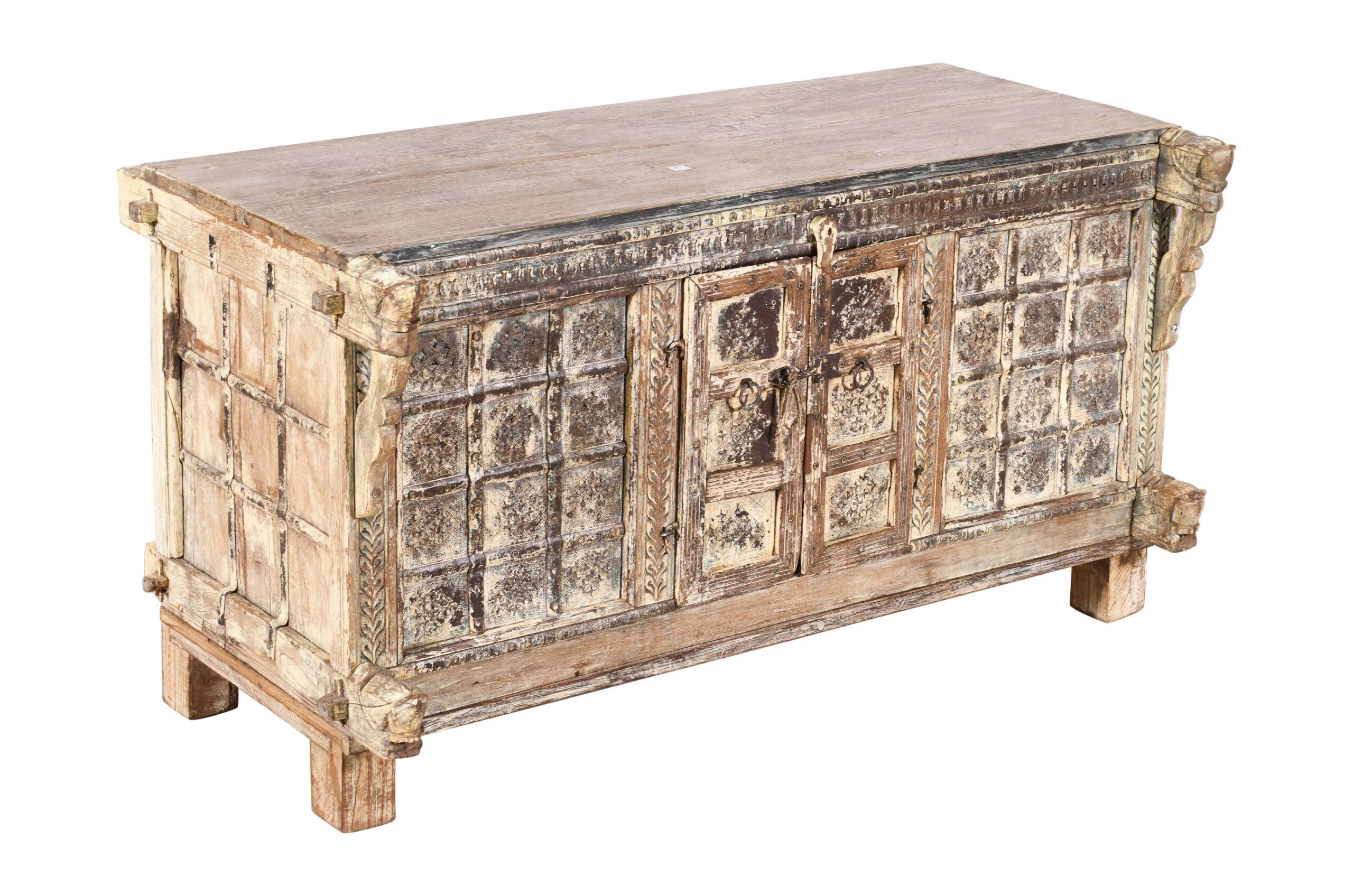 A traditional Indian sideboard is known as a Damchiya, or Dowry Chest. This antique patinated cream coloured teak Dowry Chest is called a majus in Hindi. Traditionally the bride’s family had to offer gifts known as dowry to the bridegroom’s family if they were to find a good husband for their daughter. Dowry was normally gold jewellery and silk saris, but sometimes brass cooking pots and other family treasures were exchanged. A horse bracket frames each upper and lower corner of the Chest and there is significant remains of old cream paint on this example from the nineteenth century, which makes for a beautiful antique piece. It also has two large doors for entry in to the storage area. Indian Damchiya Chests are usually rustic, carved or painted, and most of our pieces are from Rajasthan & Gujarat in western India. All of our Damchiya Chests are original antiques and made from hard teak wood. Some minor restoration may have been required to ensure the Chest reaches you in original but fully functional solid condition. This Damchiya or Indian hope chest is an old piece and there are some historic repairs and age related marks and wear and tear as you would expect. Today the chests are used as sideboards, consoles, drinks cabinets or beautiful storage units. This is a unique one of piece which was made by hand many years ago and has stunning hand carved detailing, and a lovely patina which really shows its age and history. Please be sure to check all photos as these form part of the description.
