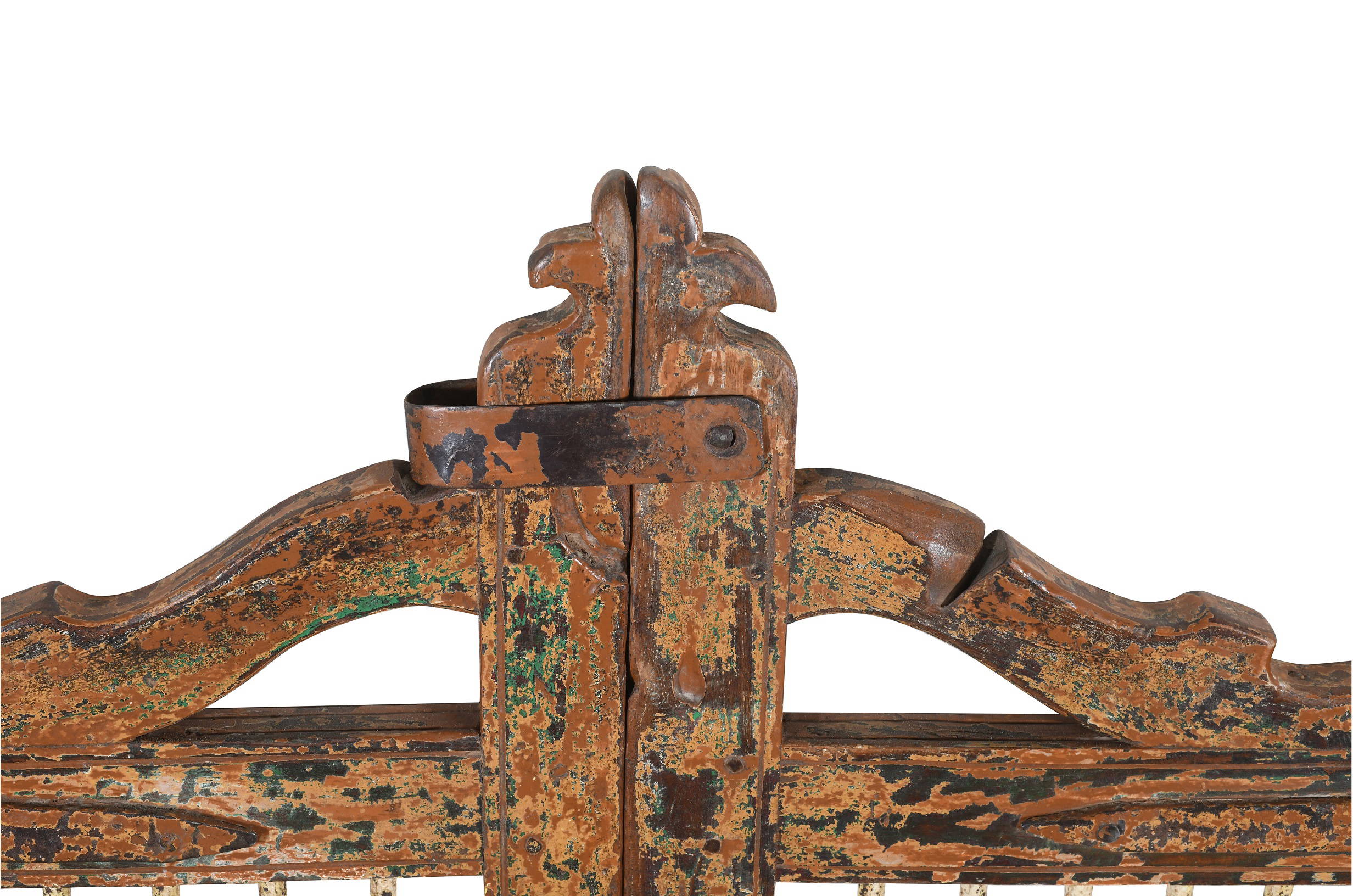 Our lovely old nineteenth century teak wood dog gates are salvaged from old buildings in Gujarat State and Northern India and saved for future generations! They are all nineteenth century originals and were used in front of the main entrance door of Gujarati Havelis to keep other animals out (and guard dogs in!). This pair have lots of fantastic old paint as well as the original old iron fittings, with fabulous patina and colour built up over centuries, which really shows its age and history. Dog Gates are now wonderfully repurposed as entry garden gates for old cottages and buildings of all kinds, and seem to fit in well outdoors with houses of all ages in the UK. They are also used to create lovely entrances in to walled gardens, greenhouses, patio areas and terraces, and many of them are used for movie props too – recreating a bygone India! They are all absolutely fine outside and last well in the UK climate. These Dog Gates are saved from buildings in India which have fallen into a state of disrepair and are no longer repairable. Our Dog Gates, whilst fully usable, workable and with many years of life ahead of them, being made from hard teak wood, are in original condition, and clearly as old pieces, come with some historic repairs and age related marks and wear and tear as you would expect. Please be sure to check all photos as these form part of the description. Dimensions: Length 100cm x Depth 4cm x Height 127cm.