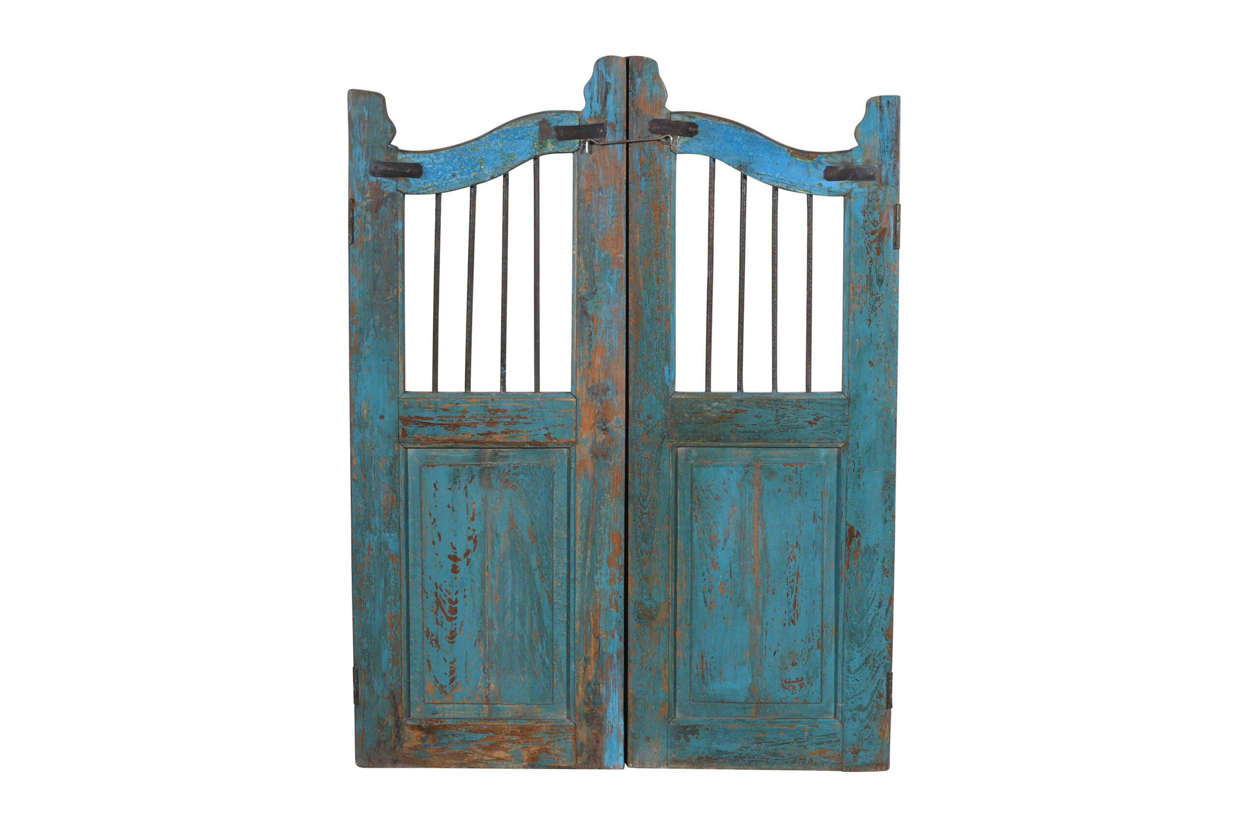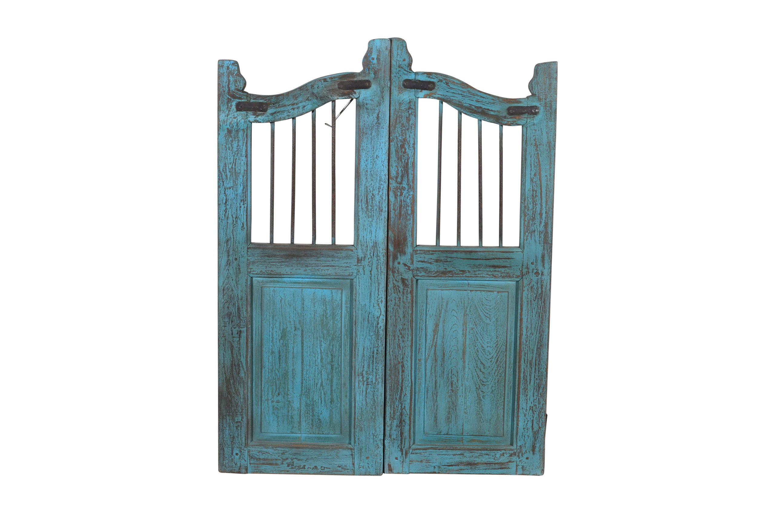 Our lovely old nineteenth century teak dog gates are salvaged from old buildings in Gujarat State and Northern India and saved for future generations! They are all nineteenth century originals and were used in front of the main entrance door of Gujarati Havelis to keep other animals out (and dogs in!). This pair have lots of fantastic old paint as well as the original old iron fittings, with fabulous patina and colour built up over centuries, which really shows its age and history. Dog Gates are now wonderfully repurposed as entry garden gates for old cottages and older buildings of all kinds, and seem to fit in well outdoors with houses of all ages in the UK. They are also used to create lovely entrances in to walled gardens, greenhouses, patio areas and terraces, and many of them are used for movie props too – recreating a bygone India! They are all absolutely fine outside and last well in the UK climate. These Dog Gates are saved from buildings in India which have fallen into a state of disrepair and are no longer repairable. Our Dog Gates, whilst fully usable, workable and with many years of life ahead of them, being made from hard teak wood, are in original condition, and clearly as old pieces, come with some historic repairs and age related marks and wear and tear as you would expect. Please be sure to check all photos as these form part of the description. Dimensions: Length 84 x Width 5 x Height 125cm