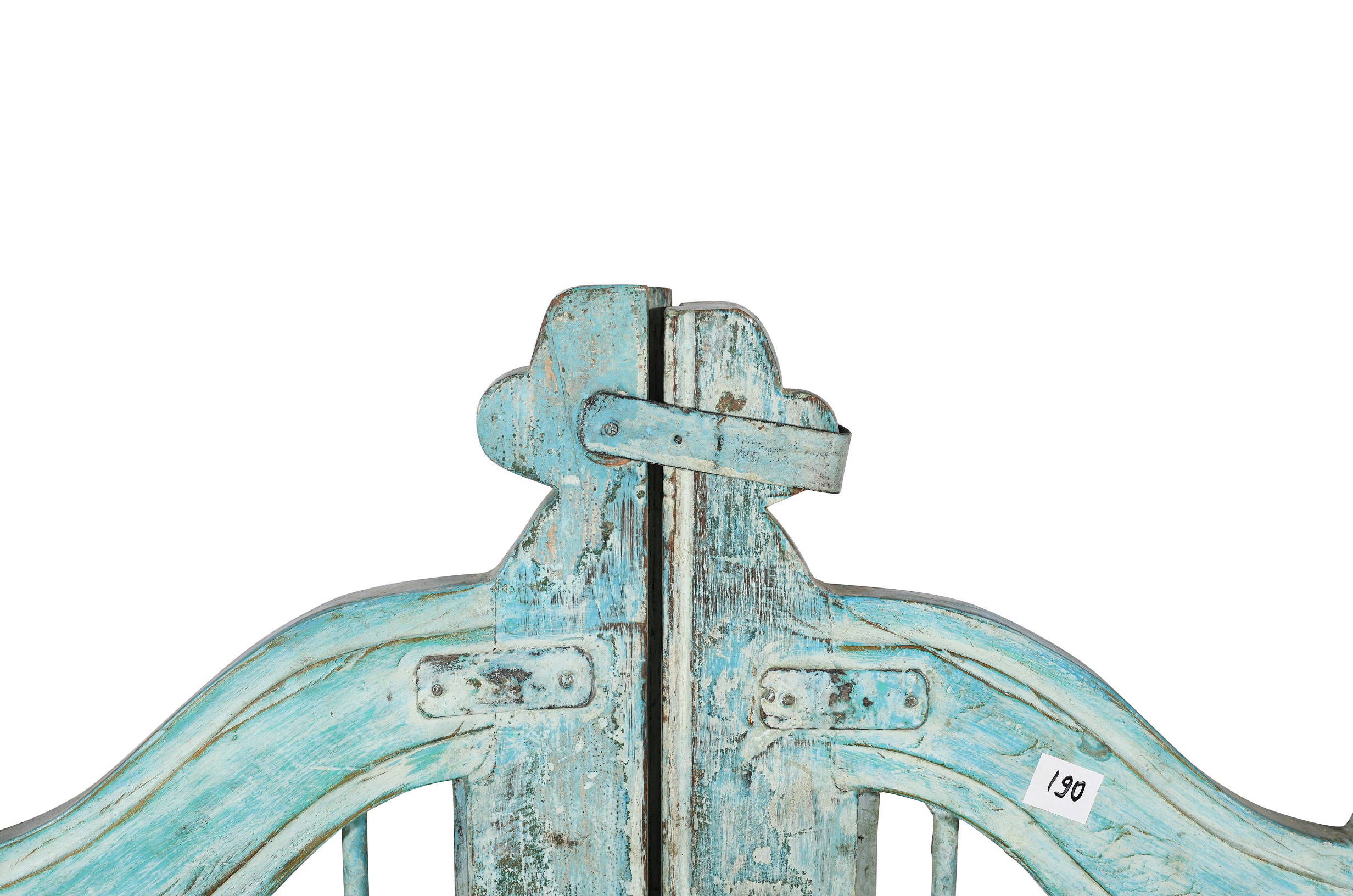 This larger than normal and extremely unusual and decorative pair of old nineteenth century teak dog gates were salvaged from an old building in Gujarat State and saved for future generations! They are nineteenth century originals (probably around 150 years old) and were used in front of the main entrance door of Gujarati Haveli to keep other animals out (and dogs in!). This pair have lots of fantastic old paint as well as the original old iron fittings, with fabulous patina and colour built up over centuries, which really shows its age and history. Dog Gates are now wonderfully repurposed as entry garden gates for old cottages and older buildings of all kinds, and seem to fit in well outdoors with houses of all ages in the UK. They are also used to create lovely entrances in to walled gardens, greenhouses, patio areas and terraces, and many of them are used for movie props too – recreating a bygone India! They are all absolutely fine outside and last well in the UK climate. These Dog Gates are saved from buildings in India which have fallen into a state of disrepair and are no longer repairable. Our Dog Gates, whilst fully usable, workable and with many years of life ahead of them, being made from hard teak wood, are in original condition, and clearly as old pieces, come with some historic repairs and age related repairs, marks and wear and tear as you would expect. Please be sure to check all photos as these form part of the description. Dimensions: Width 75cm x Depth 4cm x Height 135cm.