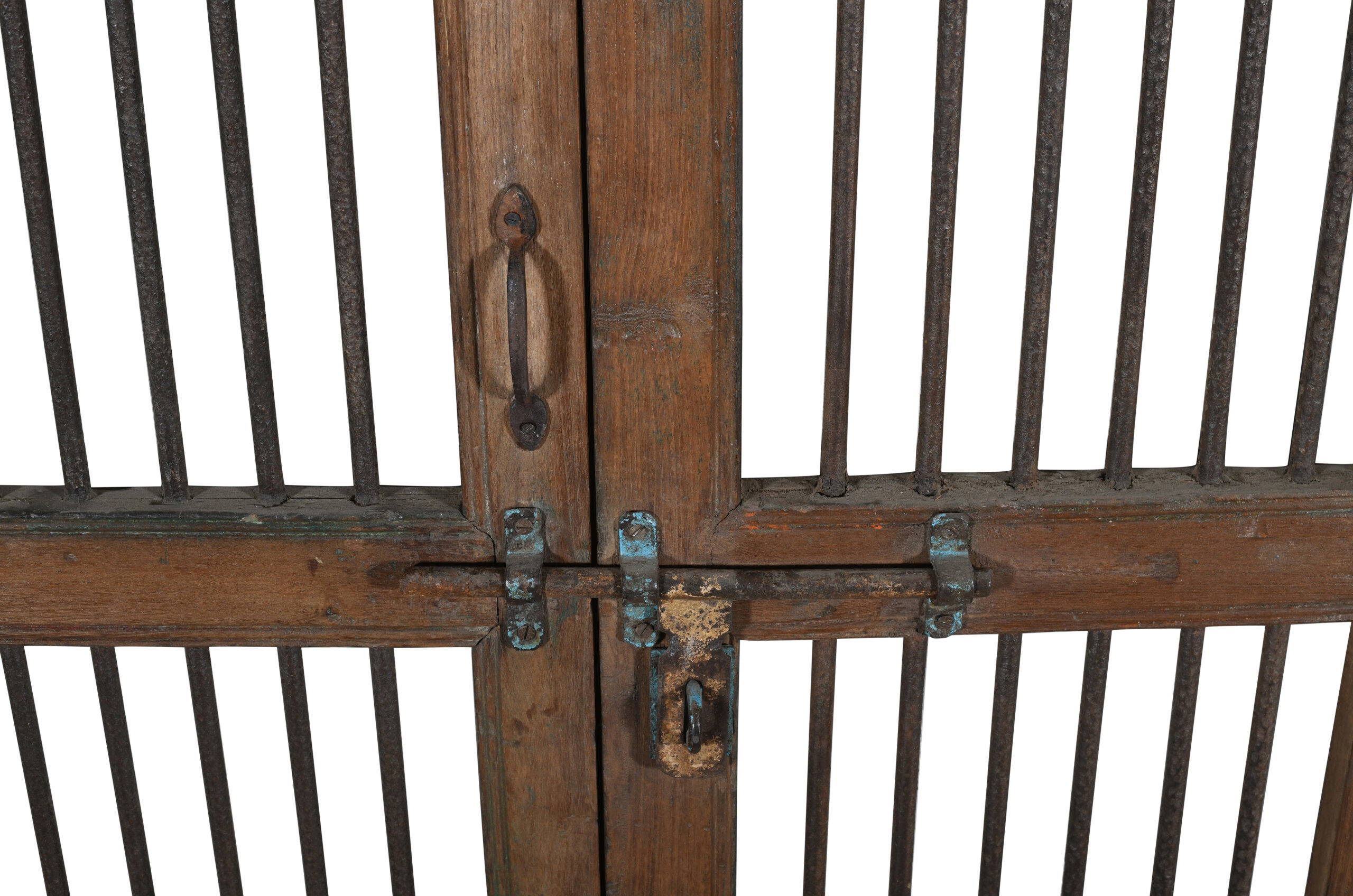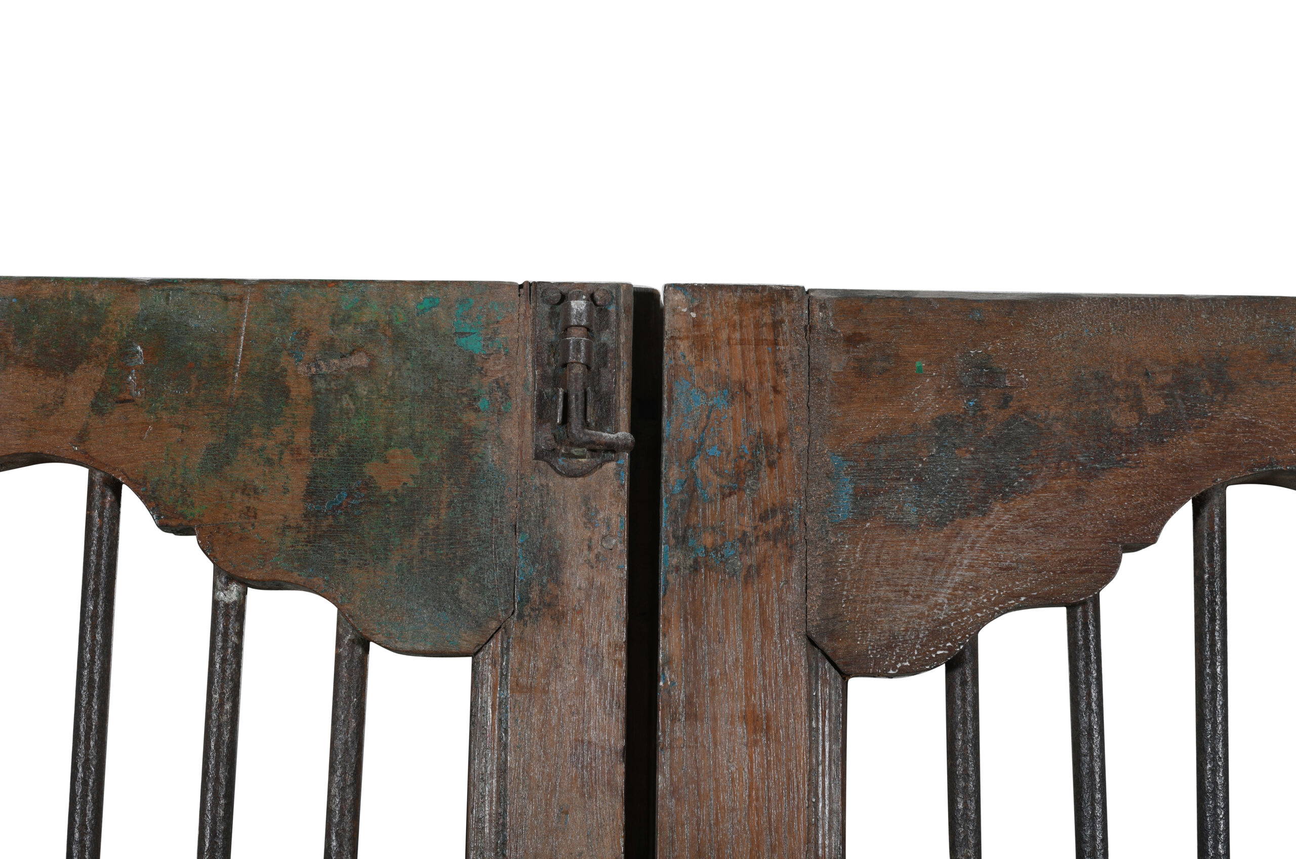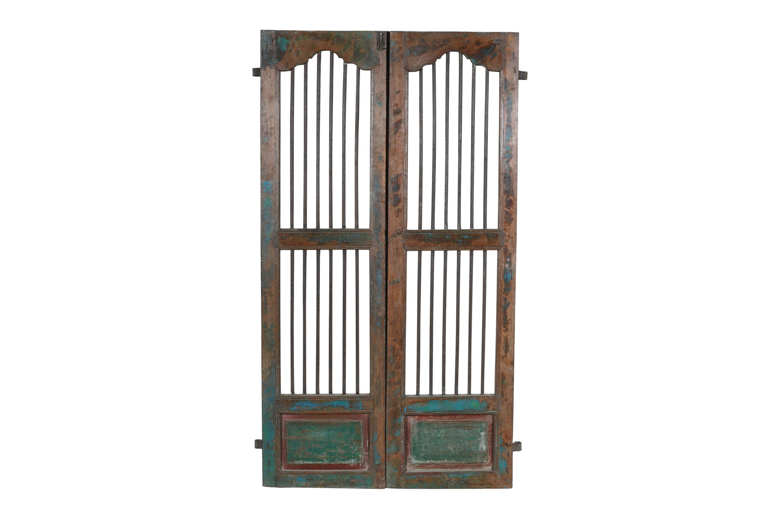 This lovely teak painted Jali door has been salvaged from an old building in Gujarat State and saved for future generations! It is a nineteenth century original! It has lots of the fantastic old paint as well as old iron fittings, with fabulous patina built up over centuries. It would look great in an old cottage or displayed in a modern house on a feature wall. This would have been called locally a Guthi Jali door – Jali meaning literally ‘see through’ because of the perforated or lattice iron work architectural design. We have many customers that also like to repurpose our old Indian doors for grand entrances in to walled gardens, patio areas and terraces, and many of them are used for movie props too – recreating a bygone India! These doors are saved from buildings in India which have fallen into a state of disrepair and are no longer repairable. Although this is a heavy piece, we have a trained delivery company to bring it into your home. This is clearly an old piece and there are some historic repairs and age related marks and wear and tear as you would expect. This is also a unique one of piece which was made by hand many years ago and has stunning hand carved detailing, combined with fabulous old paintwork, and a lovely patina which really shows its age and history. Please be sure to check all photos as these form part of the description. Dimensions: Length 100 x Width 4 x Height 180cm