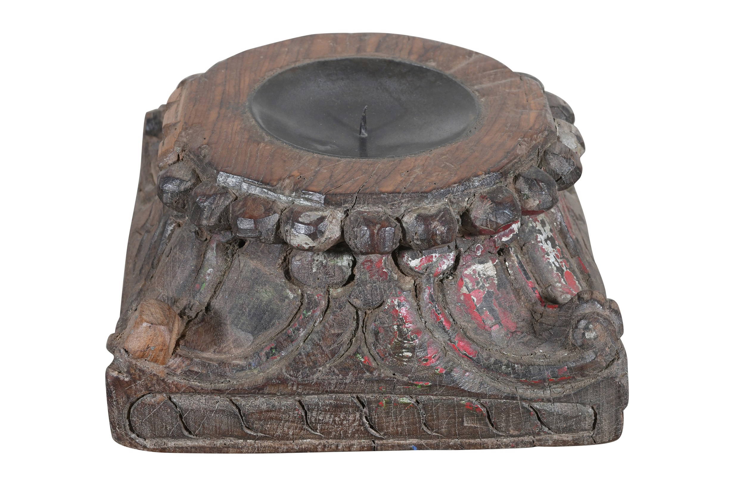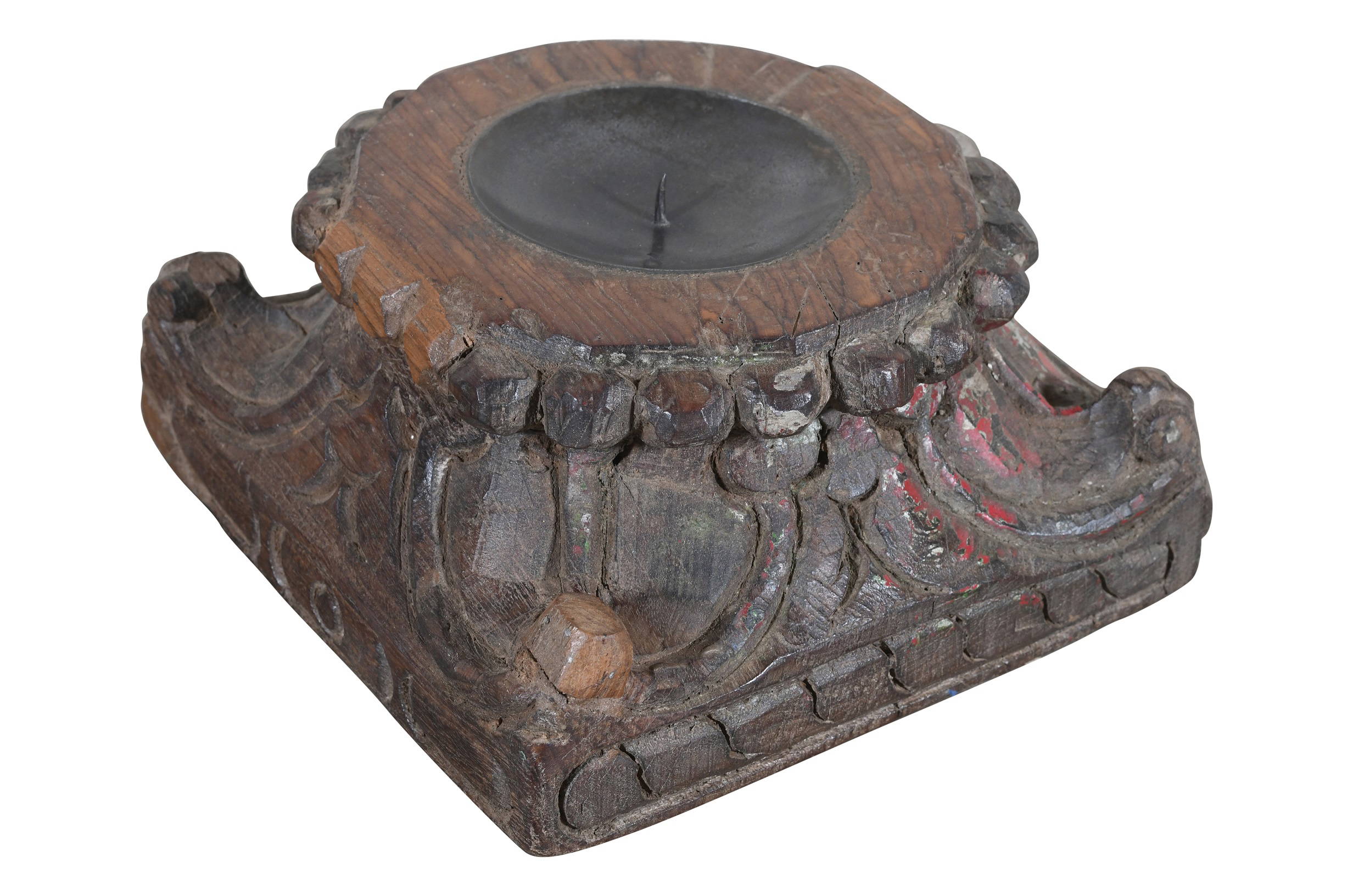Our antique Indian teak wood pillar base candle holders are all totally unique and date from the eighteenth and nineteenth century. We have added a rustic iron candle holder to the middle to make them functional. Each is intricately carved from solid teak, and often come with much of the original paint insitu. Our bases are salvaged from old buildings in Gujarat State and Rajasthan and saved for future generations! In a previous life they would have supported the tops and bottoms of teak columns that stood outside grand houses in eighteenth and nineteenth century India. This example has beautiful ornate hand carvings all over it and lots of wonderful old paint with a fine patina. They look great as a centre piece of the side board, console table, fire hearth or the kitchen table. They are also lovely outside for BBQs. It would be perfect for a period property or even to add character to a new style home. These column bases are saved from buildings in India which have fallen into a state of disrepair and are no longer rescuable. This is clearly an old piece and there are some historic repairs and age related marks and wear and tear as you would expect. Please be sure to check all photos as these form part of the description. Dimensions: Length 23cm x Depth 23cm x Height 12cm.