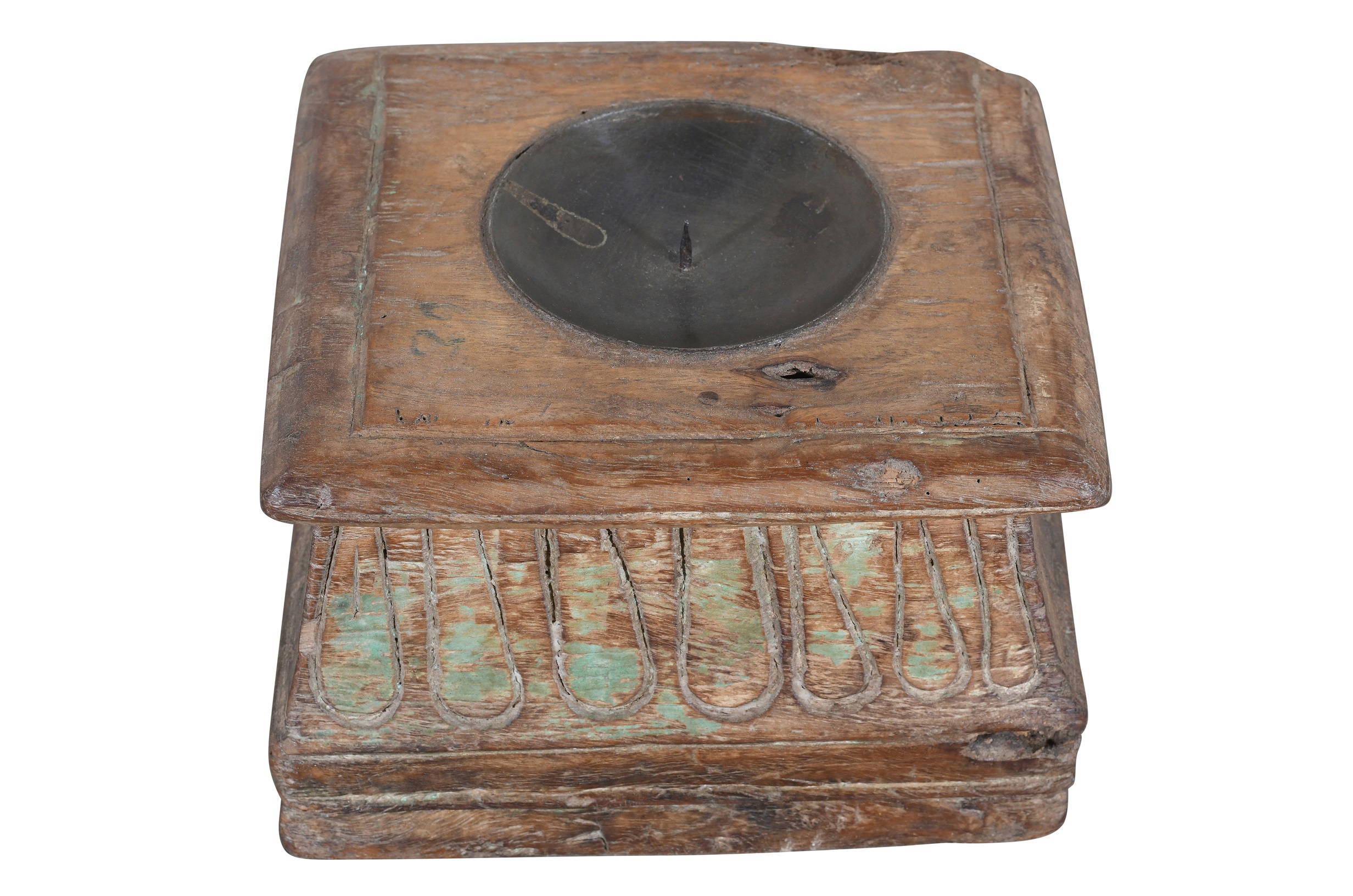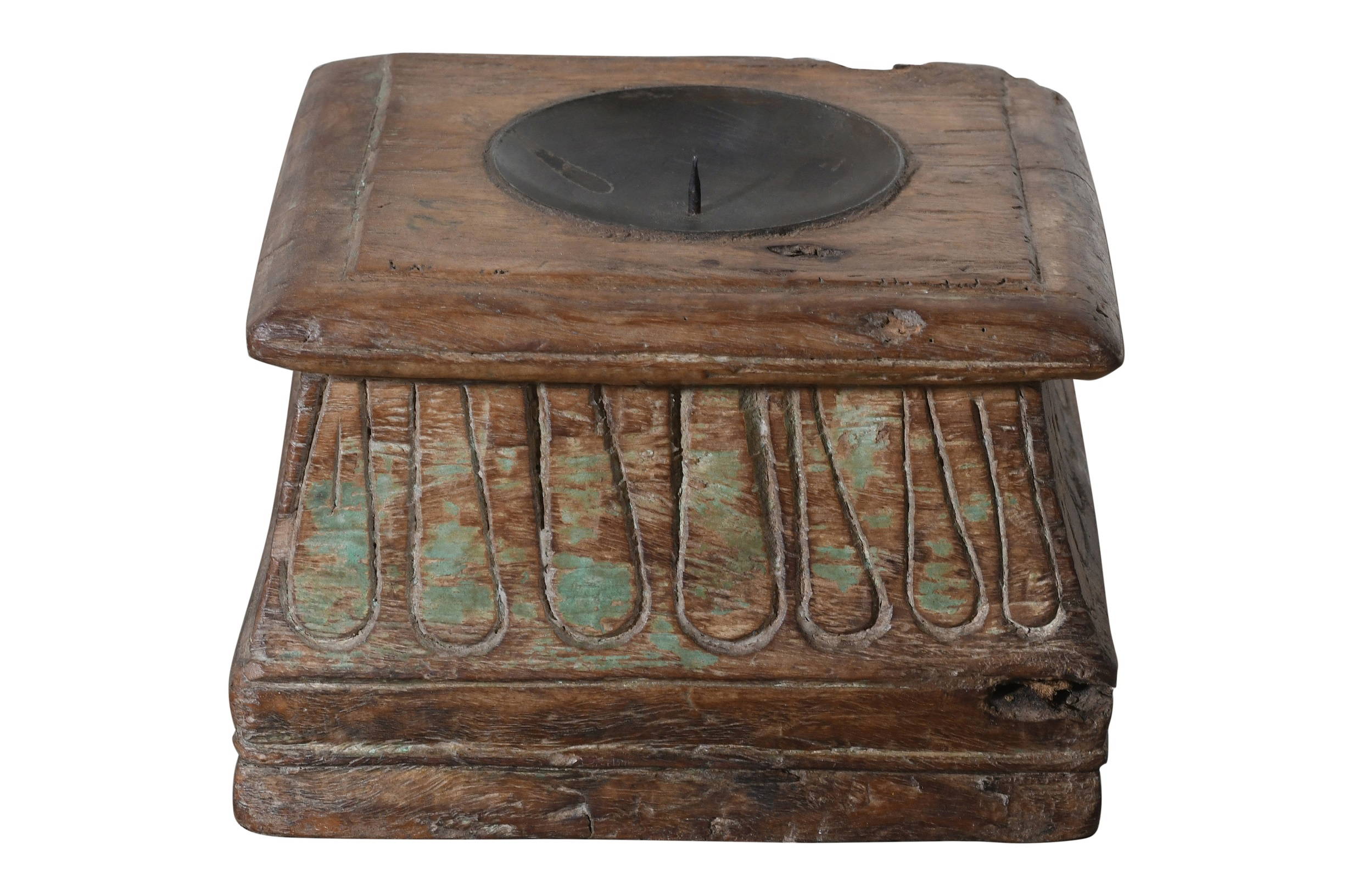 Our antique Indian teak wood pillar base candle holders are all totally unique and date from the eighteenth and nineteenth century. We have added a rustic iron candle holder to the middle to make them functional. Each is intricately carved from solid teak, and often come with much of the original paint insitu. Our bases are salvaged from old buildings in Gujarat State and Rajasthan and saved for future generations! In a previous life they would have supported the tops and bottoms of teak columns that stood outside grand houses in eighteenth and nineteenth century India. This example has beautiful ornate hand carvings all over it and lots of wonderful old paint with a fine patina. They look great as a centre piece of the side board, console table, fire hearth or the kitchen table. They are also lovely outside for BBQs. It would be perfect for a period property or even to add character to a new style home. These column bases are saved from buildings in India which have fallen into a state of disrepair and are no longer rescuable. This is clearly an old piece and there are some historic repairs and age related marks and wear and tear as you would expect. Please be sure to check all photos as these form part of the description. Dimensions: Length 22cm x Depth 22cm x Height 14cm.