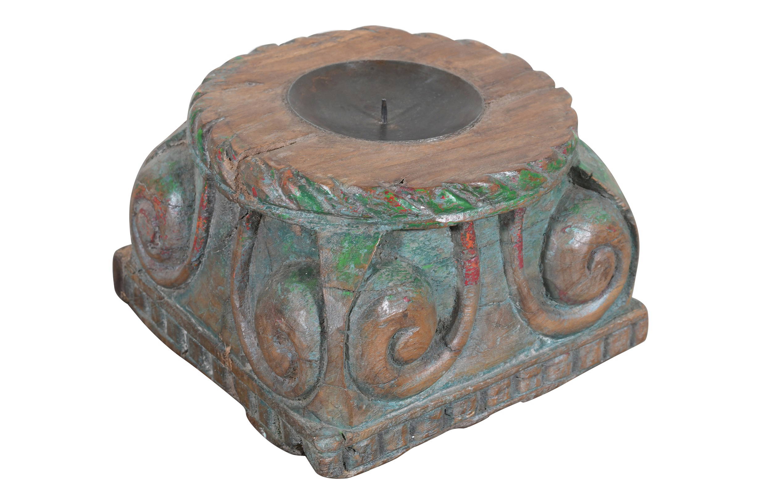 Our antique Indian teak wood pillar base candle holders are all totally unique and date from the eighteenth and nineteenth century. We have added a rustic iron candle holder to the middle to make them functional. Each is intricately carved from solid teak, and often come with much of the original paint insitu. Our bases are salvaged from old buildings in Gujarat State and Rajasthan and saved for future generations! In a previous life they would have supported the tops and bottoms of teak columns that stood outside grand houses in eighteenth and nineteenth century India. This example has beautiful ornate hand carvings all over it and lots of wonderful old paint with a fine patina. They look great as a centre piece of the side board, console table, fire hearth or the kitchen table. They are also lovely outside for BBQs. It would be perfect for a period property or even to add character to a new style home. These column bases are saved from buildings in India which have fallen into a state of disrepair and are no longer rescuable. This is clearly an old piece and there are some historic repairs and age related marks and wear and tear as you would expect. Please be sure to check all photos as these form part of the description. Dimensions: Length 23cm x Depth 23cm x Height 15cm.