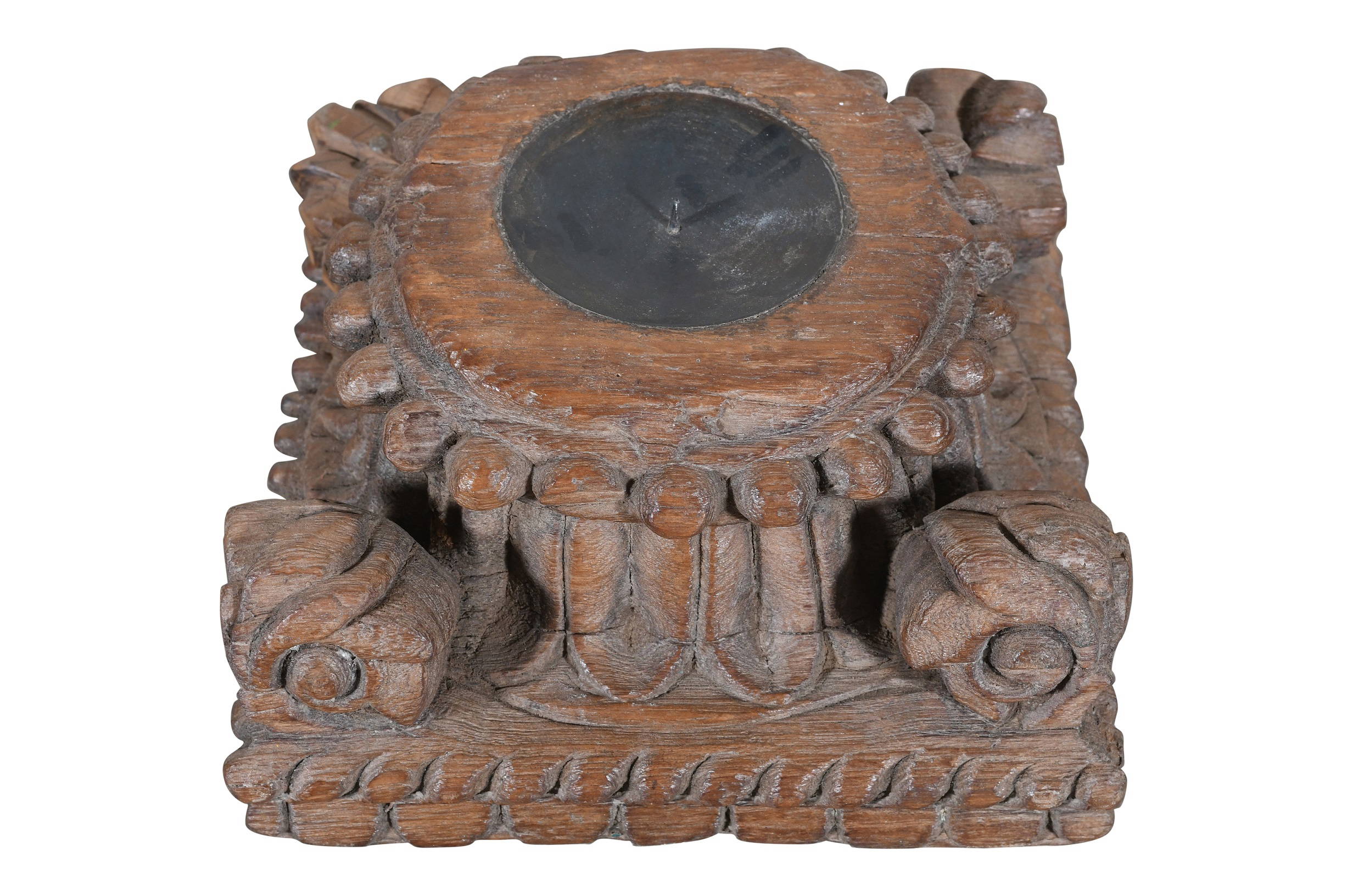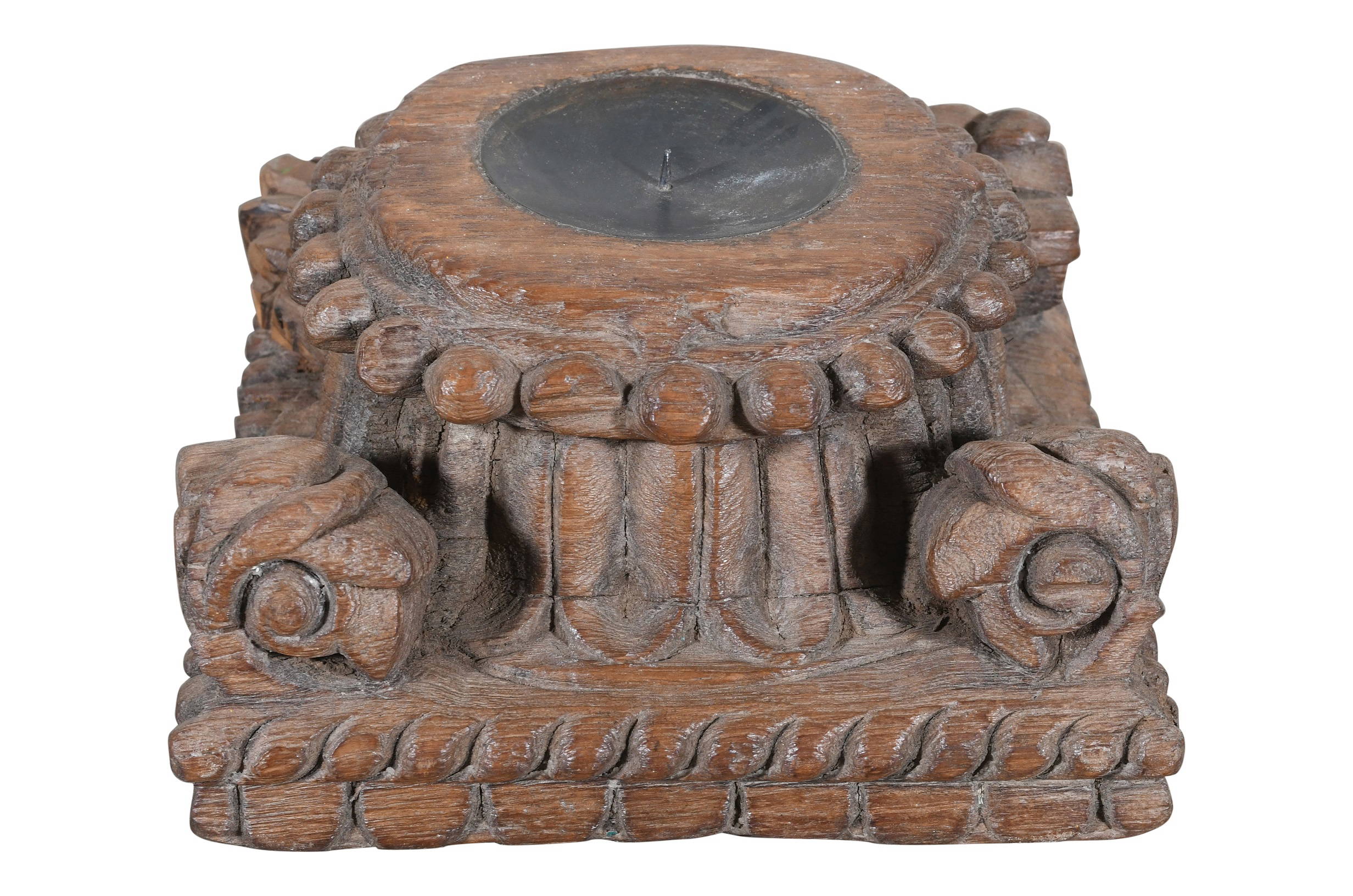 Our antique Indian teak wood pillar base candle holders are all totally unique and date from the eighteenth and nineteenth century. We have added a rustic iron candle holder to the middle to make them functional. Each is intricately carved from solid teak, and often come with much of the original paint insitu. Our bases are salvaged from old buildings in Gujarat State and Rajasthan and saved for future generations! In a previous life they would have supported the tops and bottoms of teak columns that stood outside grand houses in eighteenth and nineteenth century India. This example has beautiful ornate hand carvings all over it and lots of wonderful old paint with a fine patina. They look great as a centre piece of the side board, console table, fire hearth or the kitchen table. They are also lovely outside for BBQs. It would be perfect for a period property or even to add character to a new style home. These column bases are saved from buildings in India which have fallen into a state of disrepair and are no longer rescuable. This is clearly an old piece and there are some historic repairs and age related marks and wear and tear as you would expect. Please be sure to check all photos as these form part of the description.