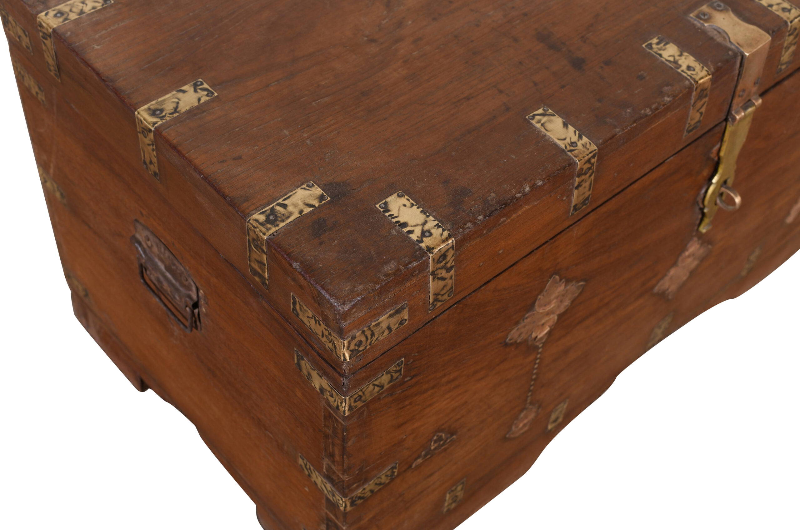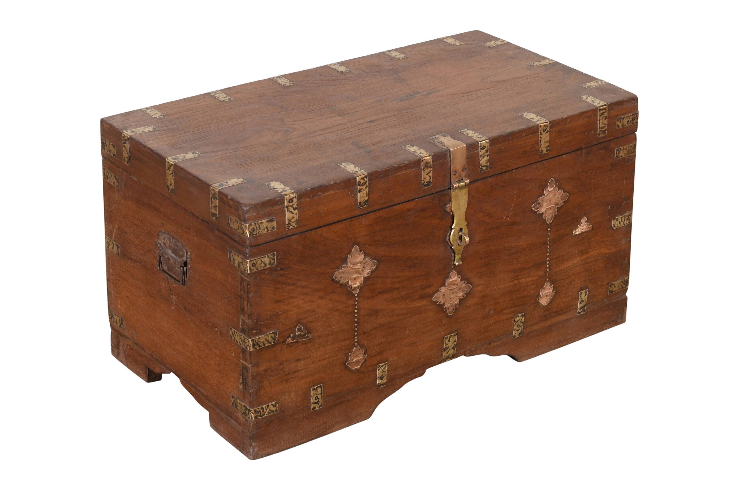 A fine and well proportioned antique teak wood Pitara or Dowry Chest. With lovely original brass inlay & fine brass fittings, this late nineteenth century example is in great original condition. Originating from southern India, this would have been used to securley store cash, coins, jewels, silks, silver and manuscripts. Today they are used throughout the home as coffee tables and small storage units. As with all antiques, there are minor blemishes and bumps, with signs of minor sensitive early restoration, as you would expect with an object of this age. Dimensions: Length 79 x Width 42 x Height 43cm