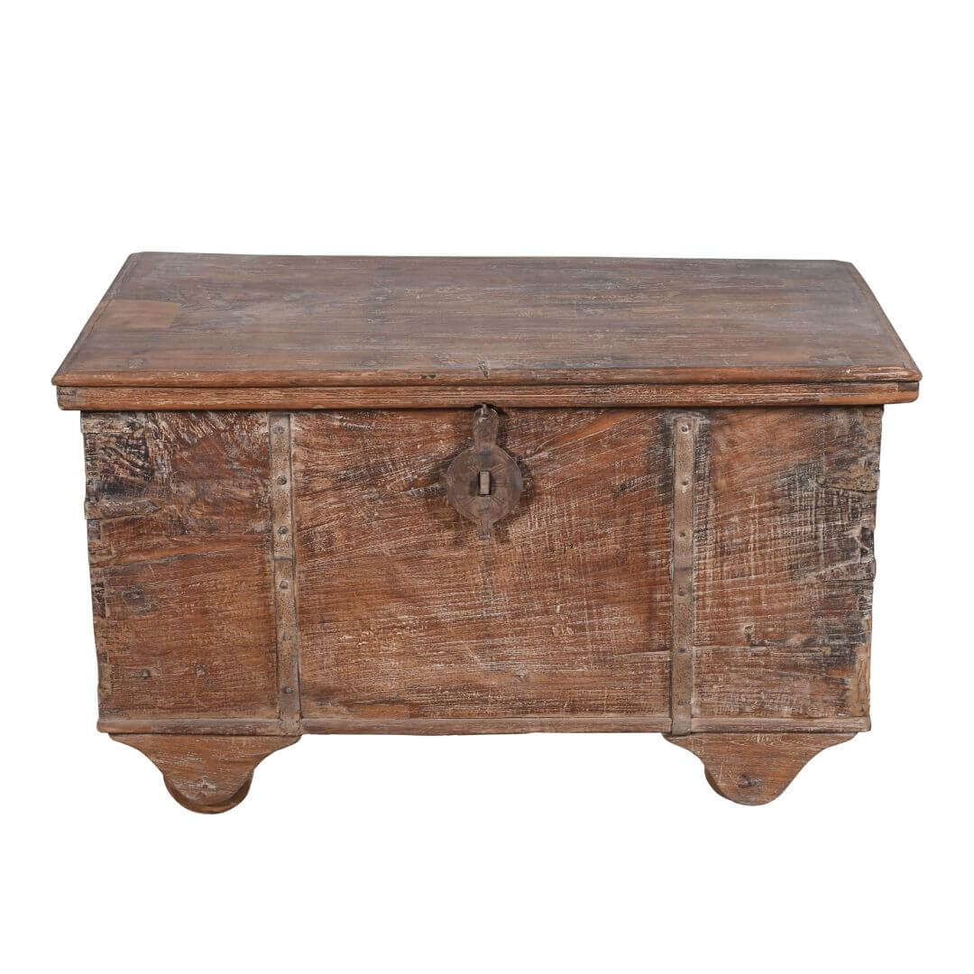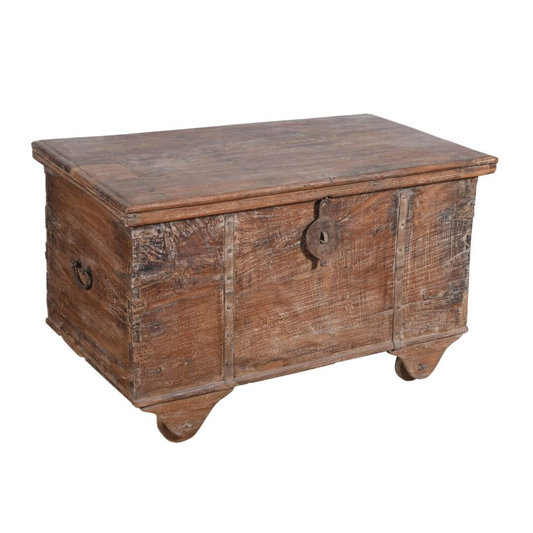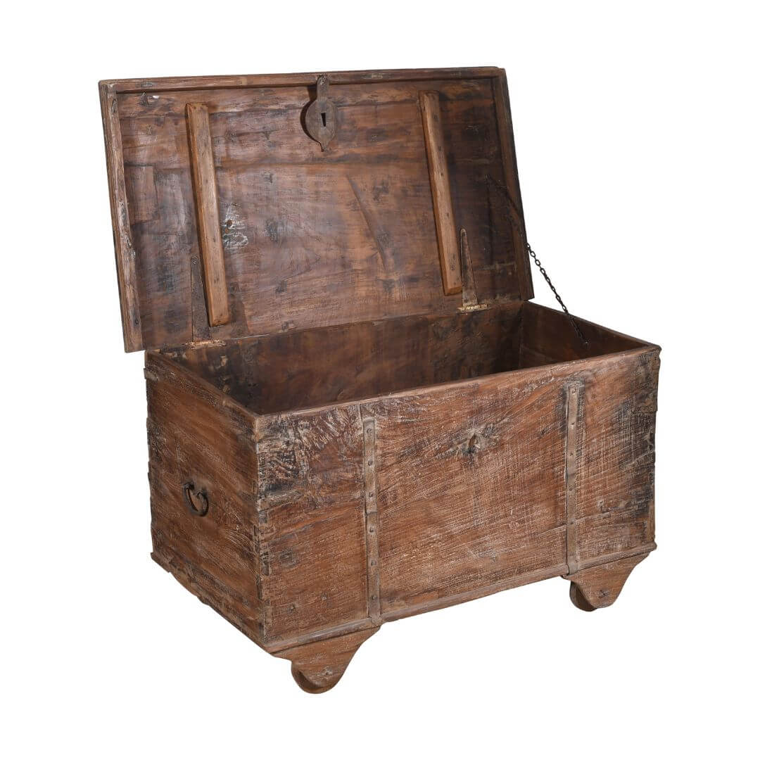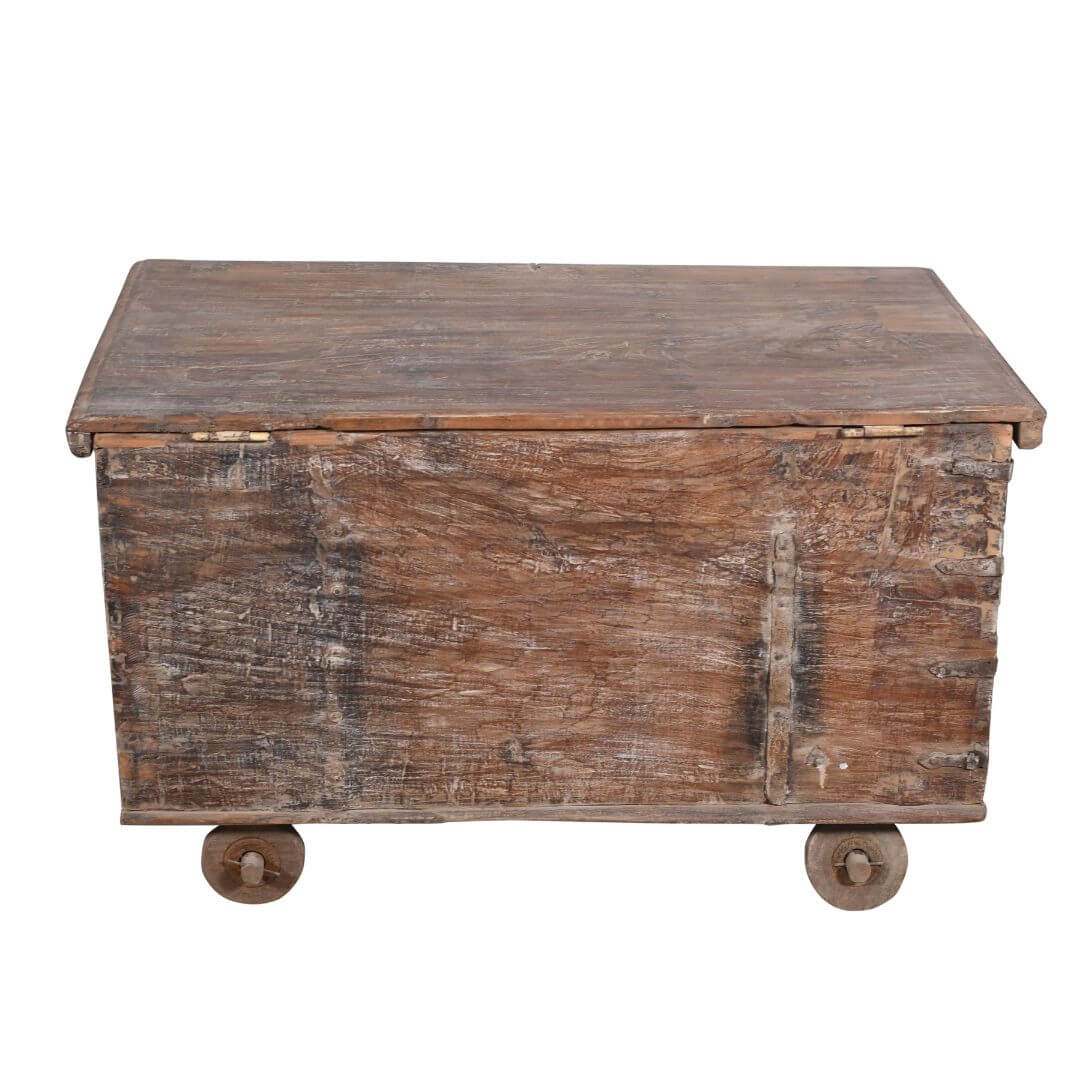 In Gujarat State during the Victorian era, chests like this were custom-made to store valuables such as textiles, jewellery, dowry, and cash, secured with strong padlocks. This chest is the perfect height and depth for a coffee table and doubles as a storage box for magazines, newspapers, and books. It also comes with wheels for easy movement.