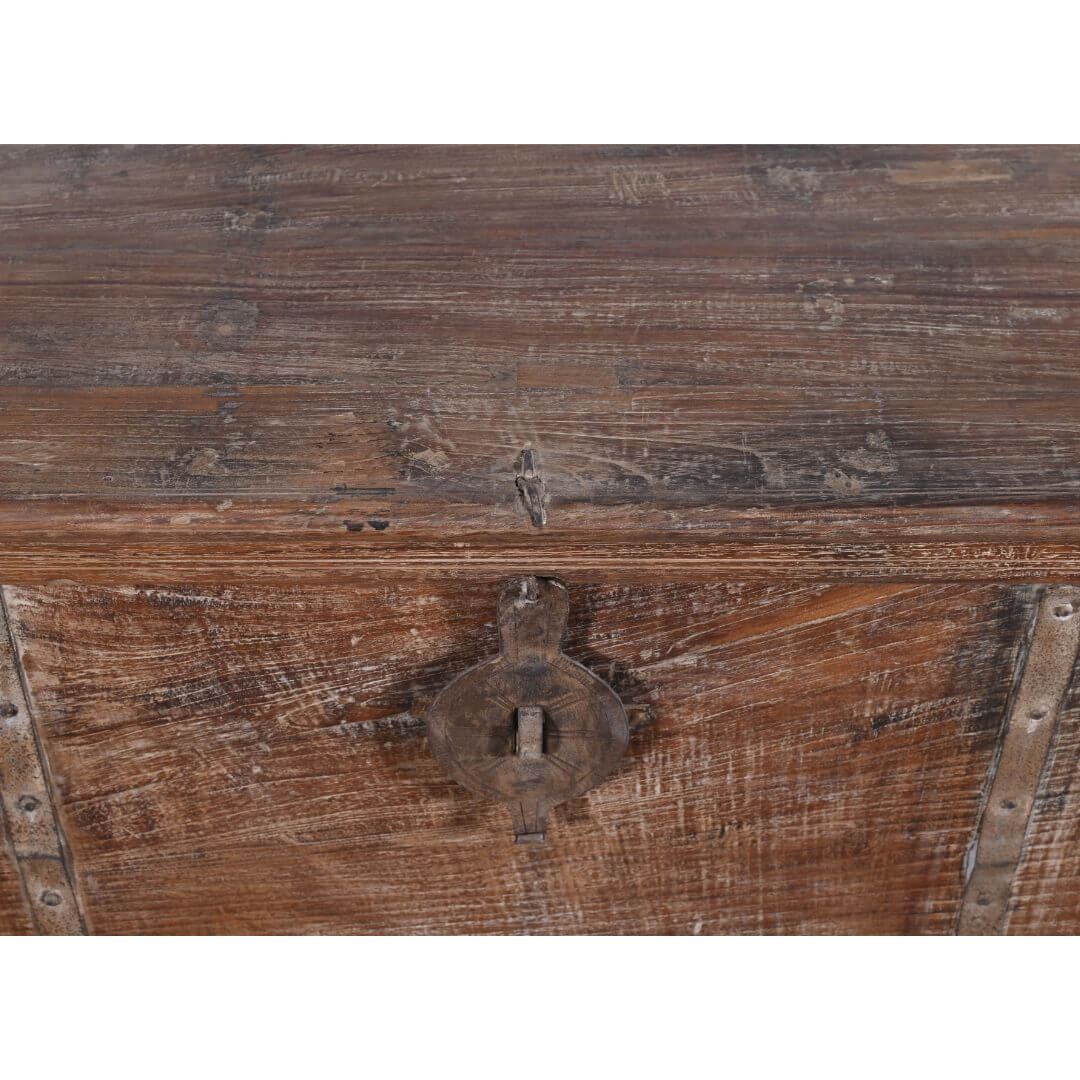 This rustic antique Indian teak wood Surti chest was crafted in the 19th century from thick teak wood, reinforced with iron and brass binding for extra strength. Retaining its original painted teak wood condition, this chest showcases its rich history and character.