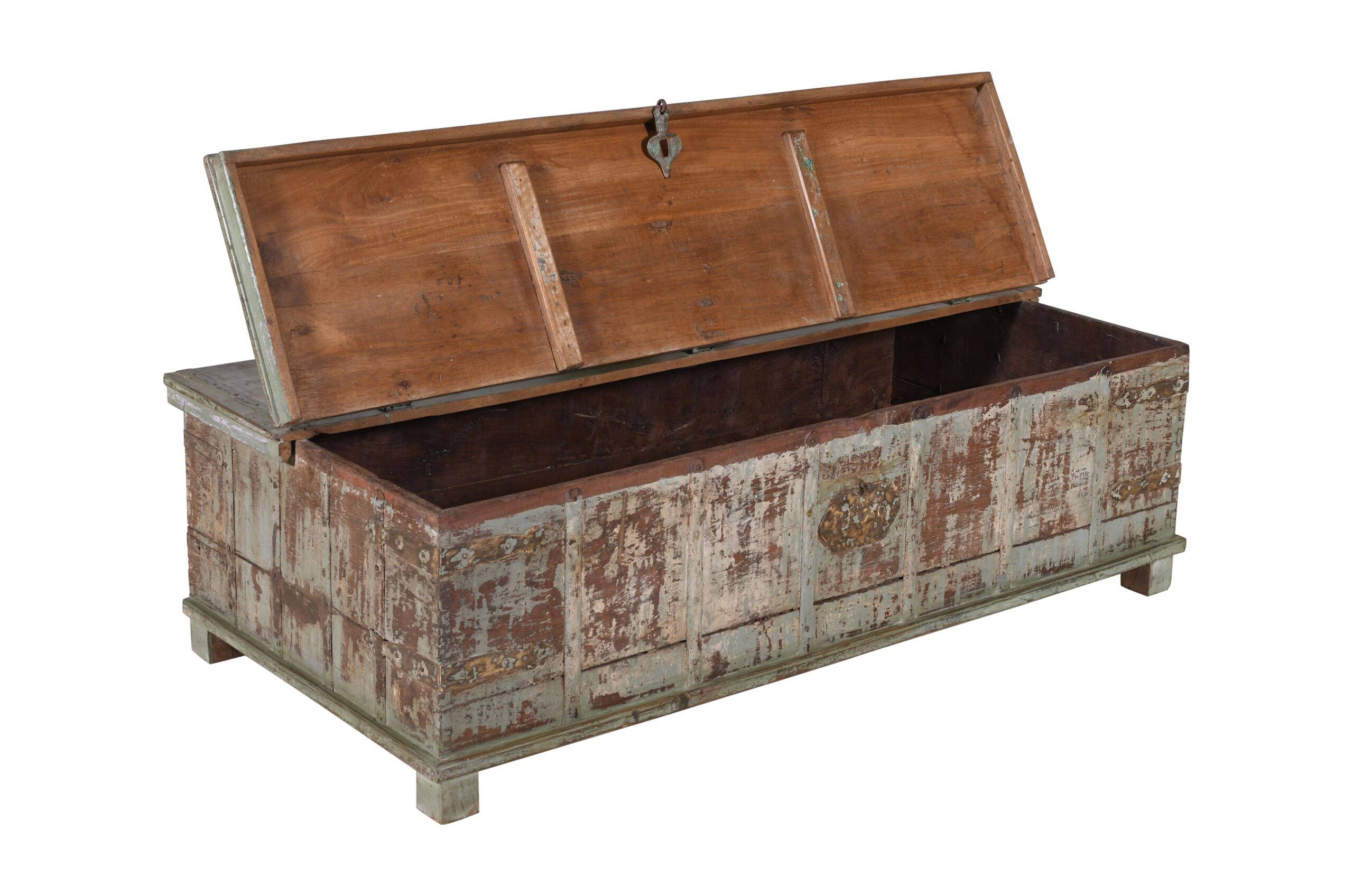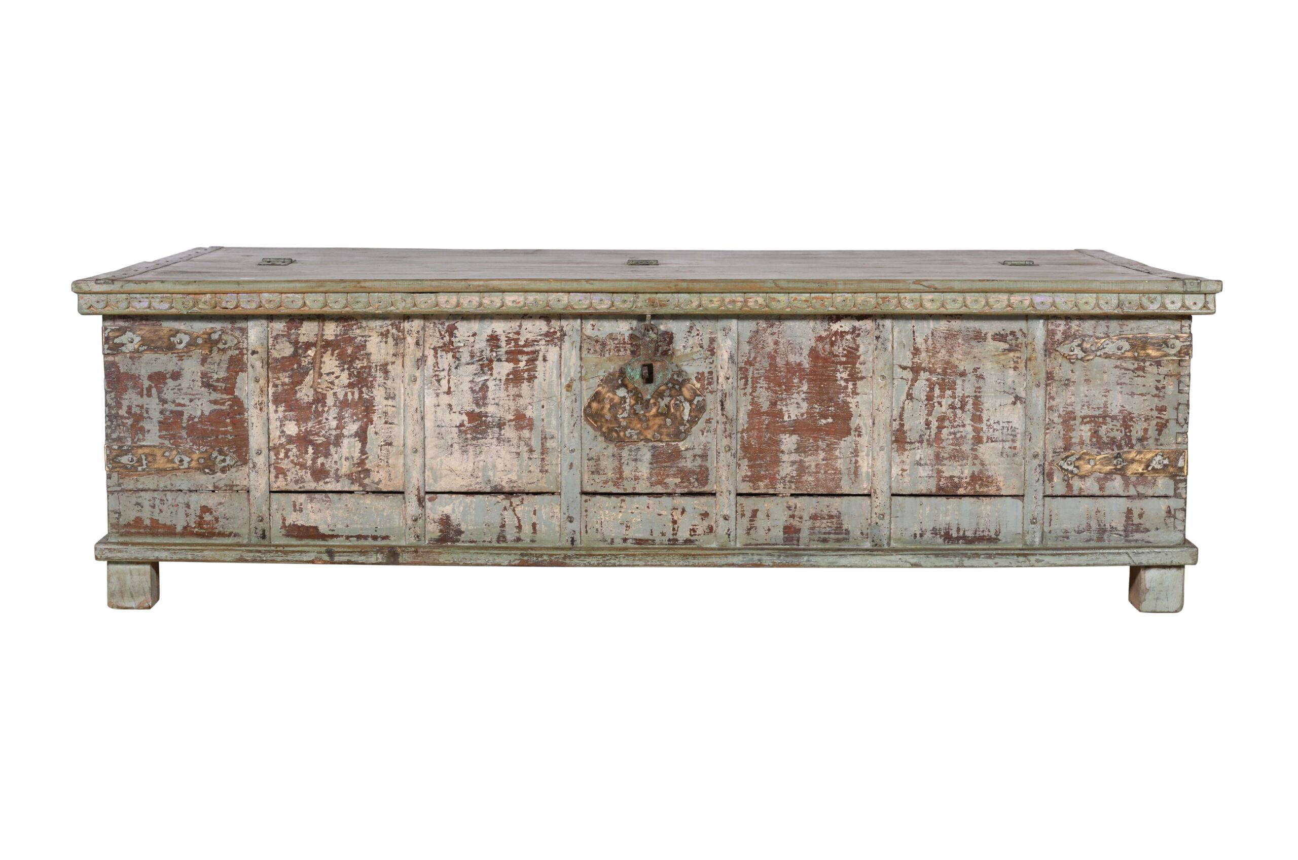This rustic Surti Chest was made to last in the 19th century from thick teak wood and then iron and brass bound to give it extra strength. This one is in its beautiful original teak wood condition, with traces of the old green paint which gives it a great “shabby chic” look. Chests like this were “custom made” by the head of the family, who commissioned a carpenter to make one to store valuables such as textiles, jewellery, dowry and cash. They we’re locked with strong padlocks for maximum security. Chests and boxes from India are found in an extraordinary variety of styles reflecting the many cultures that influenced India. This chest is the perfect height and depth for a coffee table, and doubles up as a storage box for magazines, newspapers and books. This wonderful Surti Coffee Table Chest was made in Gujarat State during the Victorian era. It is a good sized utility piece that can be usefully placed anywhere in the home. This is also a unique one of piece which was made by hand many years ago and has a lovely patina which really shows its age and history. There are some historic minor repairs and age related marks and wear and tear as you would expect. Please be sure to check all photos as these form part of the description.