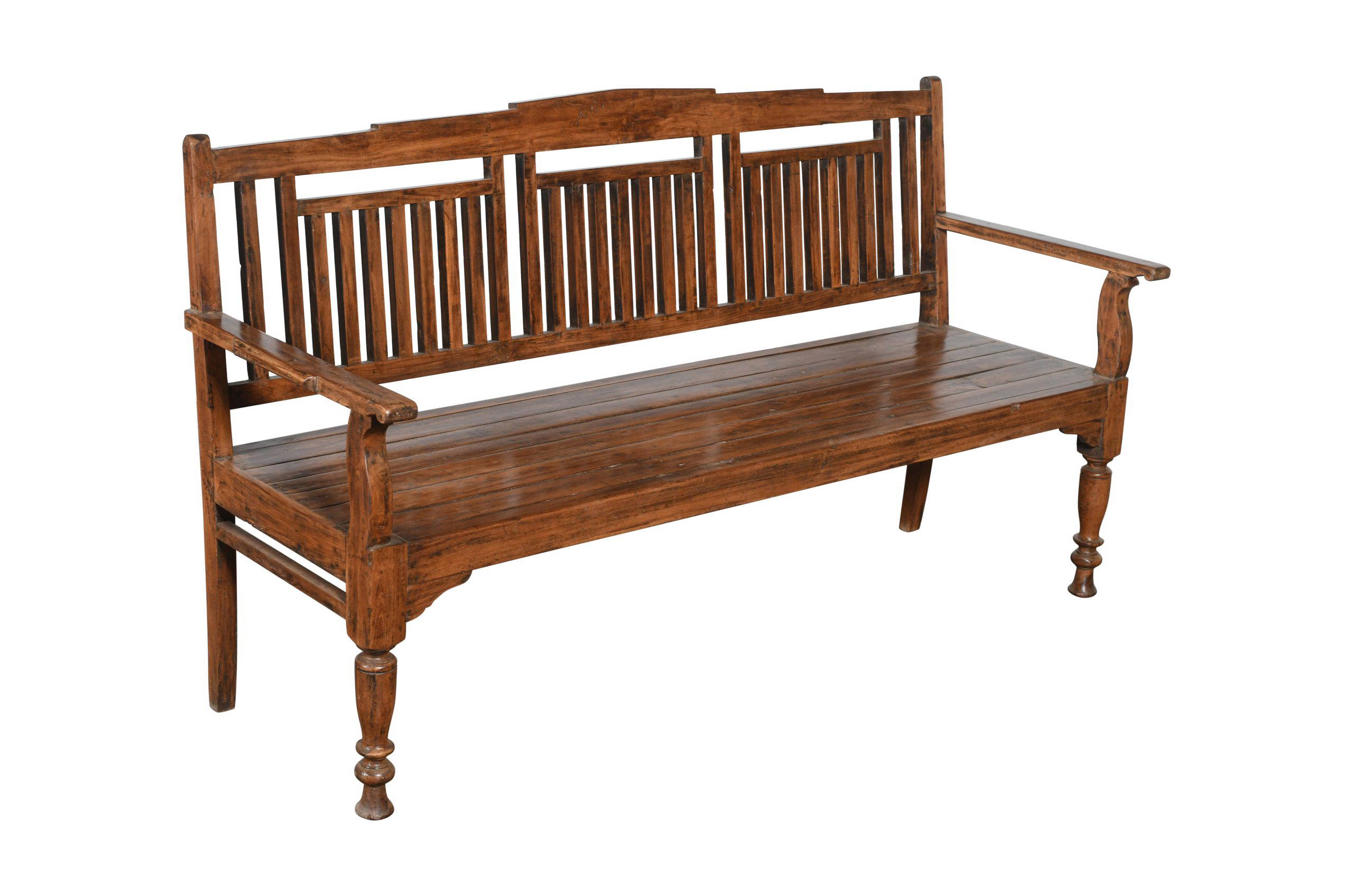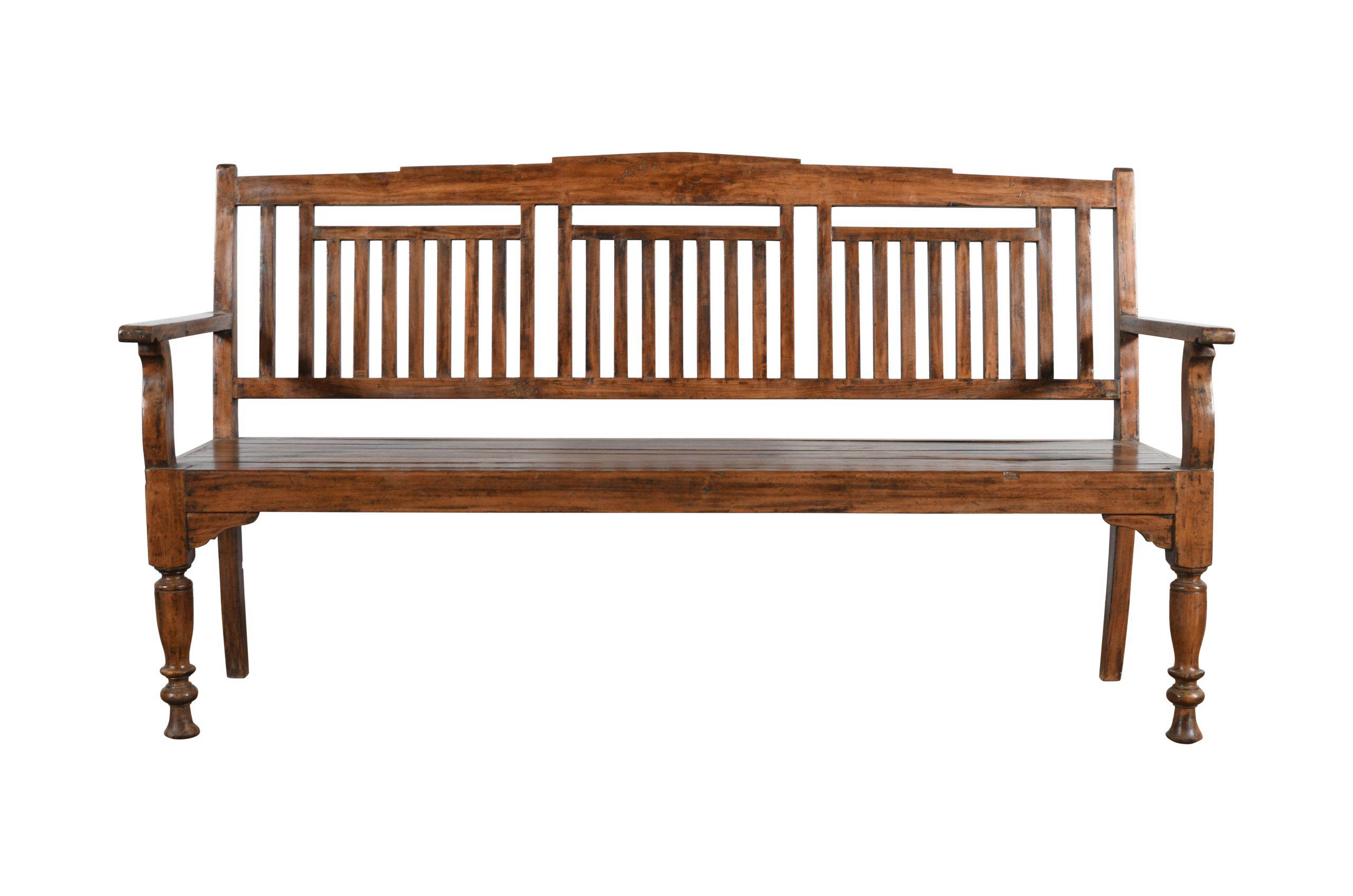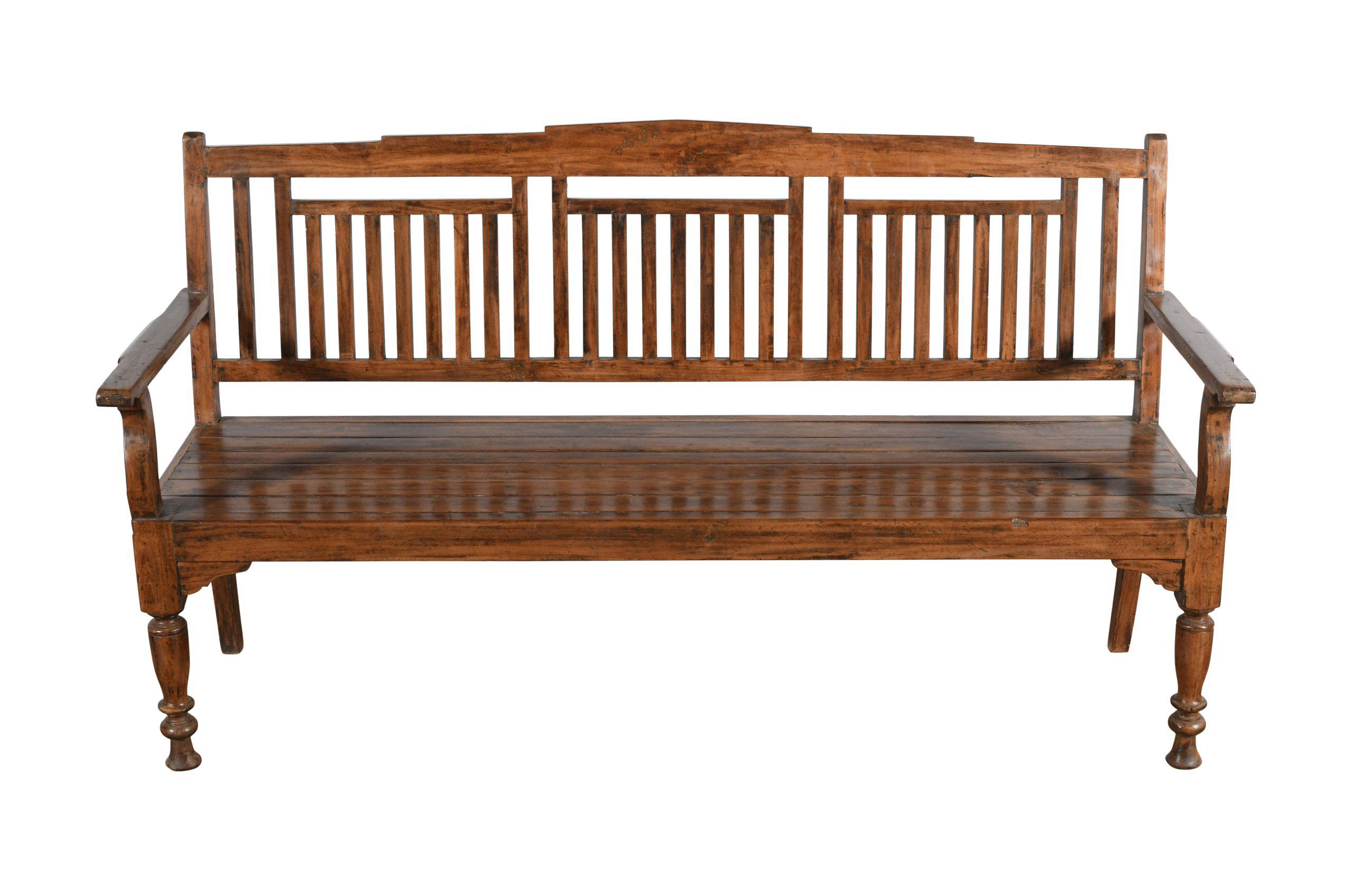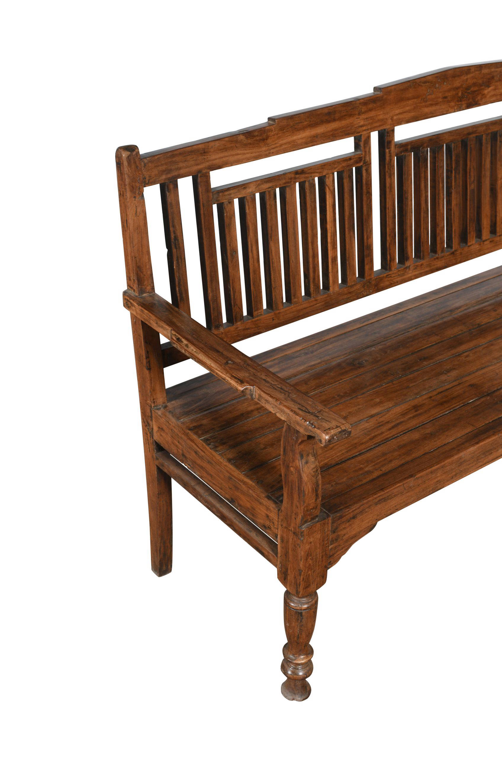 This wonderfully original early 20th century (well over 100 years old) Indian teak wood garden or chapel bench was made to last. It is in beautiful original condition, ready to grace any garden or hallway. Benches from India are found in an extraordinary variety of styles, sizes, colours and shapes reflecting the many cultures that influenced the continent, and are generally made from iron or teak. This bench is the perfect feature for a UK garden patio or terrace, or indeed for a hallway or consrvatory and is designed for comfort. Our bench was made in Rajasthan during the early Edwardian era. It is a good sized utility piece that can be usefully placed anywhere. This is also a unique one of piece which was made by hand many years ago and has a lovely patina which really shows its age and history. There are some historic minor repairs and age related marks and wear and tear as you would expect. Please be sure to check all photos as these form part of the description. Dimensions: Width 174cm x Depth 60cm x Height 96cm.