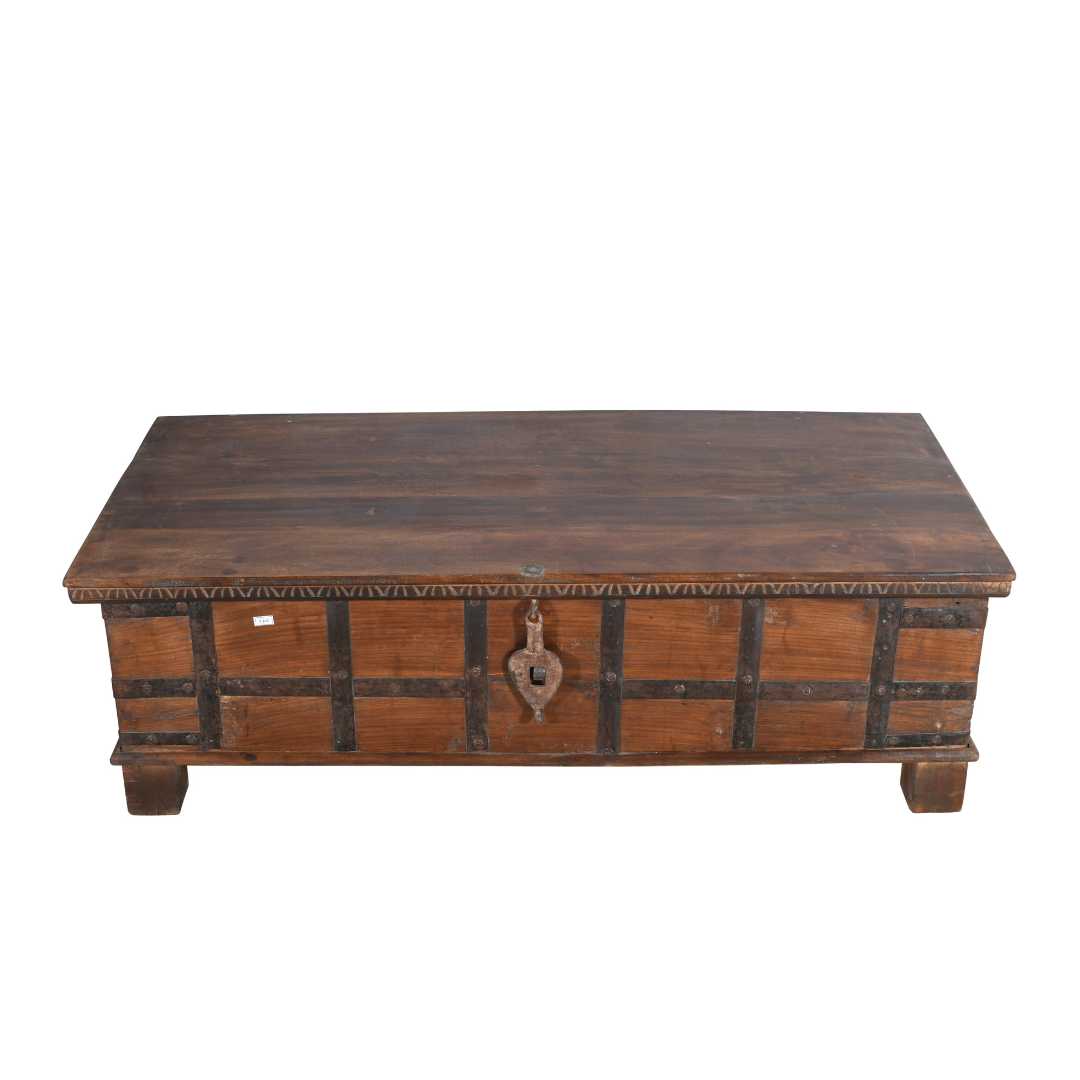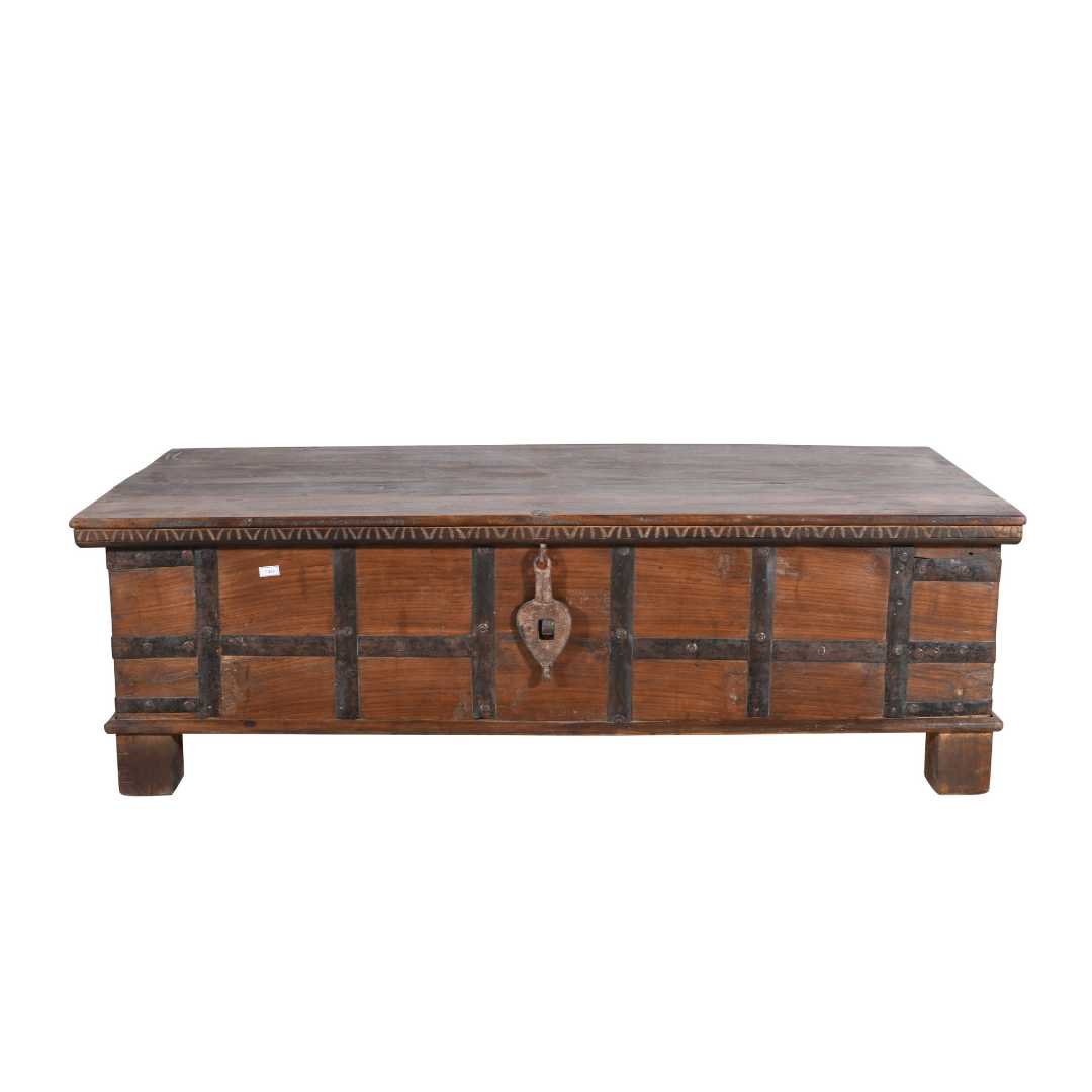Bring the spirit of Indian craftsmanship and heritage into your home with this Antique Surti Teak Wood Coffee Table Chest, a one-of-a-kind 19th-century original from Gujarat. Handcrafted from thick, golden-brown teak and reinforced with iron and brass banding, this chest was originally commissioned by a family head to securely store valuables such as textiles, jewellery, dowry, and cash. Its robust construction and original teak finish, enhanced by a beautiful patina, reflect its age and storied history.