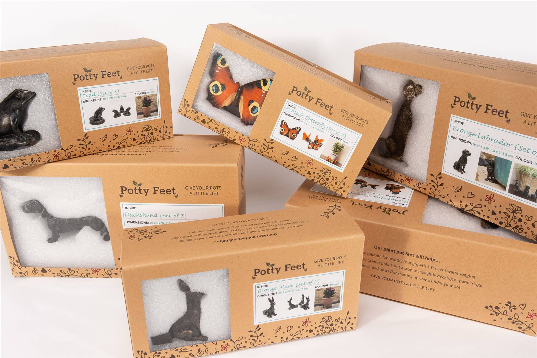 Each set of 3 Potty Feet come beautifully packaged using 100% recycled materials in our own custom-designed and branded gift boxes, making this an ideal and unique gift for loved ones and friends. They are also safely encased within a foam protection layer (also 100% recycled), making breakages in transit highly unlikely. The packaging can be onward recycled once discarded.