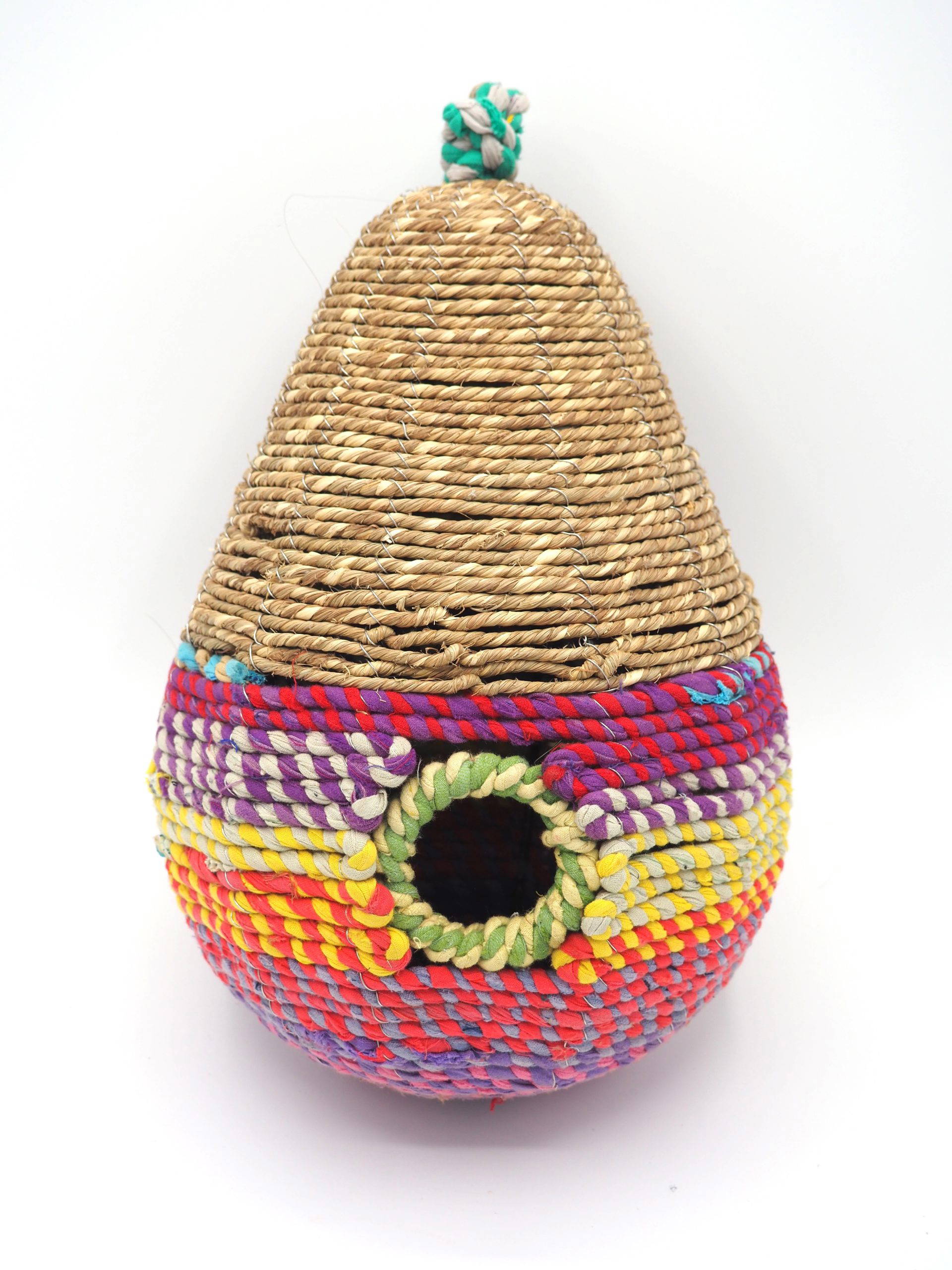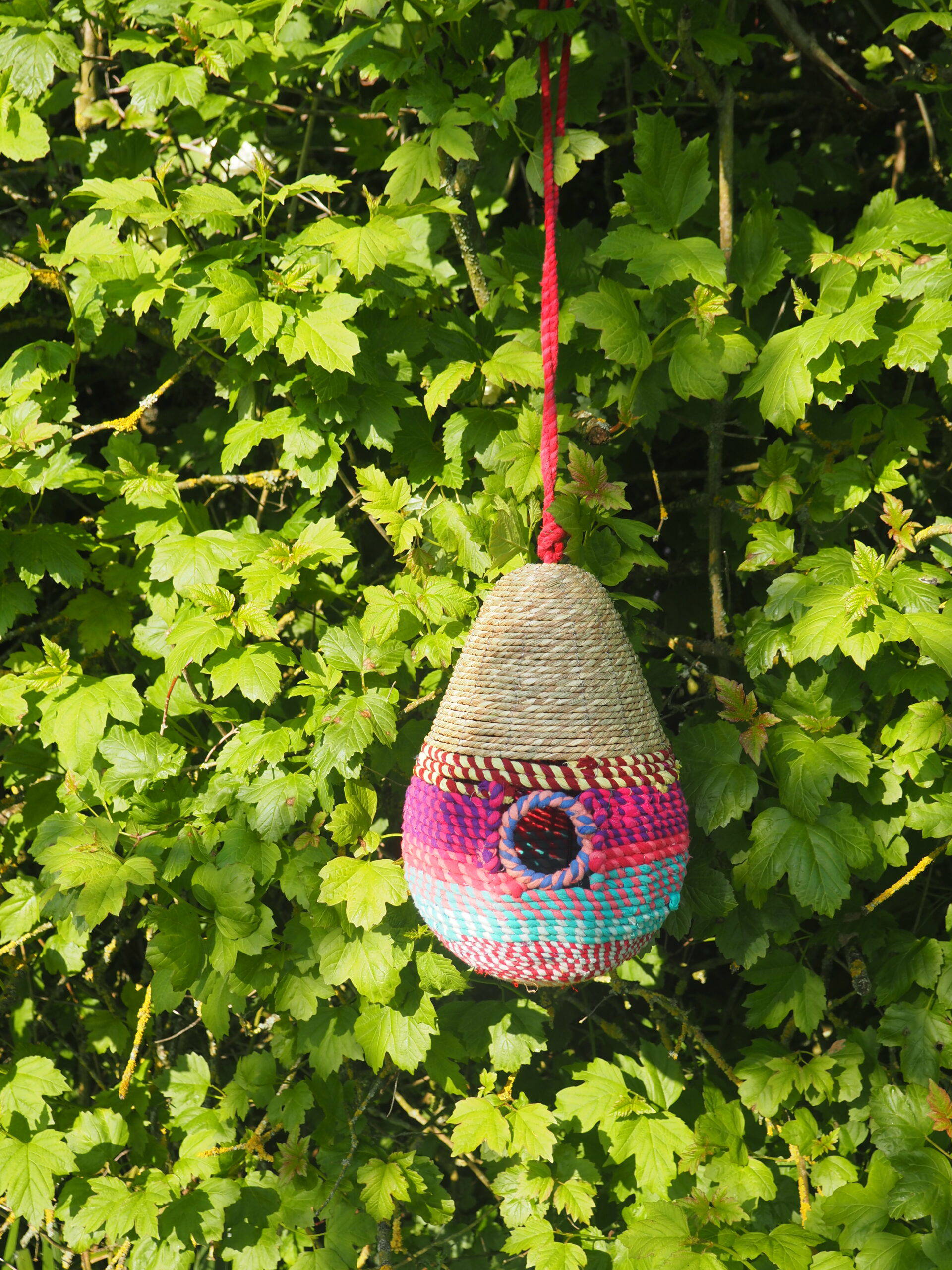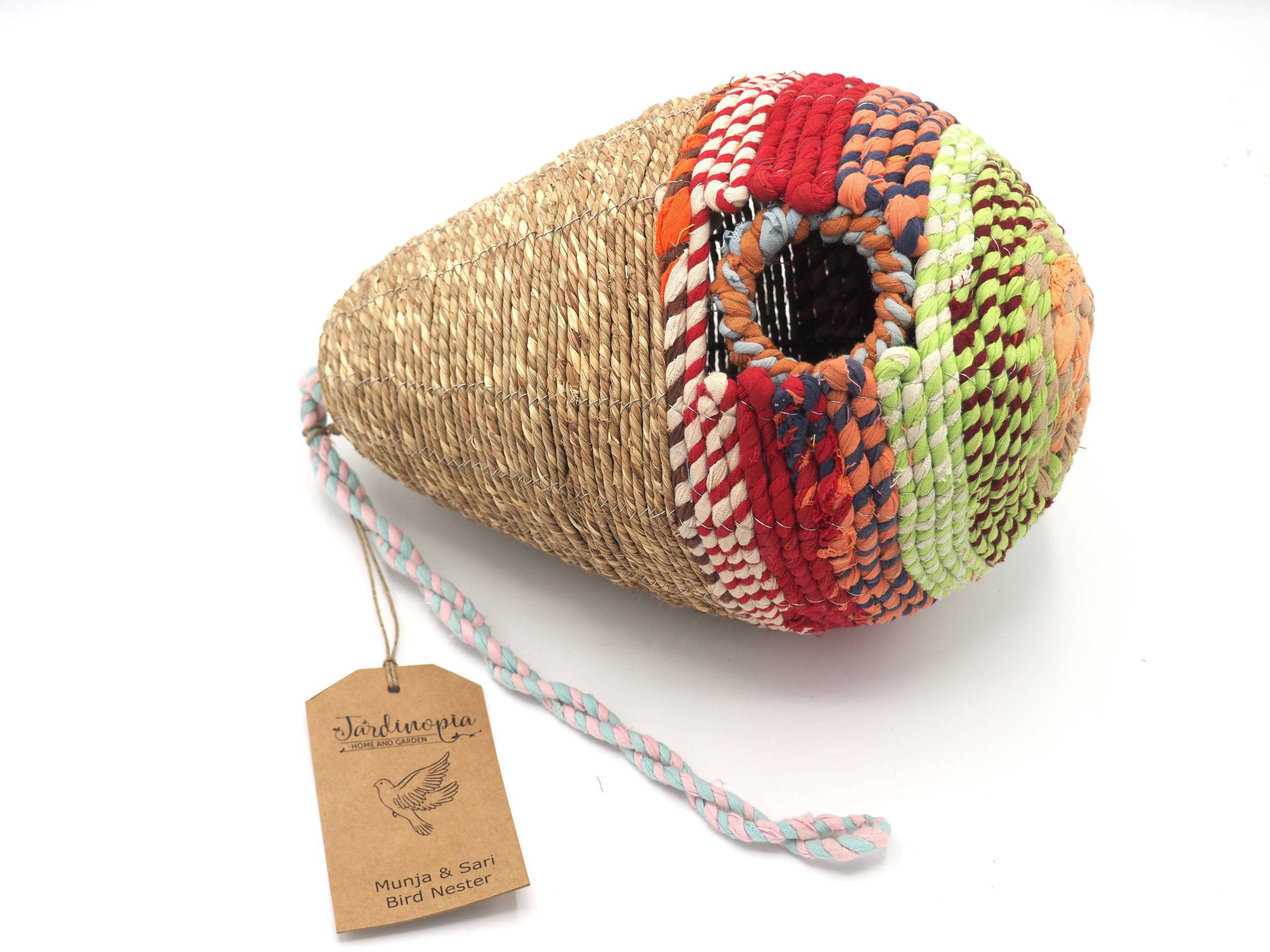 Our Fairtrade munja and sari bird nesters have been fashioned in India using reclaimed sari fabric from factory offcuts that has been gathered and washed, and then artfully crafted together with sustainably sourced munja – making these bird nesters a unique and environmentally friendly home for your garden birds. Each is supported by a strong metal frame and your bird nester has been designed to last outside in all weather. The entrance hole diameter has been custom measured to suit British small birds like tits and robins, whilst helping to keep larger predator birds out and frustrate squirrels. Each bird nester is unique and whilst the shape and size will be consistent, sari fabric colours will vary. Munja is a tough Asiatic grass (saccharum munja) whose tenacious culms are used for ropes, twine, and baskets, with great natural water repellant abilities. It is sustainably sourced from across India. Please use the photos as a guide only. Dimensions: Height 26 cm x Width 19 cm x Depth 19 cm. Please note fabric colours may vary. Images are representative only.