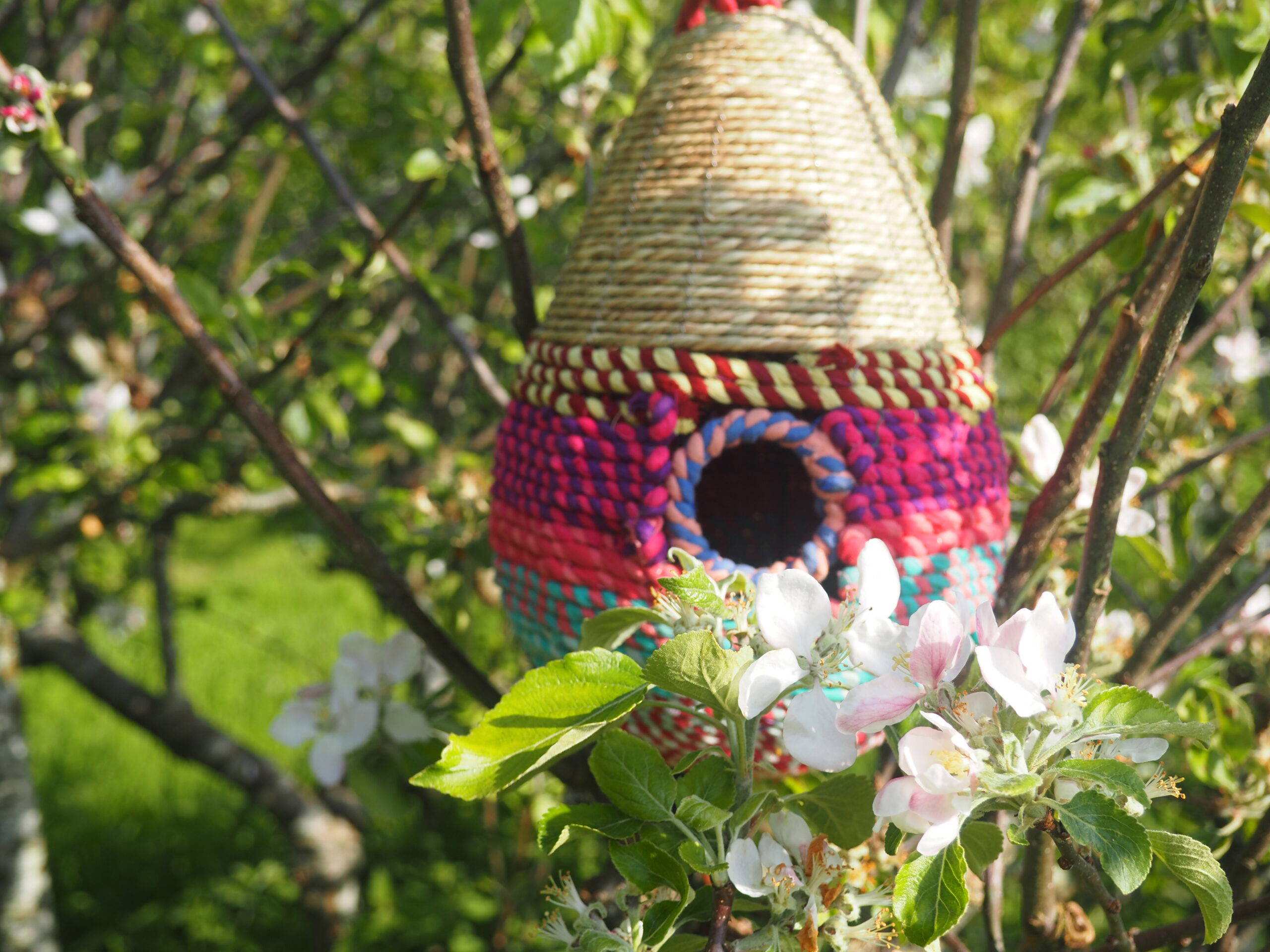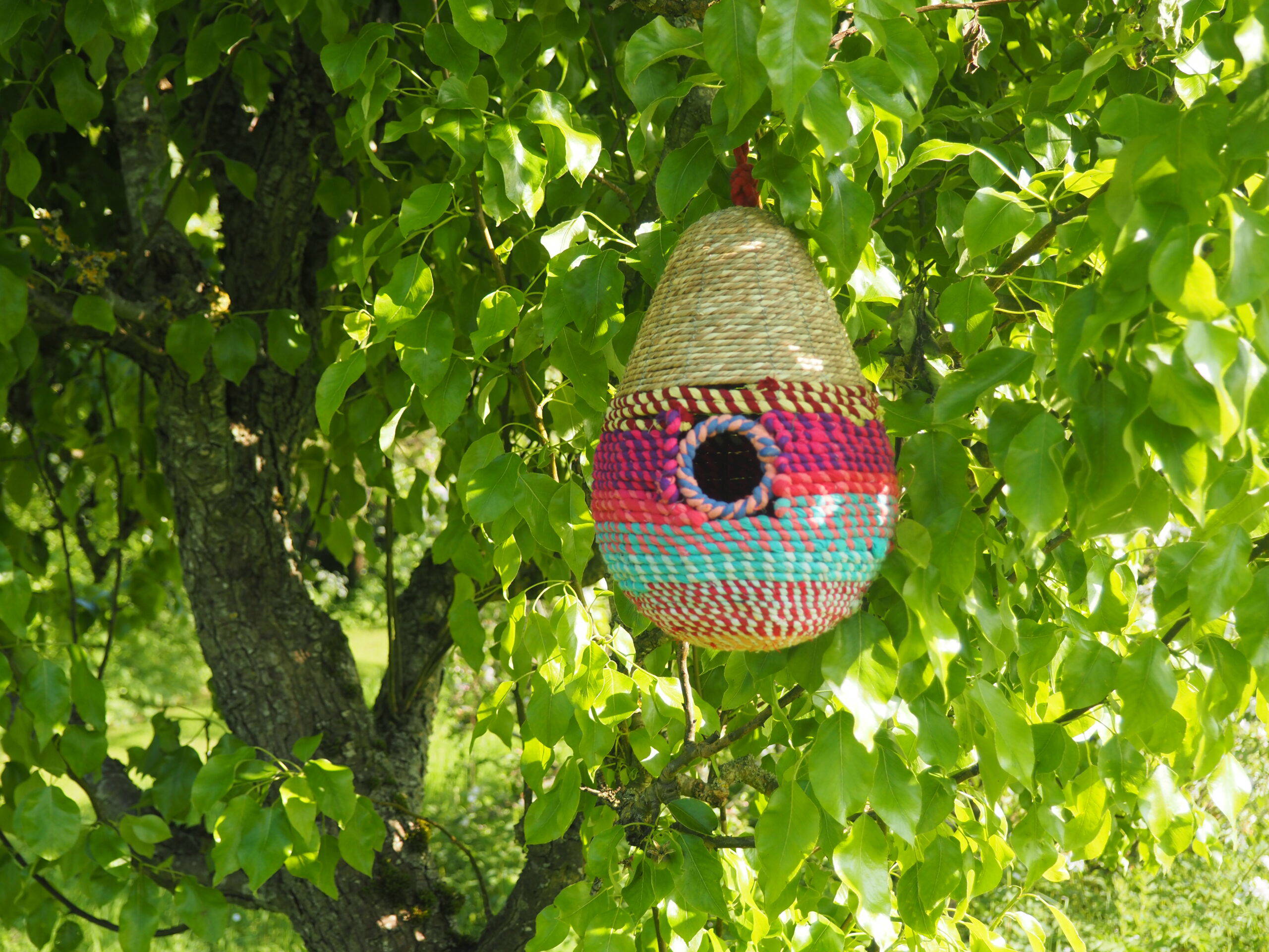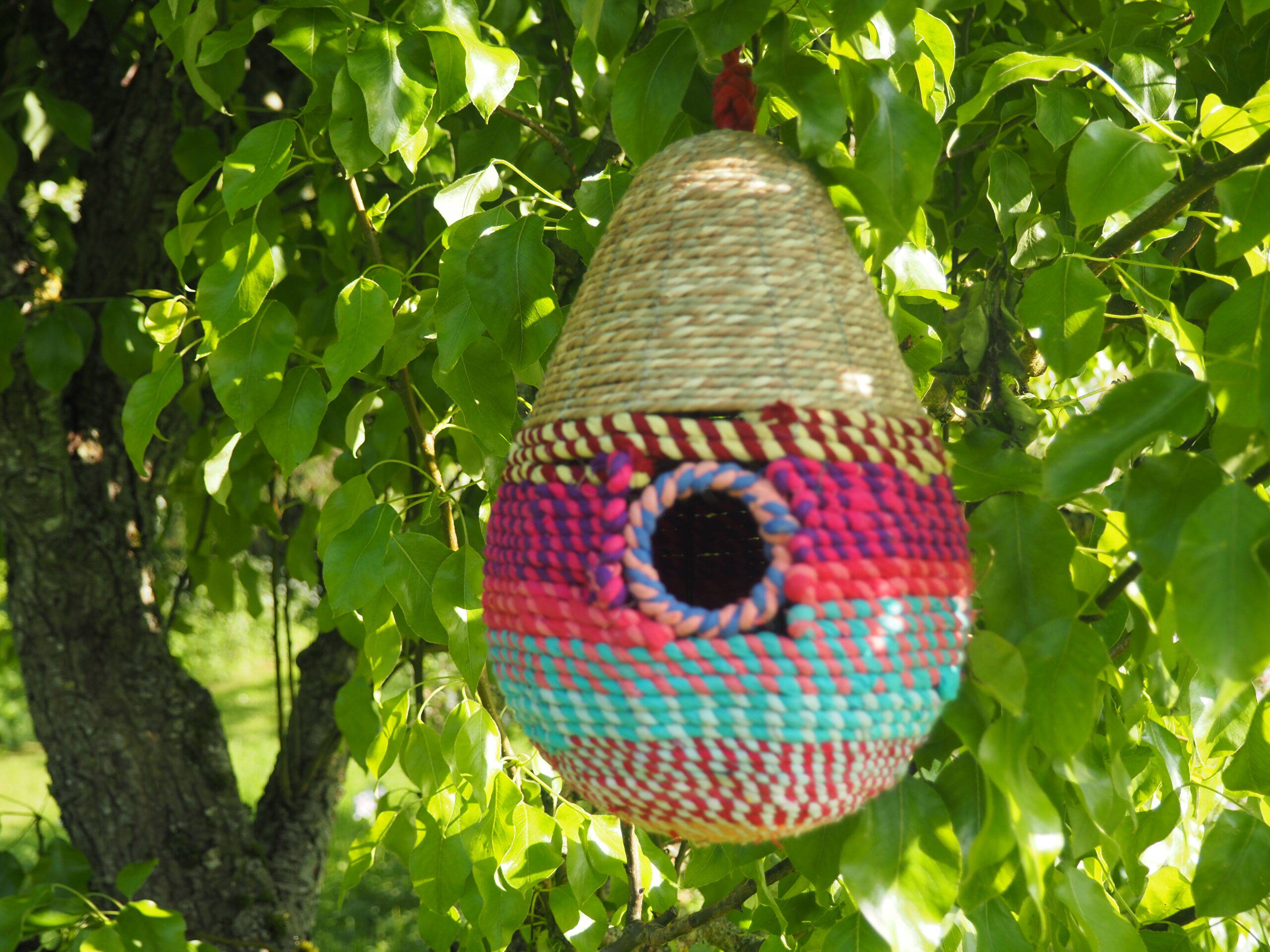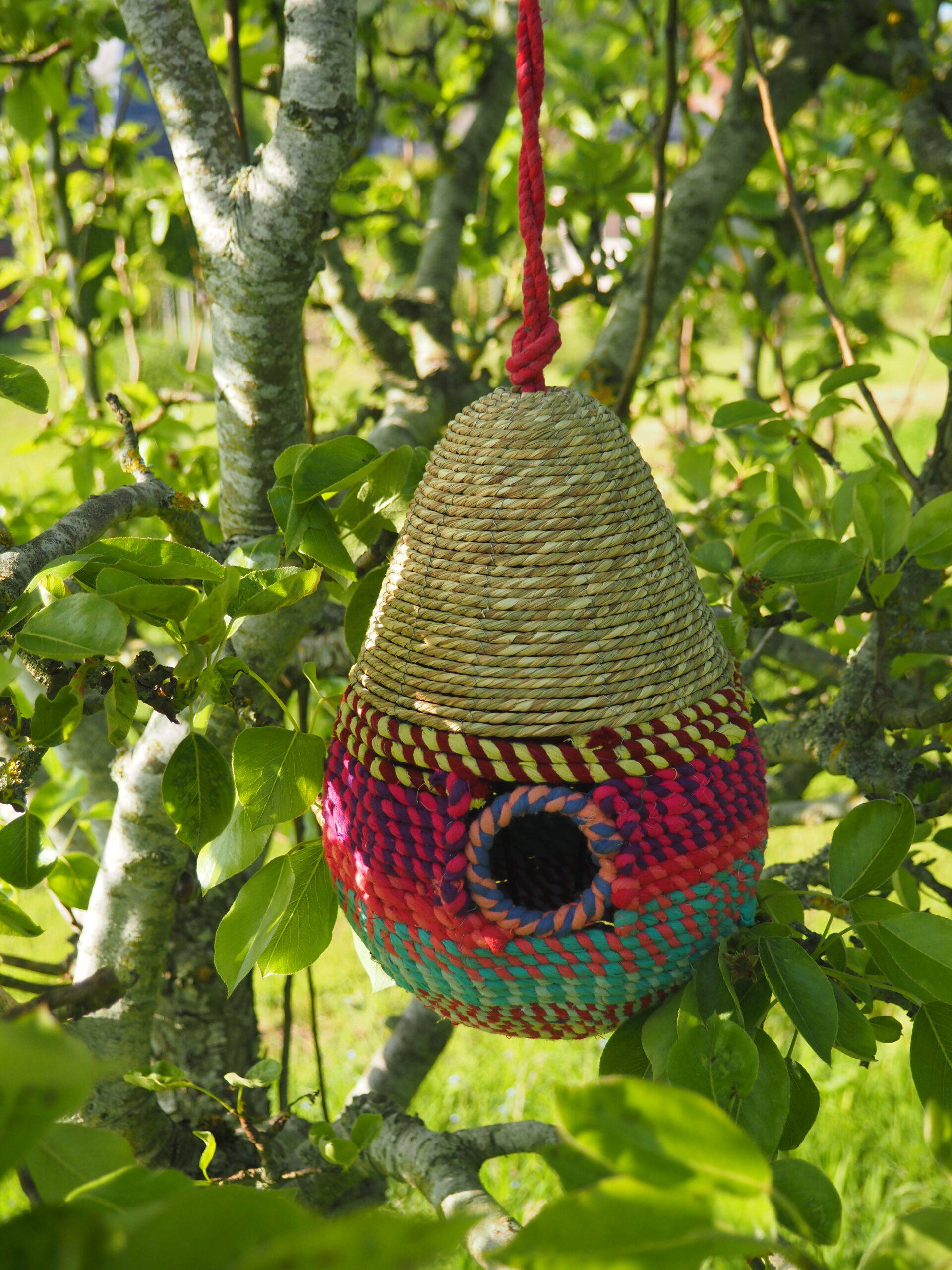 Our Fairtrade munja and sari bird nesters have been fashioned in India using reclaimed sari fabric from factory offcuts that has been gathered and washed, and then artfully crafted together with sustainably sourced munja – making these bird nesters a unique and environmentally friendly home for your garden birds. Each is supported by a strong metal frame and your bird nester has been designed to last outside in all weather. The entrance hole diameter has been custom measured to suit British small birds like tits and robins, whilst helping to keep larger predator birds out and frustrate squirrels. Each bird nester is unique and whilst the shape and size will be consistent, sari fabric colours will vary. Munja is a tough Asiatic grass (saccharum munja) whose tenacious culms are used for ropes, twine, and baskets, with great natural water repellant abilities. It is sustainably sourced from across India. Please use the photos as a guide only. Dimensions: Height 26 cm x Width 19 cm x Depth 19 cm. Please note fabric colours may vary. Images are representative only.