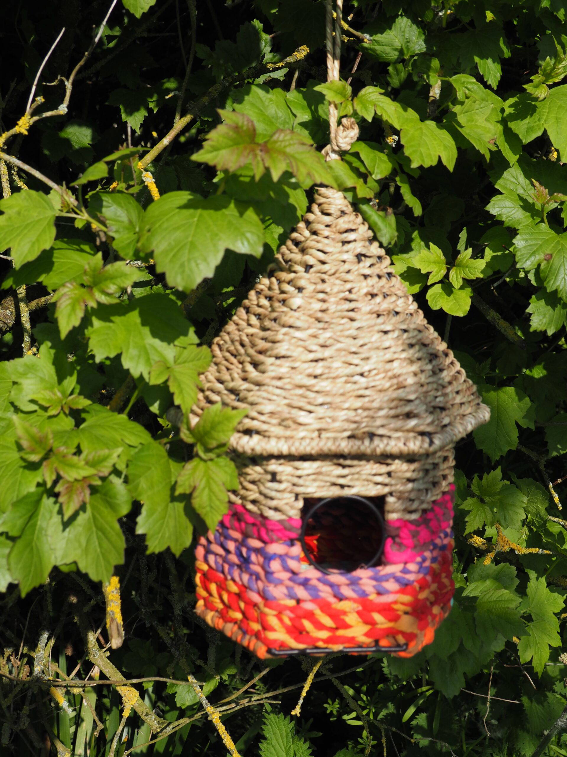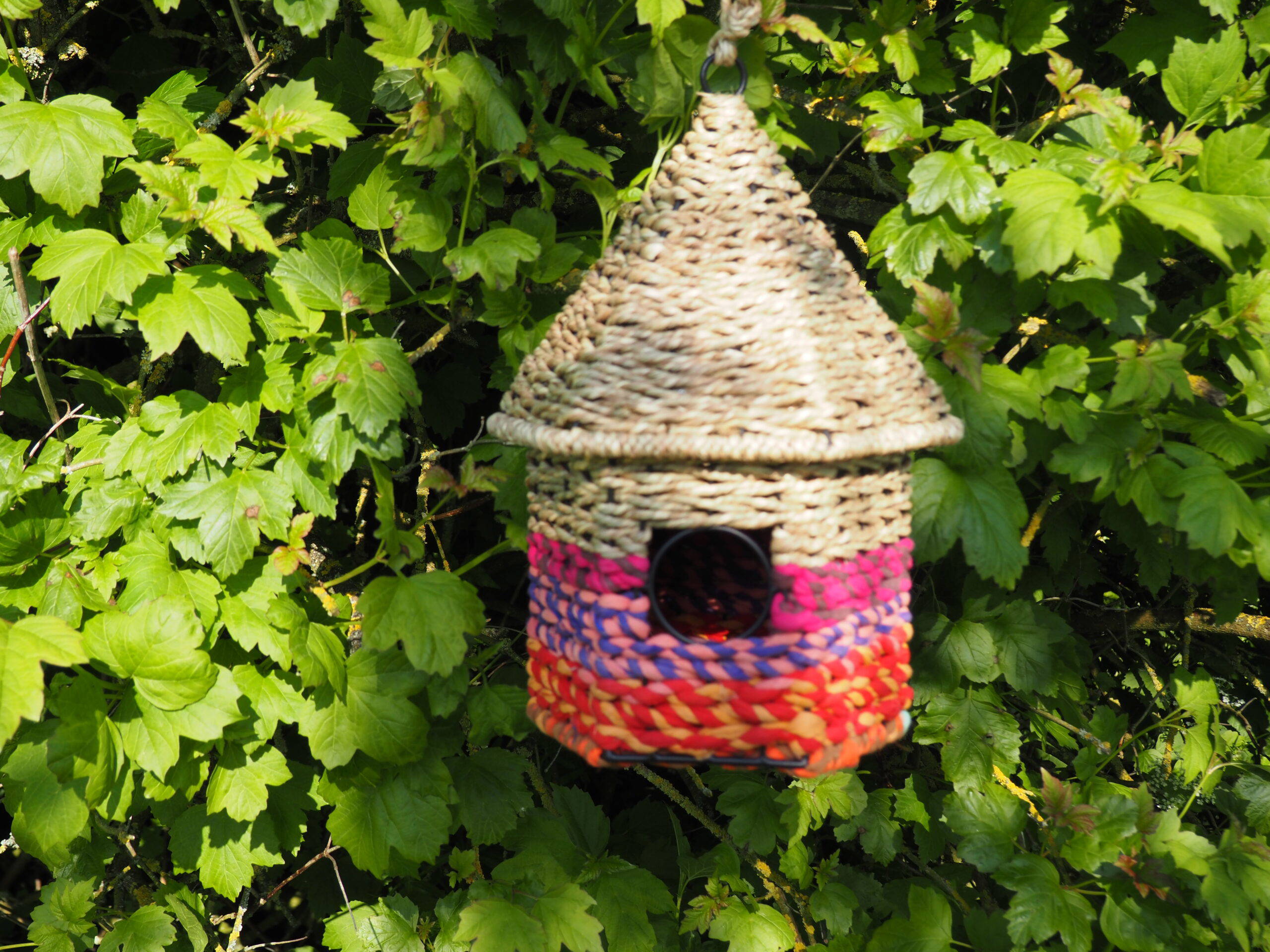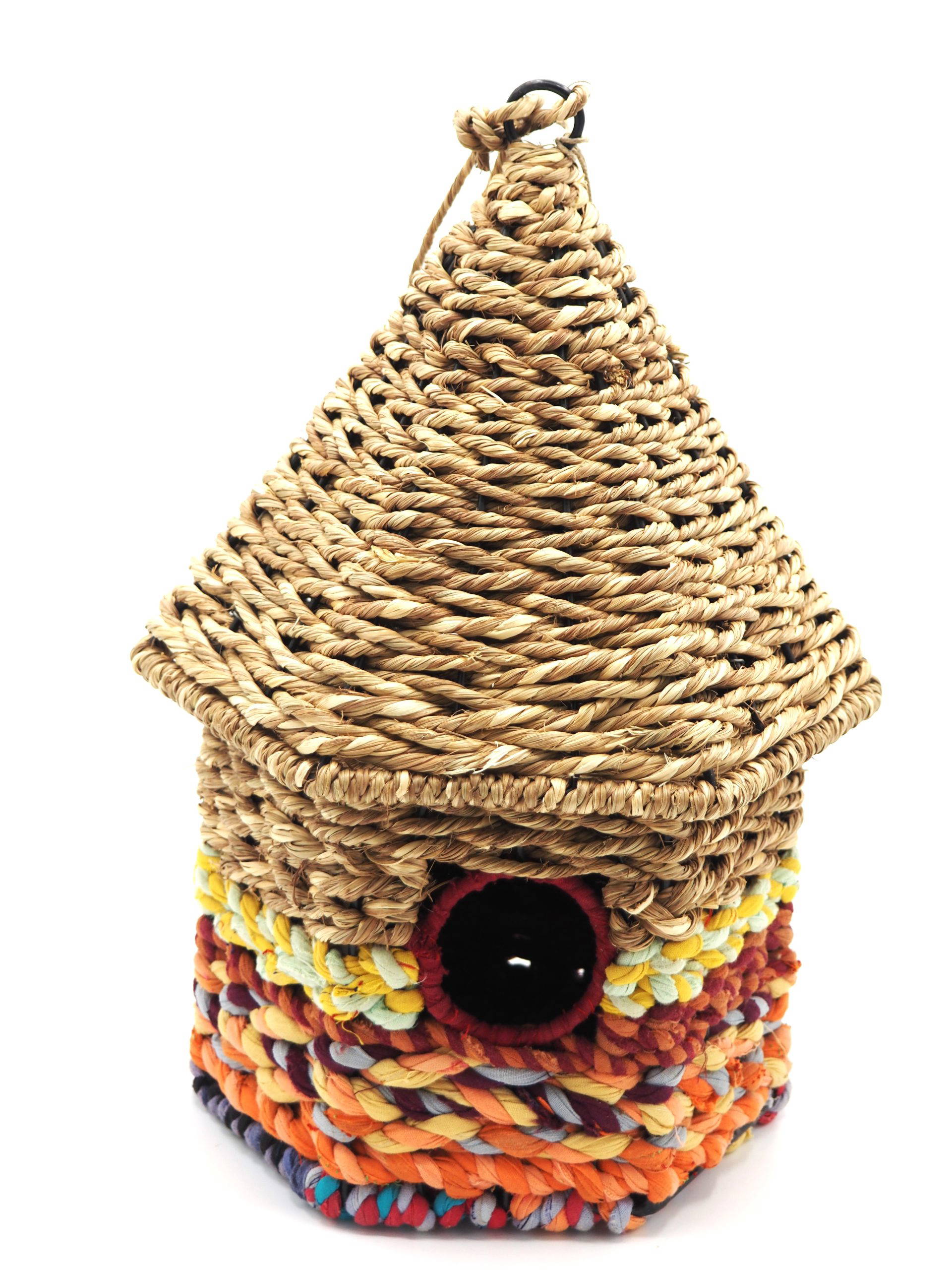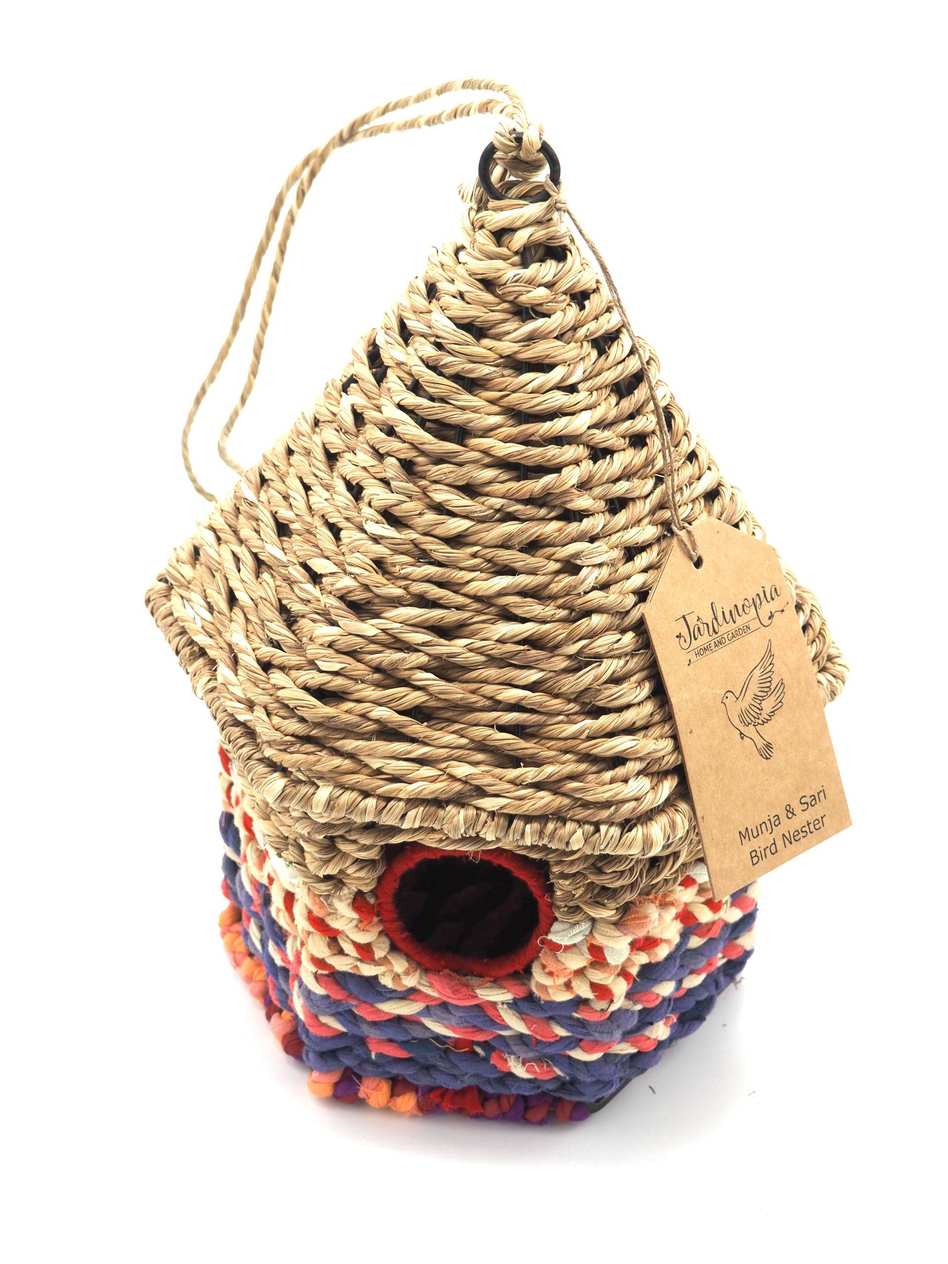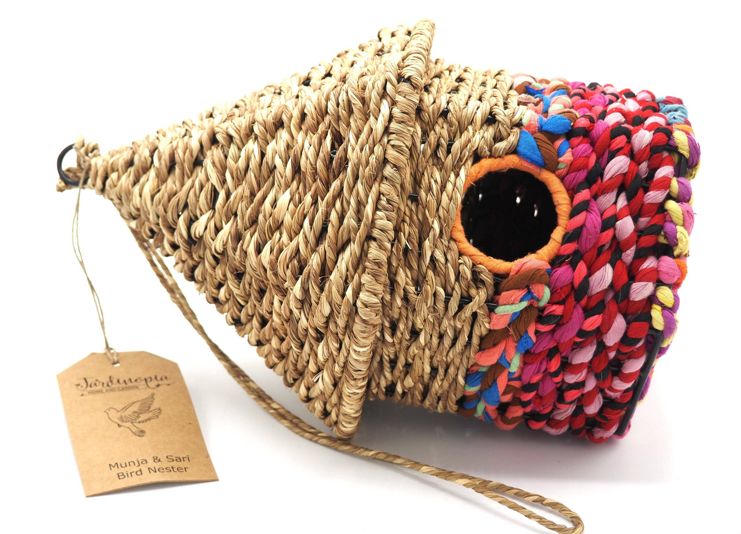 Our Fairtrade munja and sari bird nesters have been fashioned in India using reclaimed sari fabric from factory offcuts that has been gathered and washed, and then artfully crafted together with sustainably sourced munja – making these bird nesters a unique and environmentally friendly home for your garden birds. Each is supported by a strong metal frame and your bird nester has been designed to last outside in all weather. The entrance hole diameter has been custom measured to suit British small birds like tits and robins, whilst helping to keep larger predator birds out and frustrate squirrels. Each bird nester is unique and whilst the shape and size will be consistent, sari fabric colours will vary. Munja is a tough Asiatic grass (saccharum munja) whose tenacious culms are used for ropes, twine, and baskets, with great natural water repellant abilities. It is sustainably sourced from across India. Please use the photos as a guide only. Dimensions: Height 29 cm x Width 20 cm x Depth 18 cm. Please note fabric colours may vary. Images are representative only.