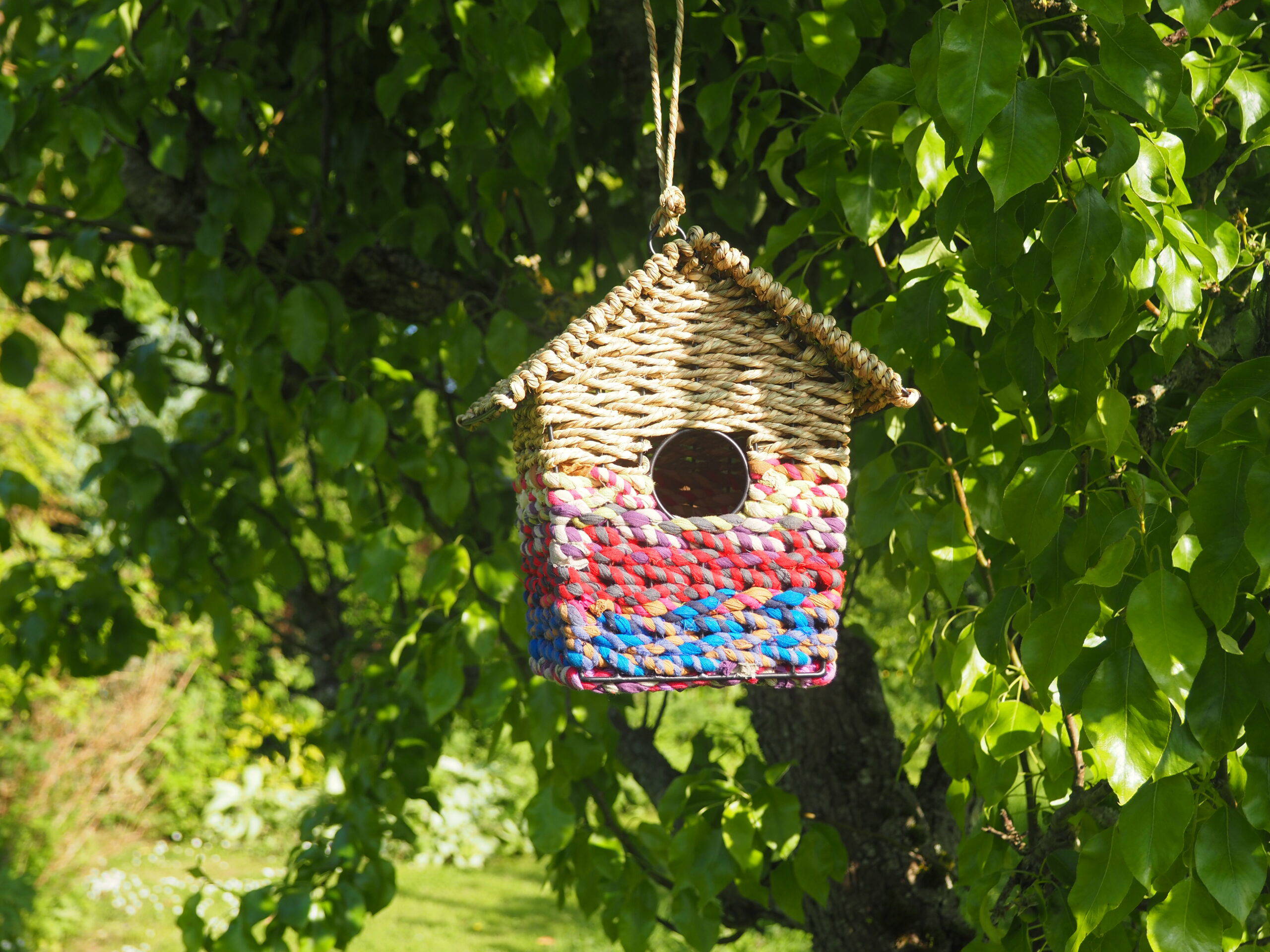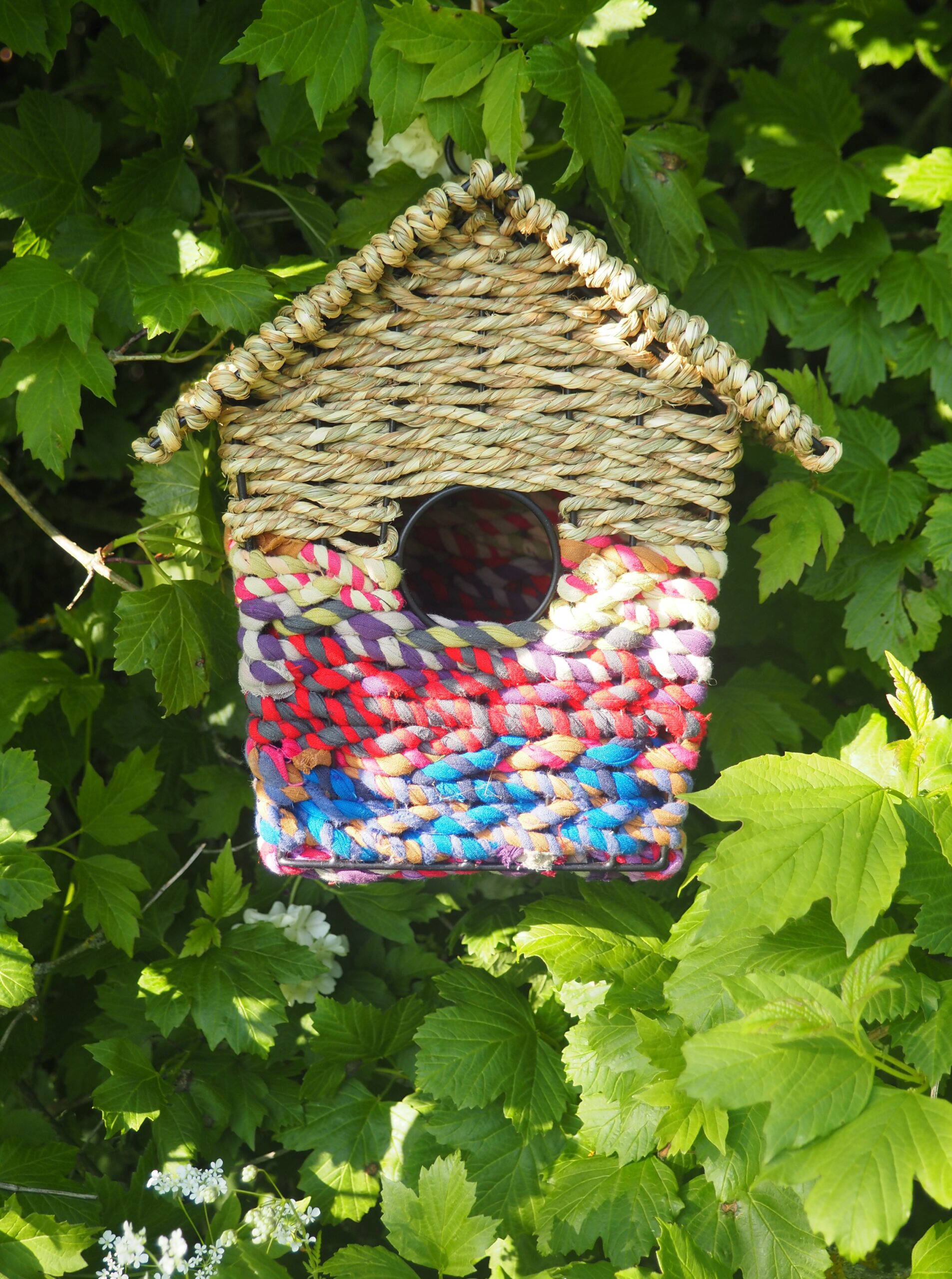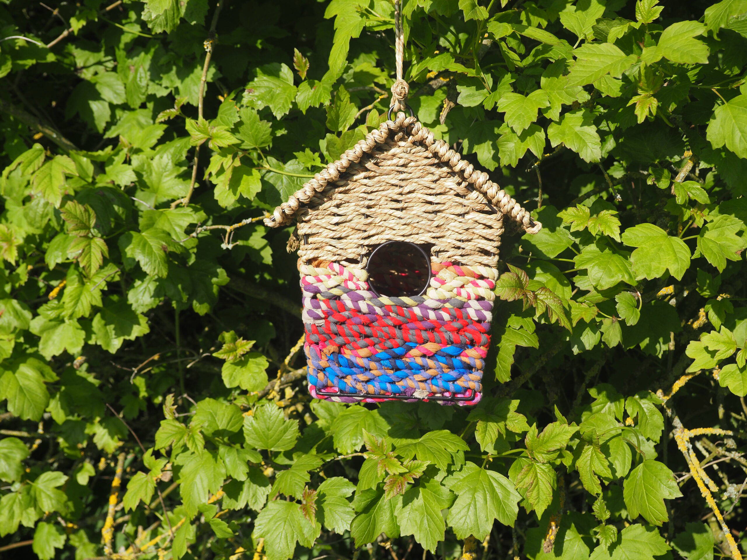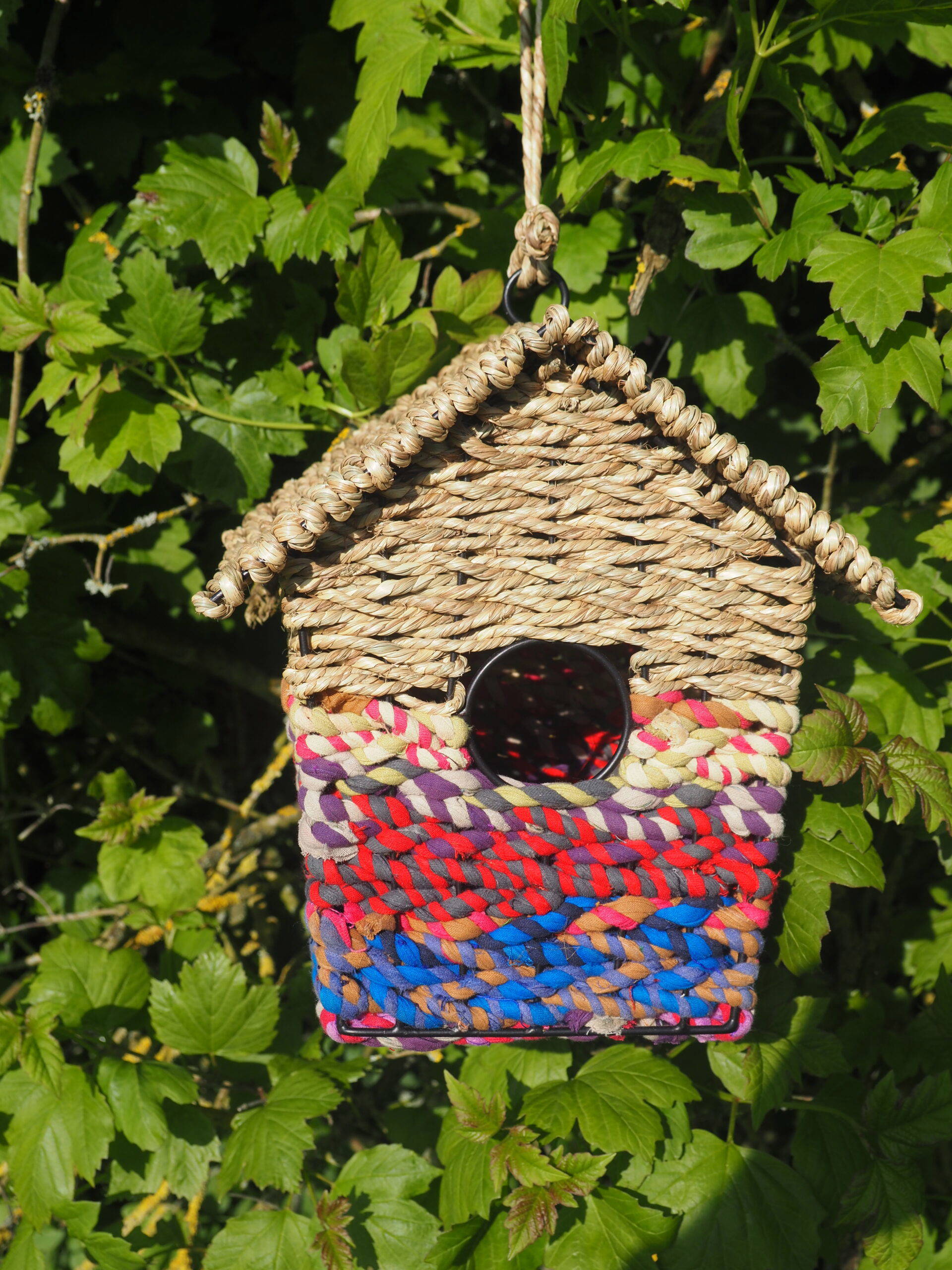 Our Fairtrade munja and sari bird nesters have been fashioned in India using reclaimed sari fabric from factory offcuts that has been gathered and washed, and then artfully crafted together with sustainably sourced munja – making these bird nesters a unique and environmentally friendly home for your garden birds. Each is supported by a strong metal frame and your bird nester has been designed to last outside in all weather. The entrance hole diameter has been custom measured to suit British small birds like tits and robins, whilst helping to keep larger predator birds out and frustrate squirrels. Each bird nester is unique and whilst the shape and size will be consistent, sari fabric colours will vary. Munja is a tough Asiatic grass (saccharum munja) whose tenacious culms are used for ropes, twine, and baskets, with great natural water repellant abilities. It is sustainably sourced from across India. Please use the photos as a guide only. Dimensions: Height 24 cm x Width 20 cm x Depth 17 cm. Please note fabric colours may vary. Images are representative only.