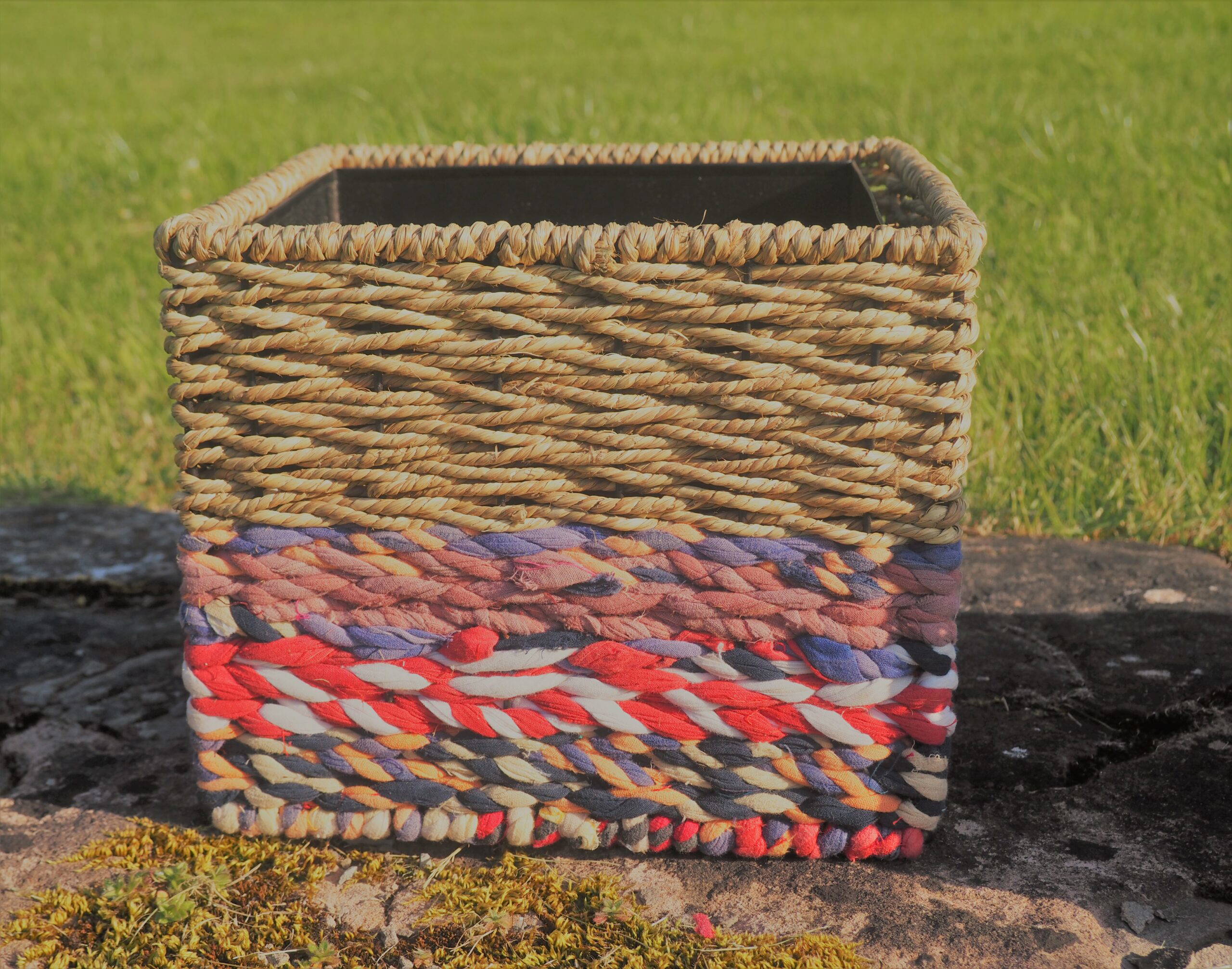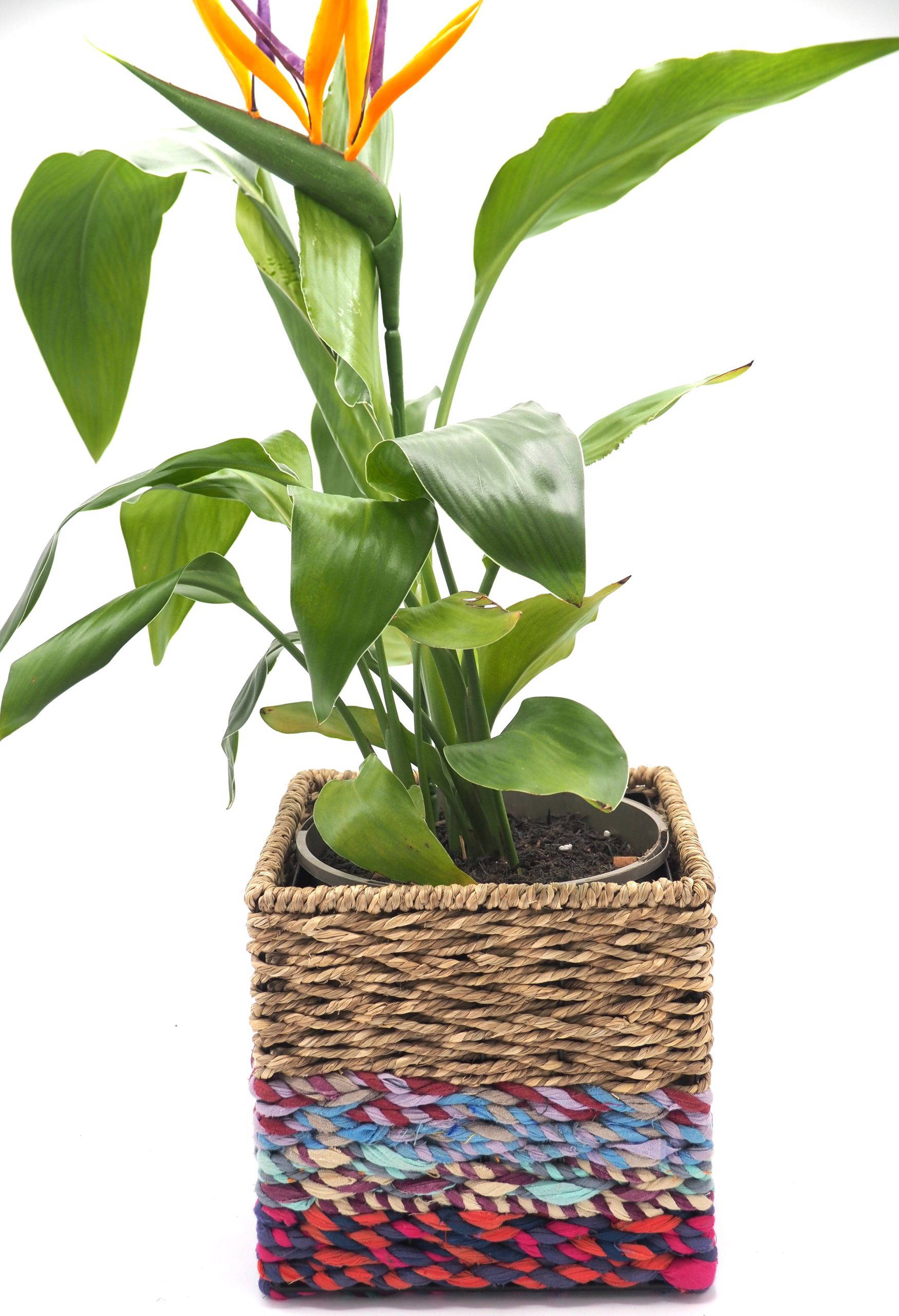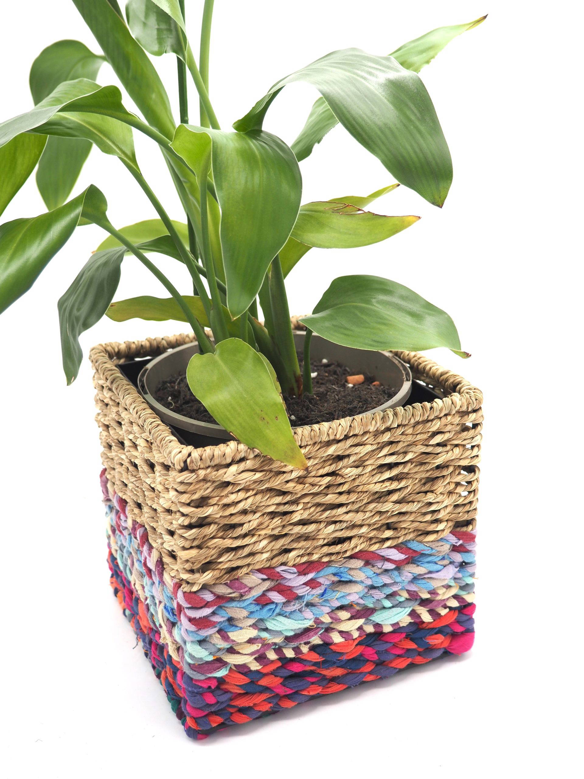 Our Fairtrade munja and sari planters have been fashioned in India using reclaimed sari fabric from factory offcuts that has been gathered and washed, and then artfully crafted together with sustainably sourced munja – making these planters a unique and environmentally friendly alternative to plastic. Munja is a tough Asiatic grass (saccharum munja) whose tenacious culms are used for ropes, twine, and baskets, with great natural water repellant abilities. It is sustainably sourced from across India. Each planter comes with a strong and watertight powder coated metal liner, so you can plant with confidence straight in to the planter, or allow pots to drain in to them when watered. Our planters can be safely used indoors or outside, and can be nested inside each other for easy storage when not in use. Each planter is unique and whilst the shape and size will be consistent, sari fabric colours will vary. Please use the photos as a guide only. Dimensions: Height 17 cm x Width 20 cm x Depth 20 cm. Please note fabric colours may vary. Images are representative only.