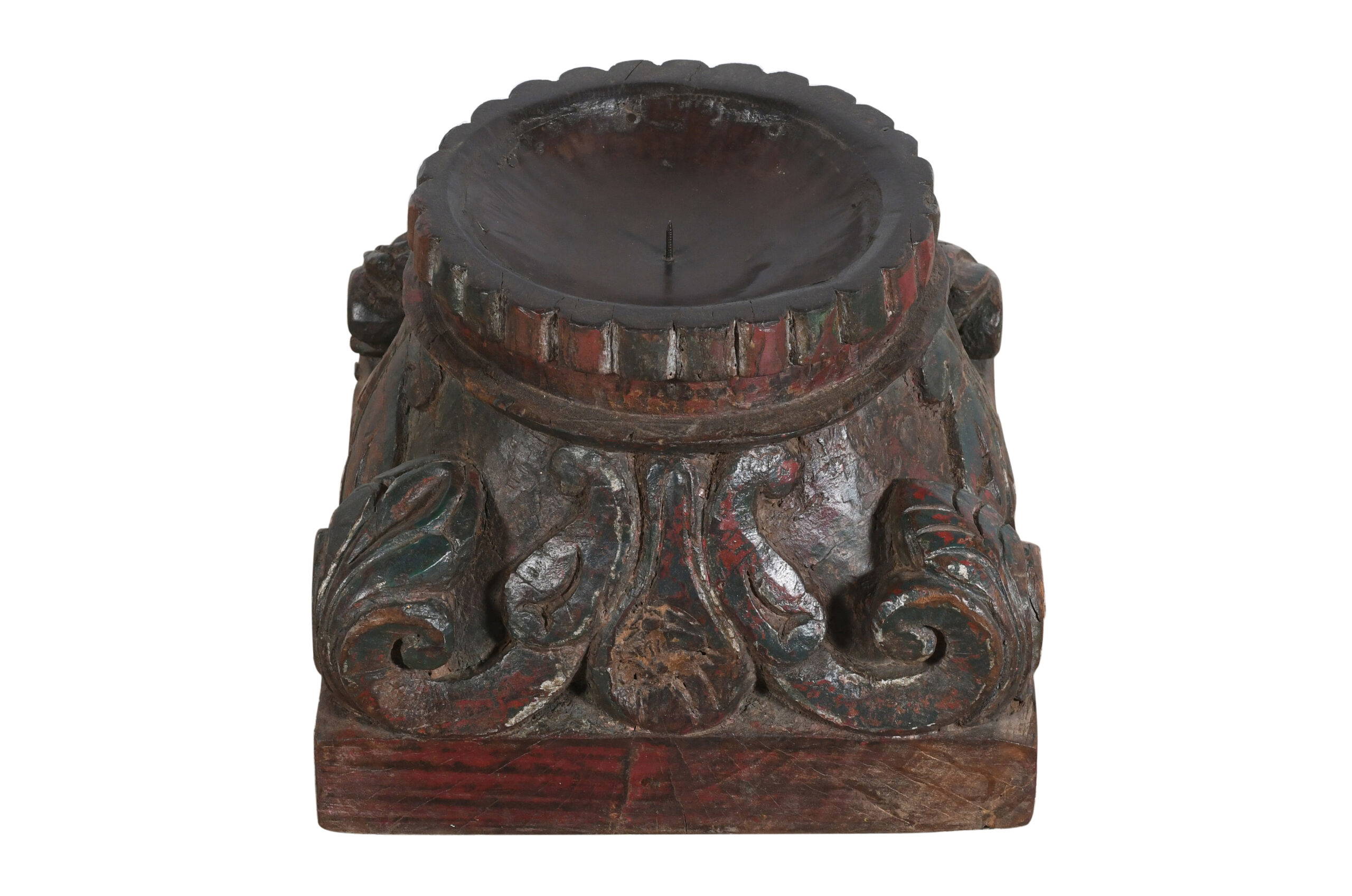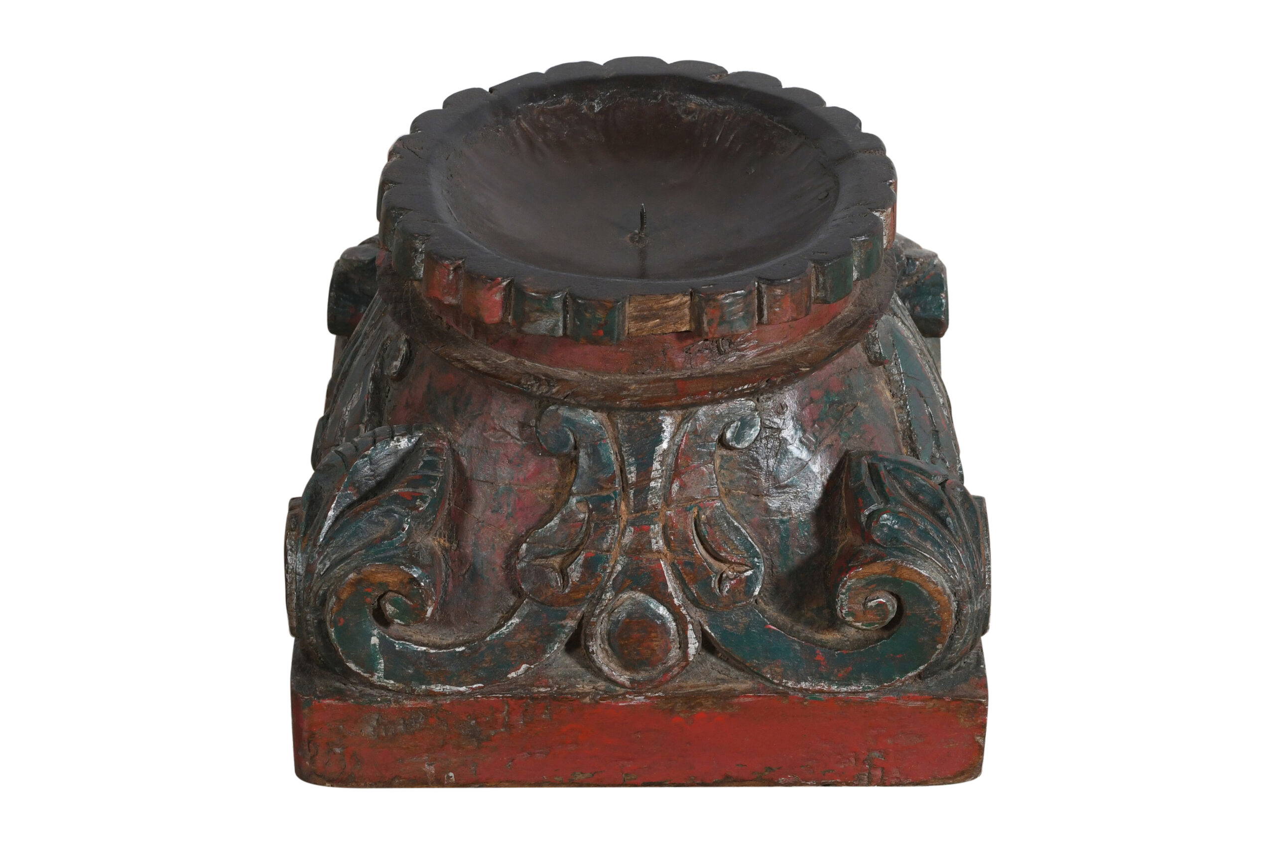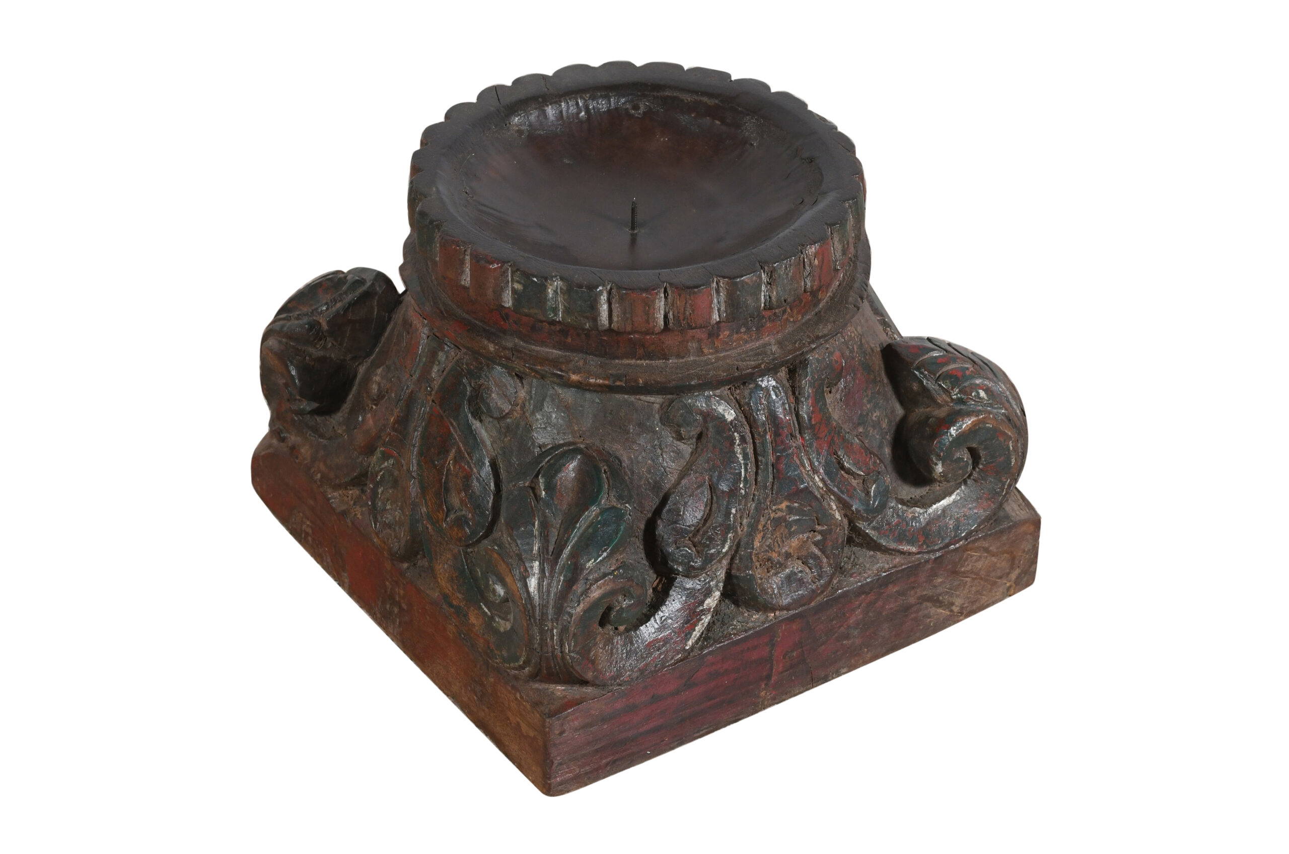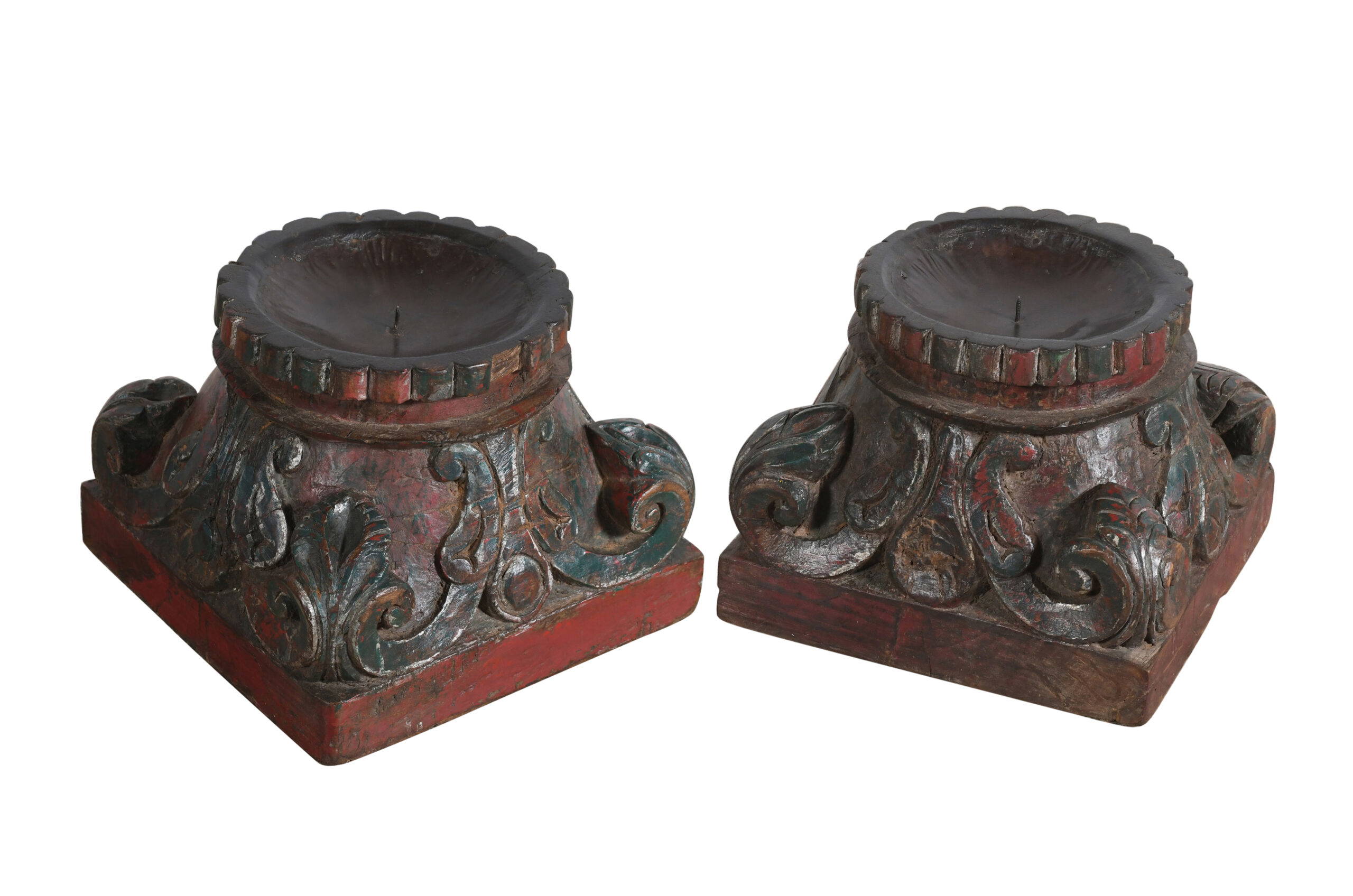Our antique Indian teak wood pillar base candle holders are all totally unique and date from the eighteenth – nineteenth century. We have added a rustic iron candle holder to the middle to make them functional. Each is intricately carved, usually from one piece of solid teak wood, and often come with much of the original paint in situ, as this wonderful Pair do. Our bases are salvaged from old buildings in Gujarat State and Rajasthan and saved for future generations! In a previous life they would have supported the tops and bottoms of teak columns that stood outside grand houses in eighteenth and nineteenth century India. Usually with beautiful ornate hand carvings all over them and lots of wonderful paint with a fine patina, each Candle Base is an entirely’unique antique! They look great as a centerpiece of the sideboard, dining table, fire hearth or the kitchen table, and would be the perfect character addition to a period property or even to add character to a new style home. These column bases are saved from buildings in India which have fallen into a state of disrepair and are no longer rescuable. These antique pillar bases are clearly very old pieces and there are some historic repairs and age related marks and wear and tear as you would expect.’ Dimensions: Length 30 x Width 30 x Height 23cm