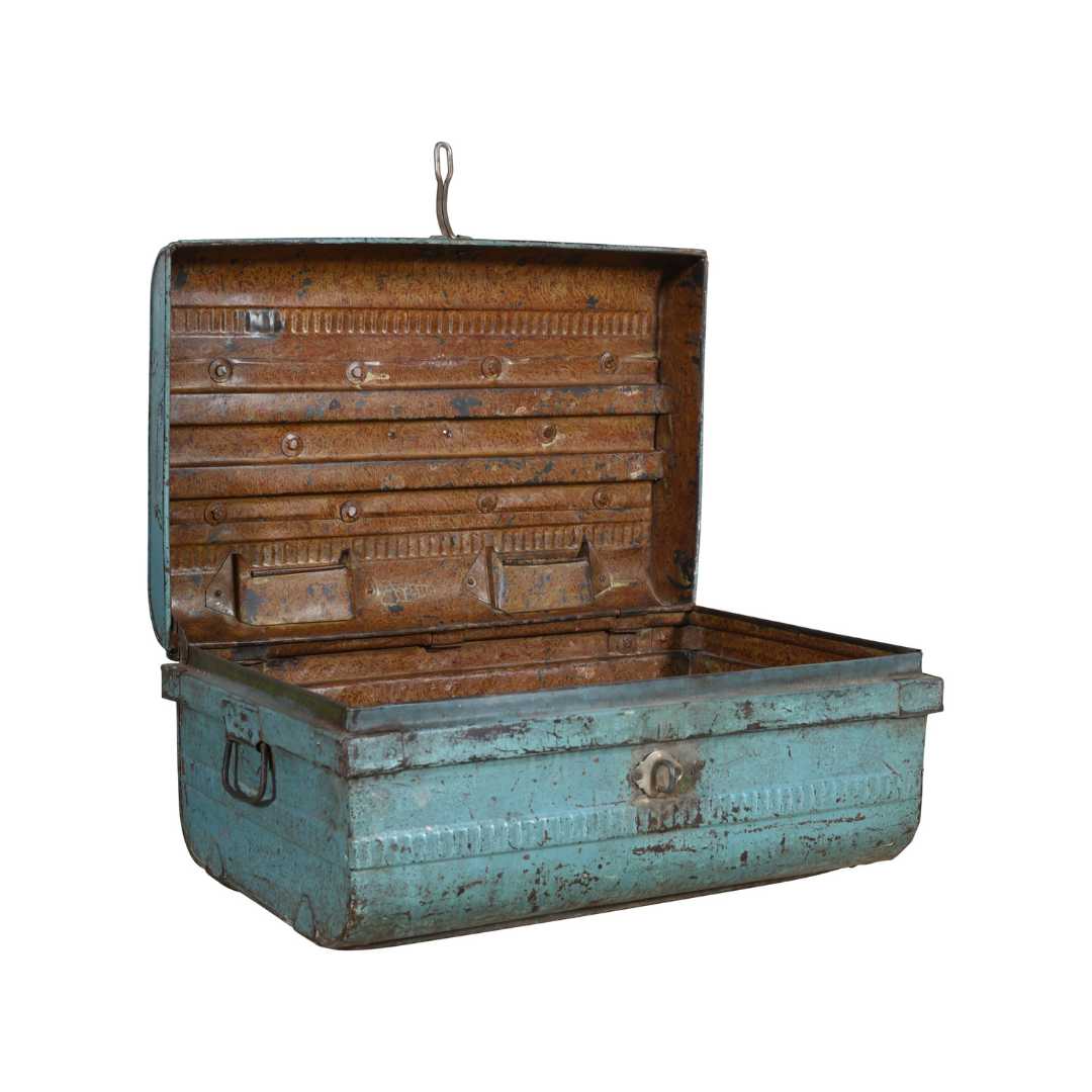 Add a touch of authentic Indian heritage to your home with this vintage teal blue iron train trunk, dating from the 1930s. Carefully hand-painted in a distinctive teal blue, this trunk features a naturally aged patina with rustic brown interior, original hardware, and robust iron construction. Once a mainstay across the Indian railway network, trunks like this were painted in vivid colours for easy identification and secure storage during travel.