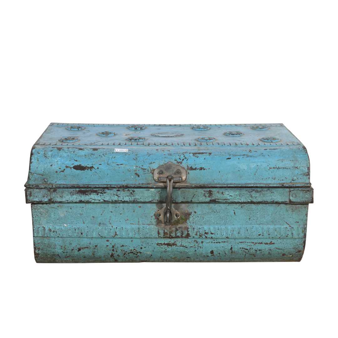 Each trunk is unique, showing authentic wear, aged teal blue paint, and original metalwork. Every item in our collection is personally sourced by a member of Jardinopia in Rajasthan, India, ensuring genuine provenance and character.